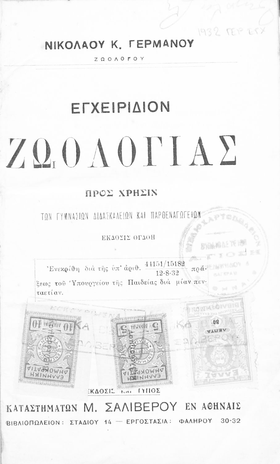 Τίτλος: Εγχειρίδιον Ζωολογίας προς χρήσιν των μαθητών της Γ΄ των Γυμνασίων, Διδασκαλείων και Παρθεναγωγείων