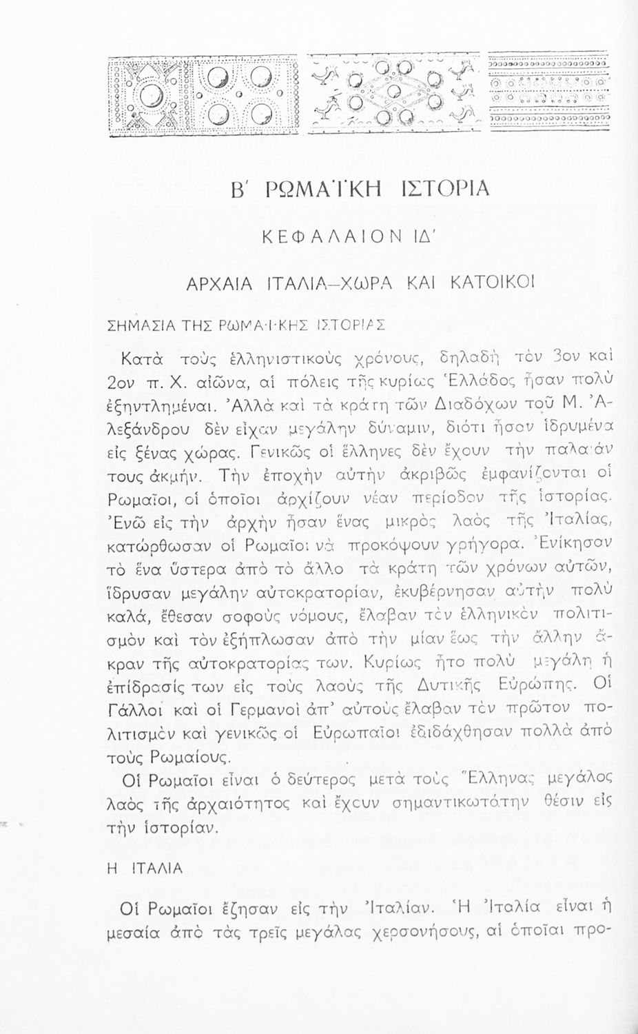 Σχολικό εγχειρίδιο Ιστορίας Β΄ Γυμνασίου που καλύπτει την περίοδο από την κτίση της Ρώμης ως την κτίση της Κωνσταντινούπολης. Περιέχει και χρονολογικό πίνακα γεγονότων.