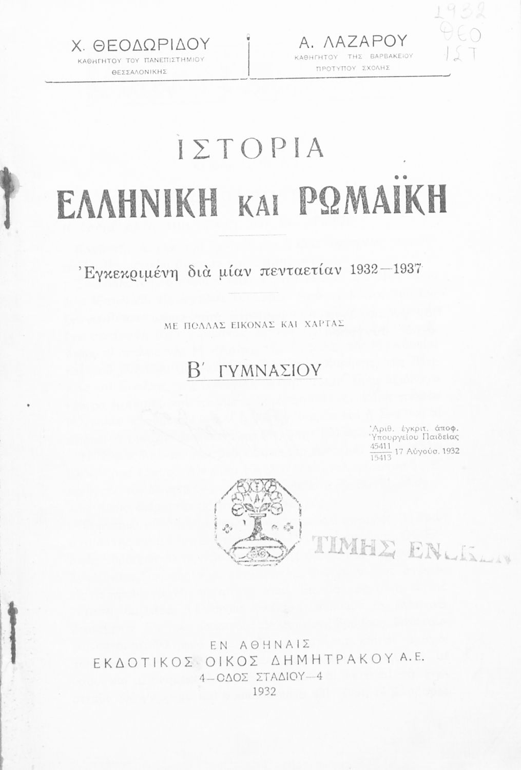 Κωδικός αναγνώρισης: 02-01479 Τίτλος: Ιστορία Ελληνική και Ρωμαϊκή Β΄ Γυμνασίου Συγγραφέας: Χ. Θεοδωρίδης, Α. Λαζάρου Μέγεθος και υπόστρωμα: Σχολικό εγχειρίδιο, μαλακό εξώφυλλο, 262 σελίδες. Εικόνες (ασπρόμαυρες), σκίτσα (ασπρόμαυρα), χάρτες (ασπρόμαυροι). |