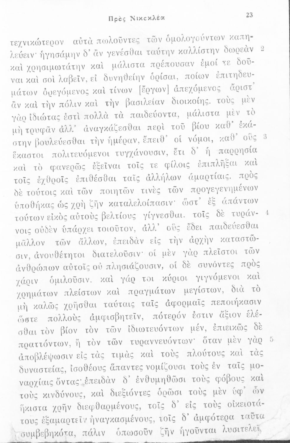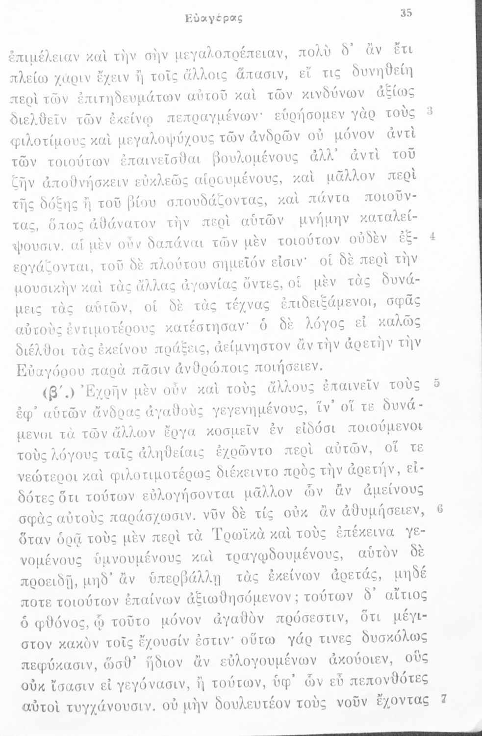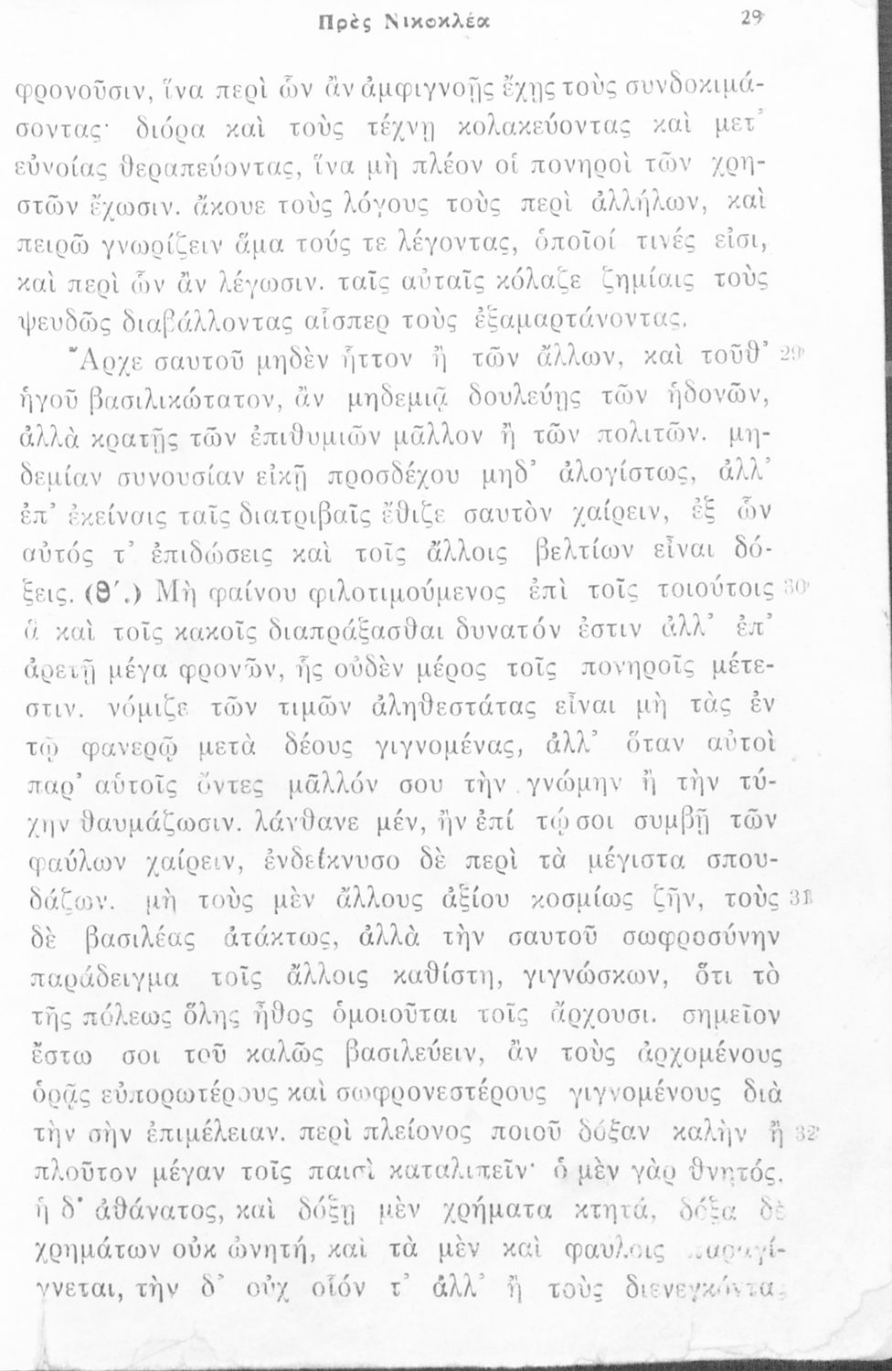 Μαθητικό βοήθημα Αρχαίων Ελληνικών Ε' Γυμνασίου που περιλαμβάνει μετάφραση των Λόγων του Ισοκράτη Προς Δημόνικον, Προς Νικοκλέα και Ευαγόρας, ερμηνευτικά, γραμματικά και συντακτικά σχόλια.