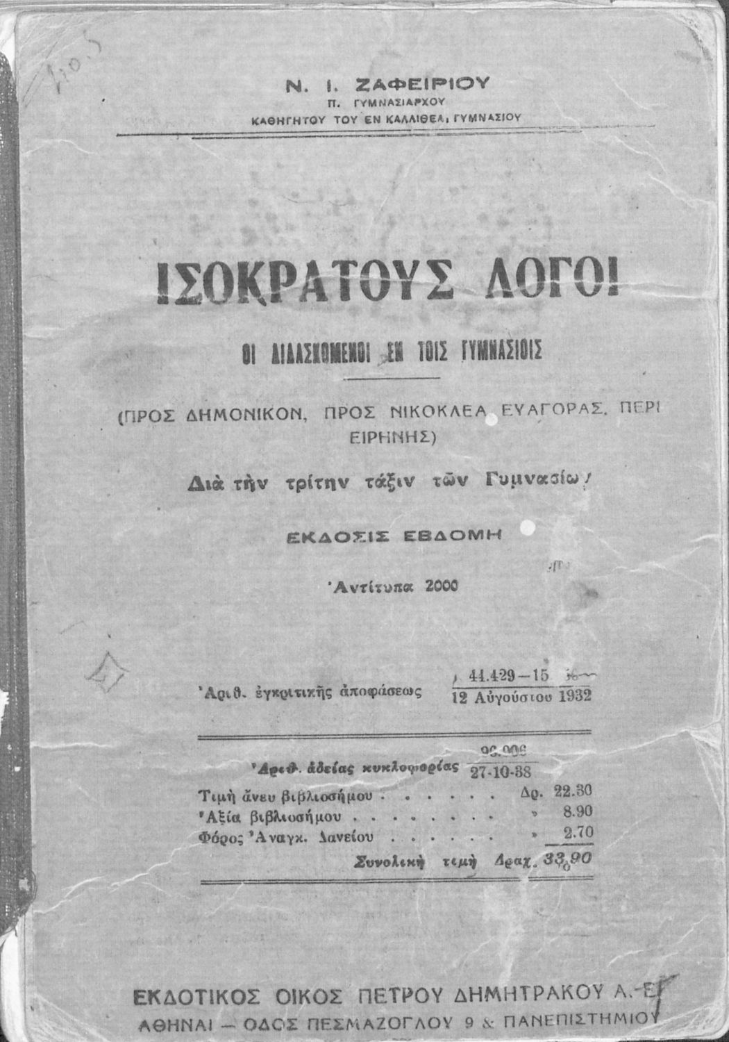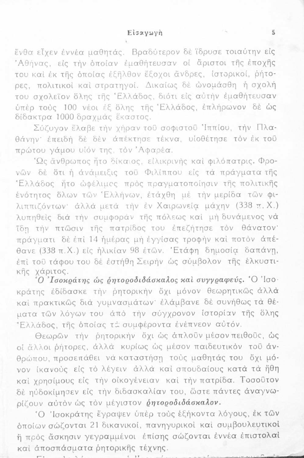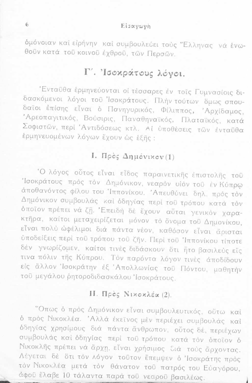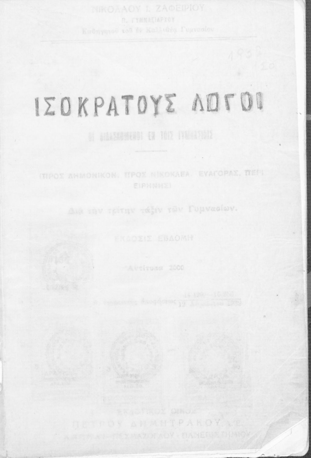 Σχολικό εγχειρίδιο Αρχαίων Ελληνικών Γ΄ Γυμνασίου που περιλαμβάνει εισαγωγή στη ζωή και το έργο του Ισοκράτη,τους Λόγους του Προς Δημόνικον, Προς Νικοκλέα, Περί ειρήνης και Ευαγόρας, και ερμηνευτικές σημειώσεις.