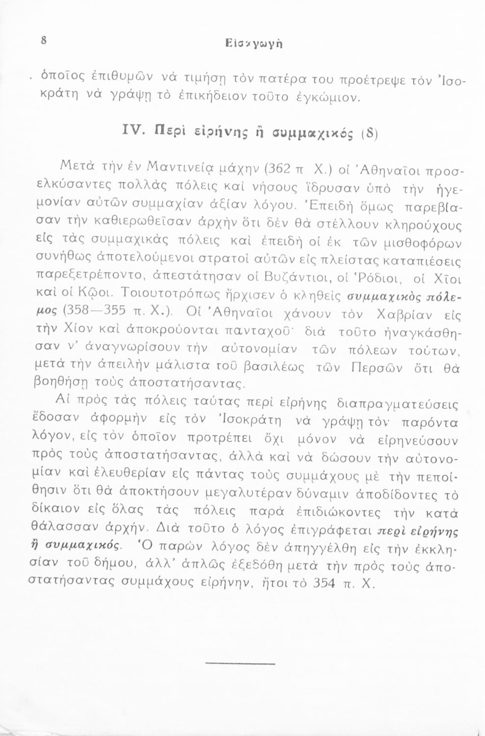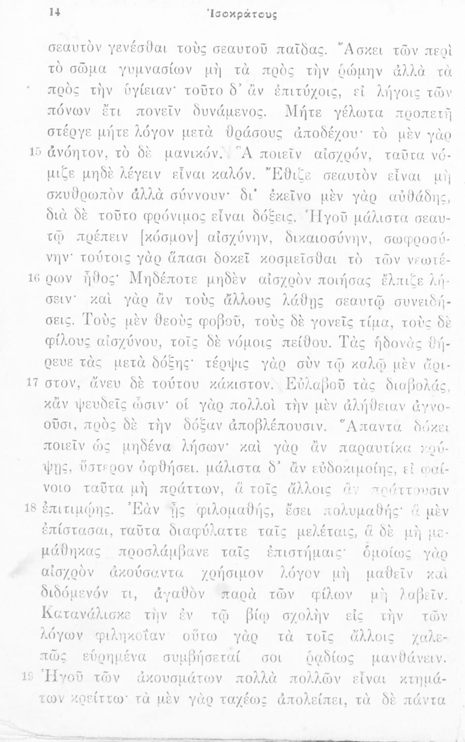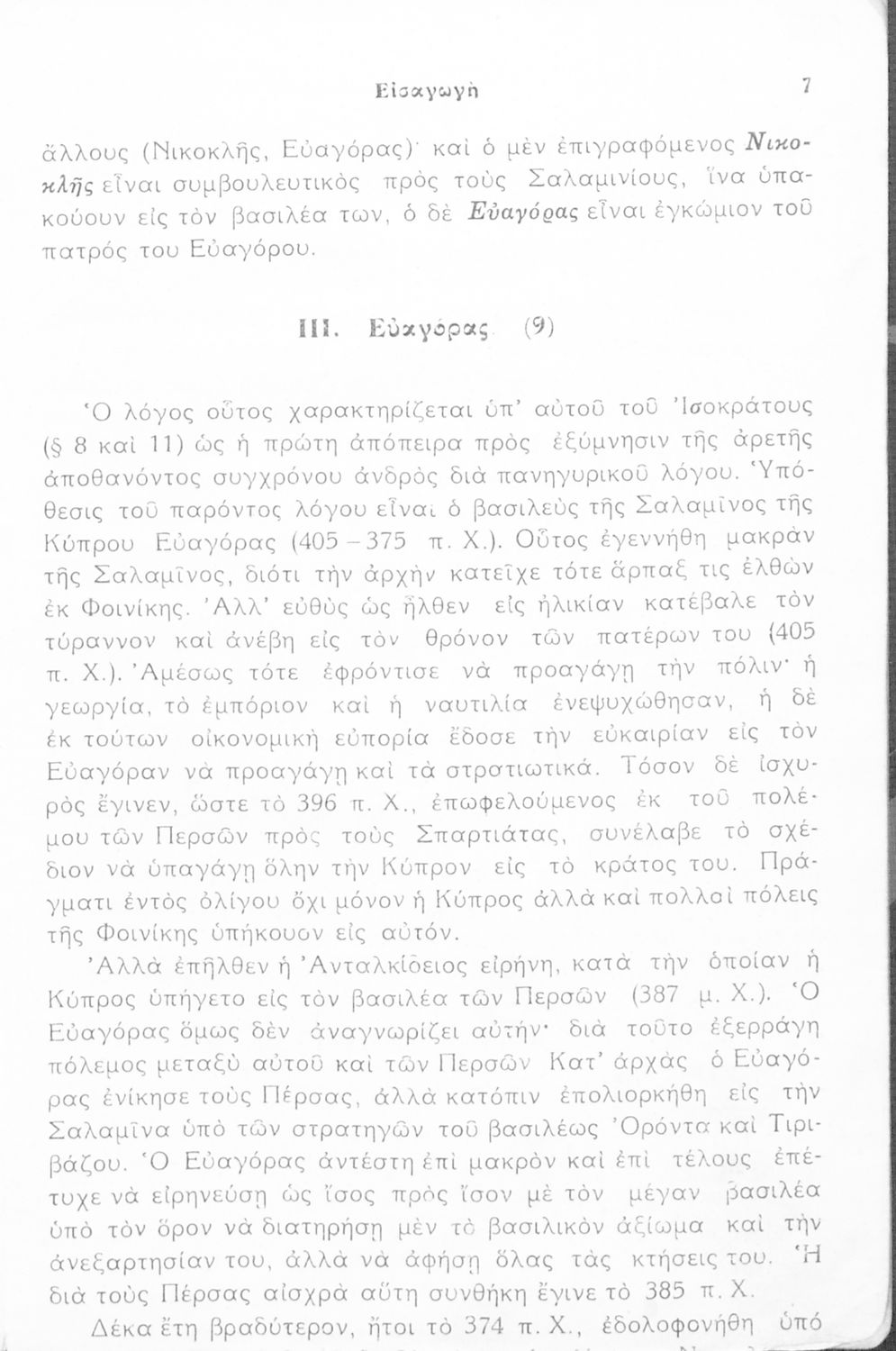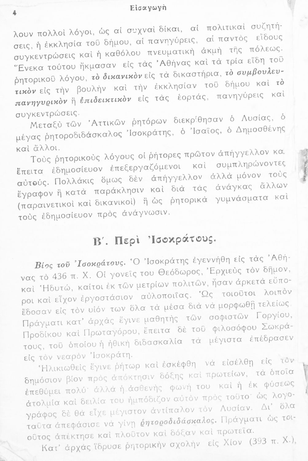 Σχολικό εγχειρίδιο Αρχαίων Ελληνικών Γ΄ Γυμνασίου που περιλαμβάνει εισαγωγή στη ζωή και το έργο του Ισοκράτη,τους Λόγους του Προς Δημόνικον, Προς Νικοκλέα, Περί ειρήνης και Ευαγόρας, και ερμηνευτικές σημειώσεις.