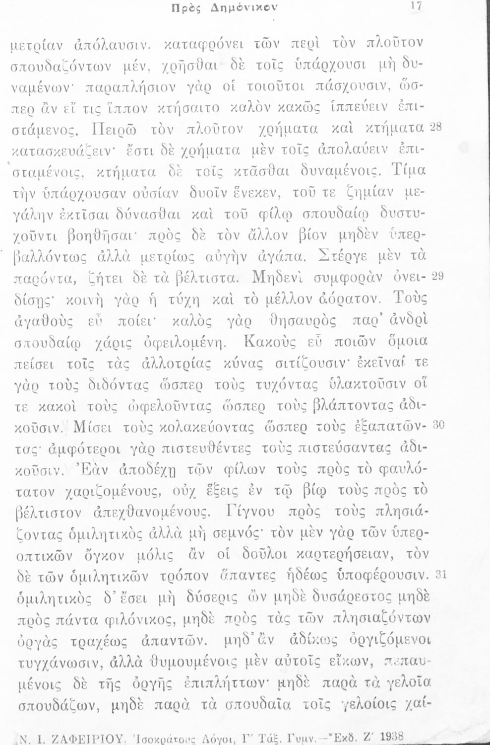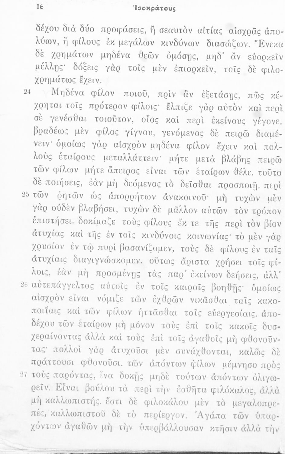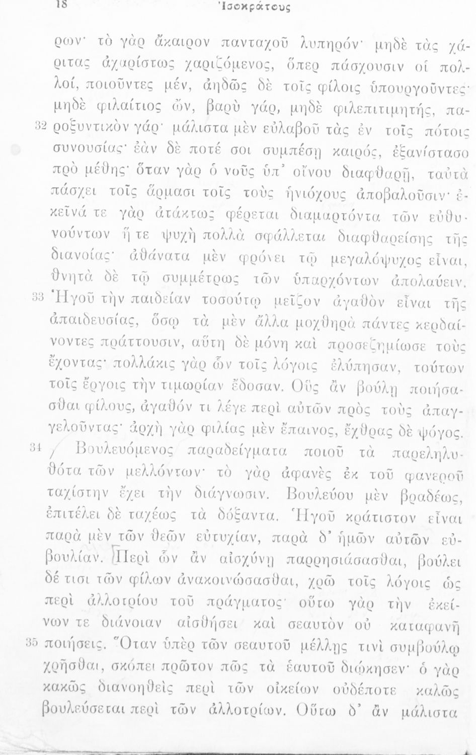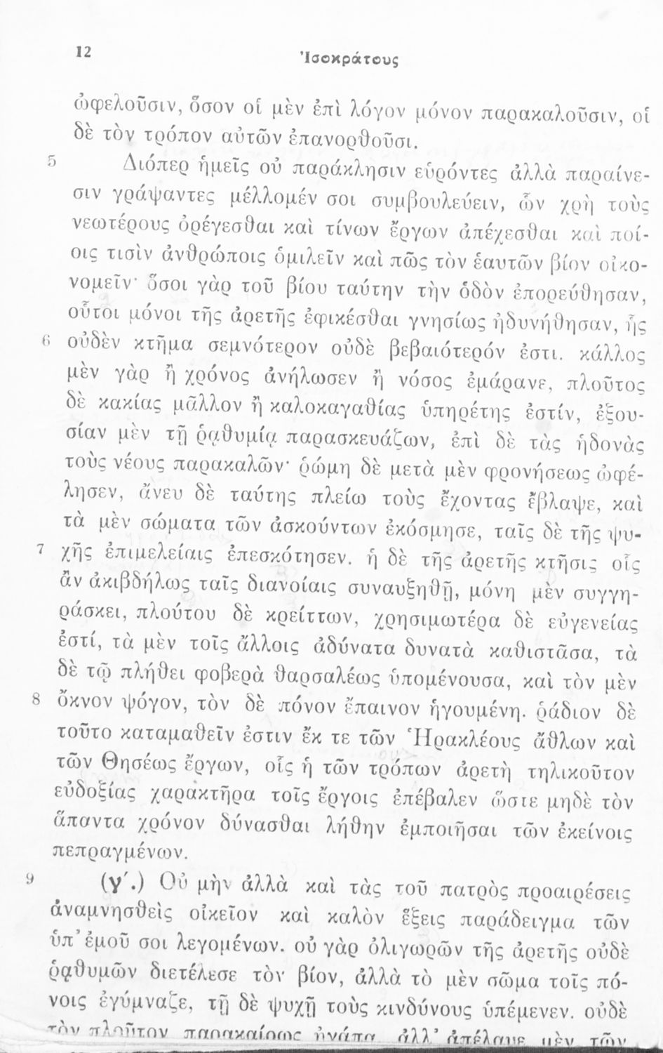Σχολικό εγχειρίδιο Αρχαίων Ελληνικών Γ΄ Γυμνασίου που περιλαμβάνει εισαγωγή στη ζωή και το έργο του Ισοκράτη,τους Λόγους του Προς Δημόνικον, Προς Νικοκλέα, Περί ειρήνης και Ευαγόρας, και ερμηνευτικές σημειώσεις.