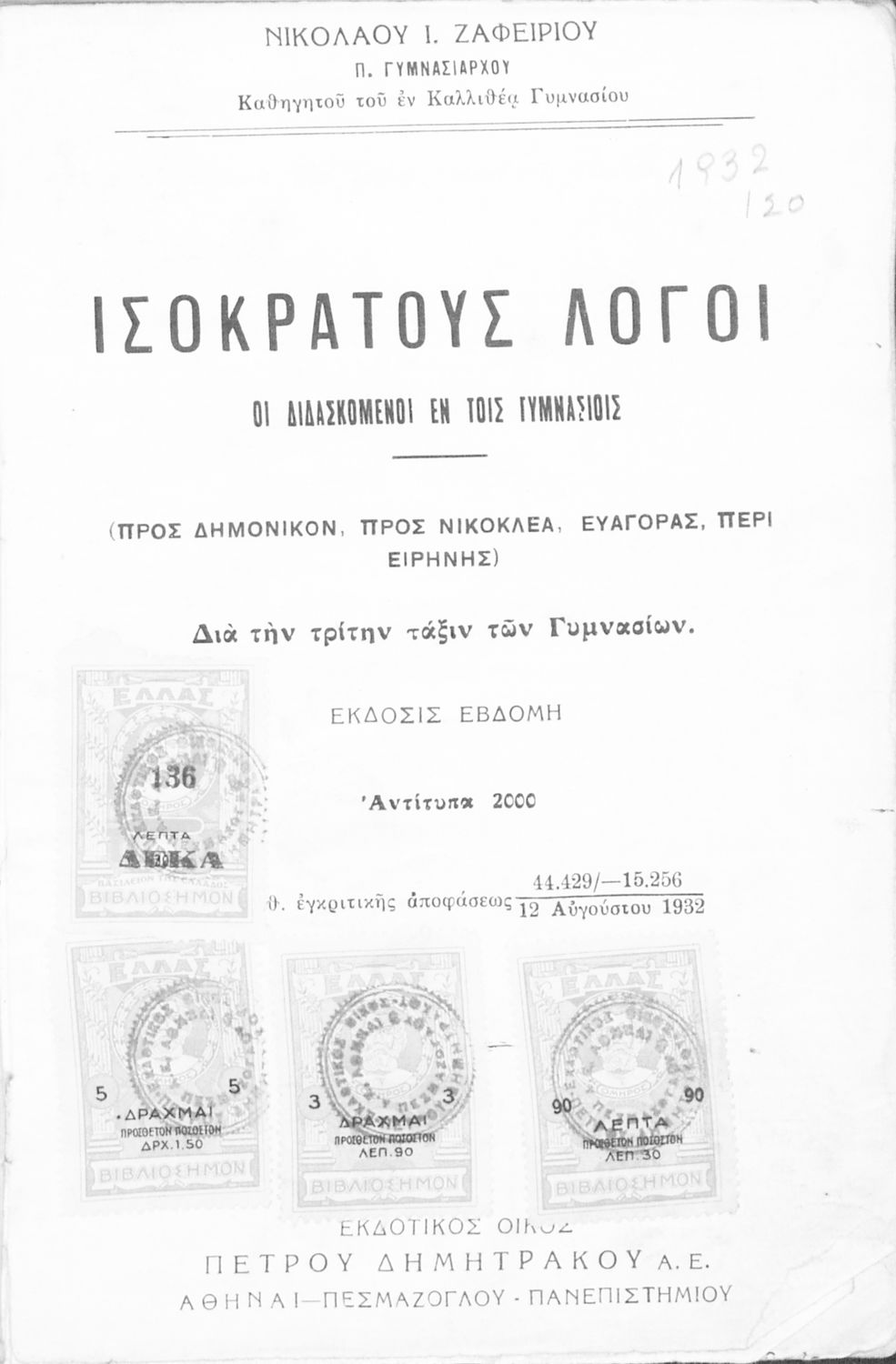 Εκδότης: Πέτρος Δημητράκος Α.Ε. Έτος έκδοσης: 1932 Τόπος έκδοσης: Αθήνα Έκδοση: 7η Υπουργική απόφαση / Σύμβαση: 44429/17-8-1932 |