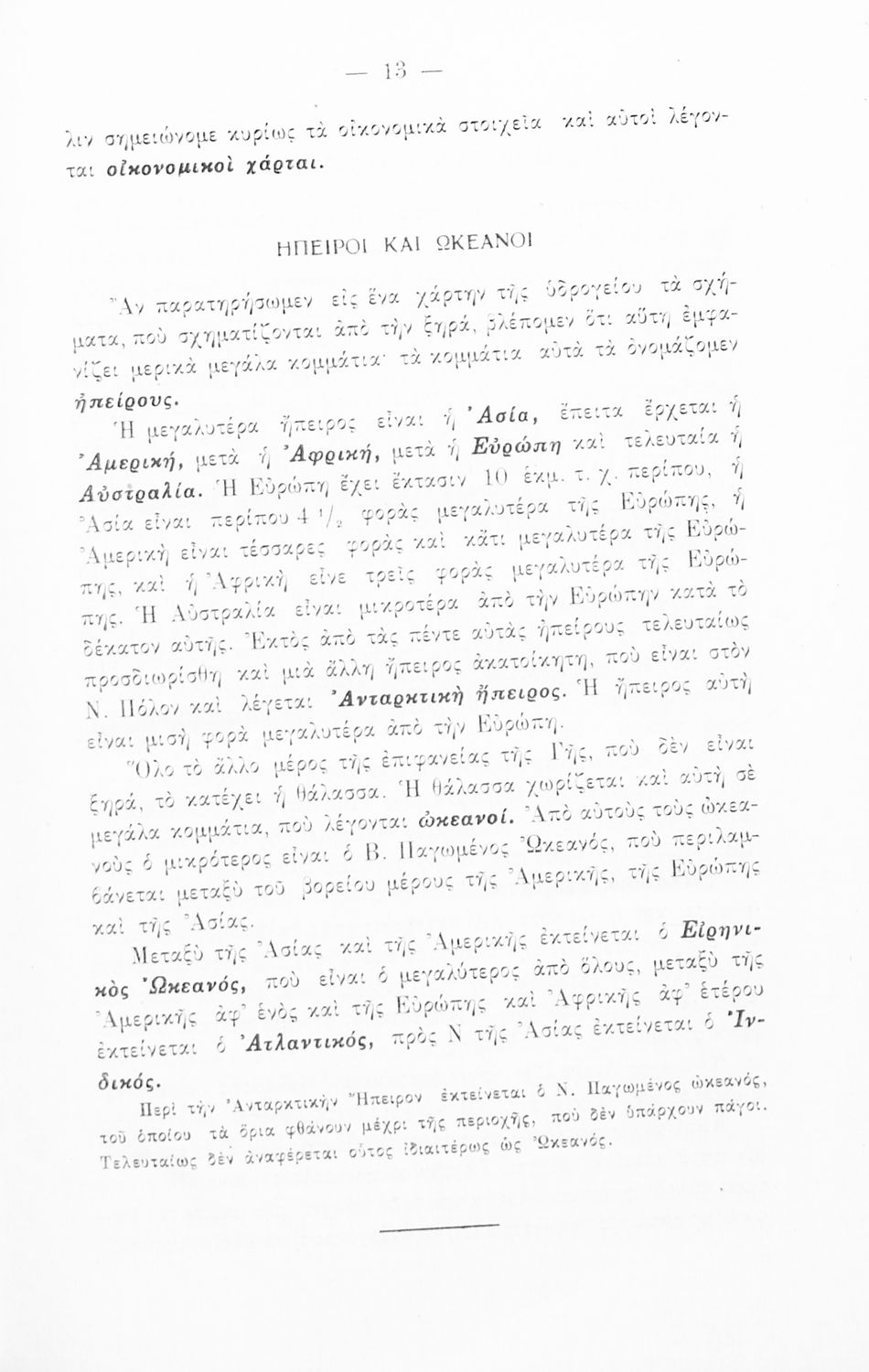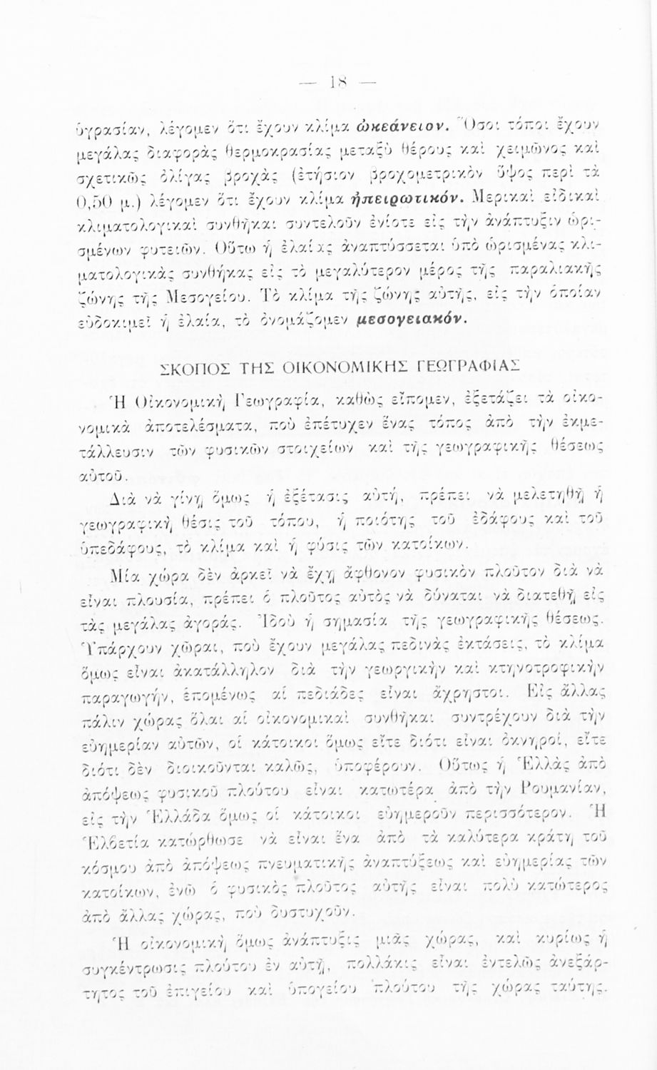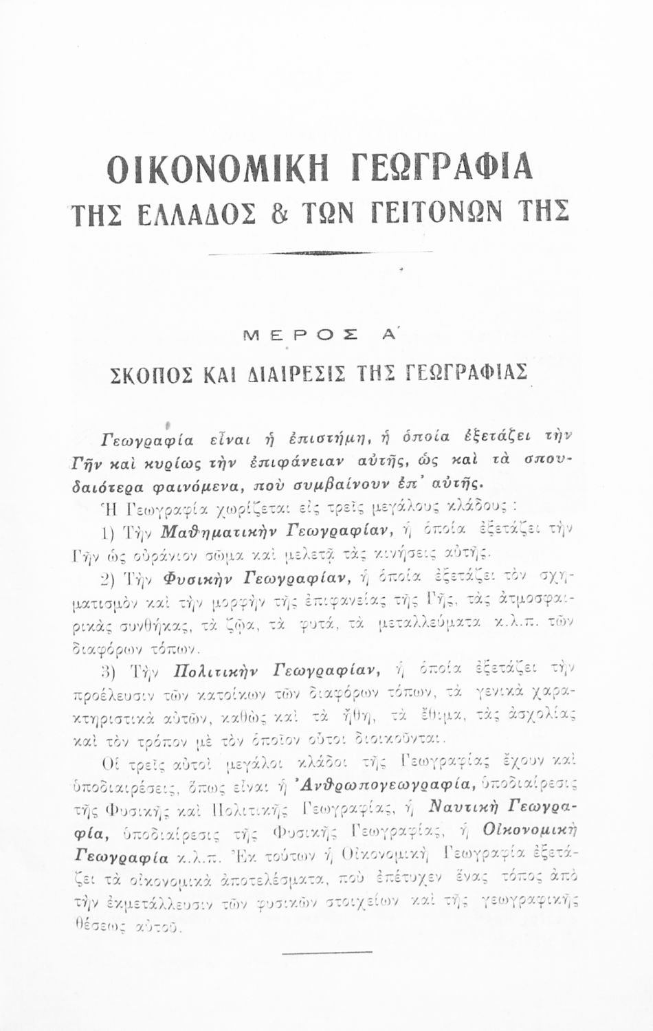 Πρόκειται για σχολικό εγχειρίδιο το οποίο μέσα από πλούσια εικονογράφηση προοριζόταν για τη διδασκαλία του μαθήματος της οικονομικής Γεωγραφίας της Ελλάδας. Φέρει την υπογραφή του συγγραφέα και τη σφραγίδα του εκδότη.