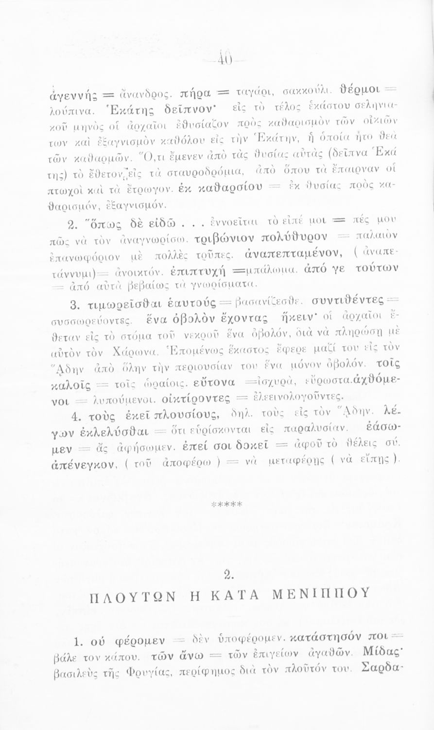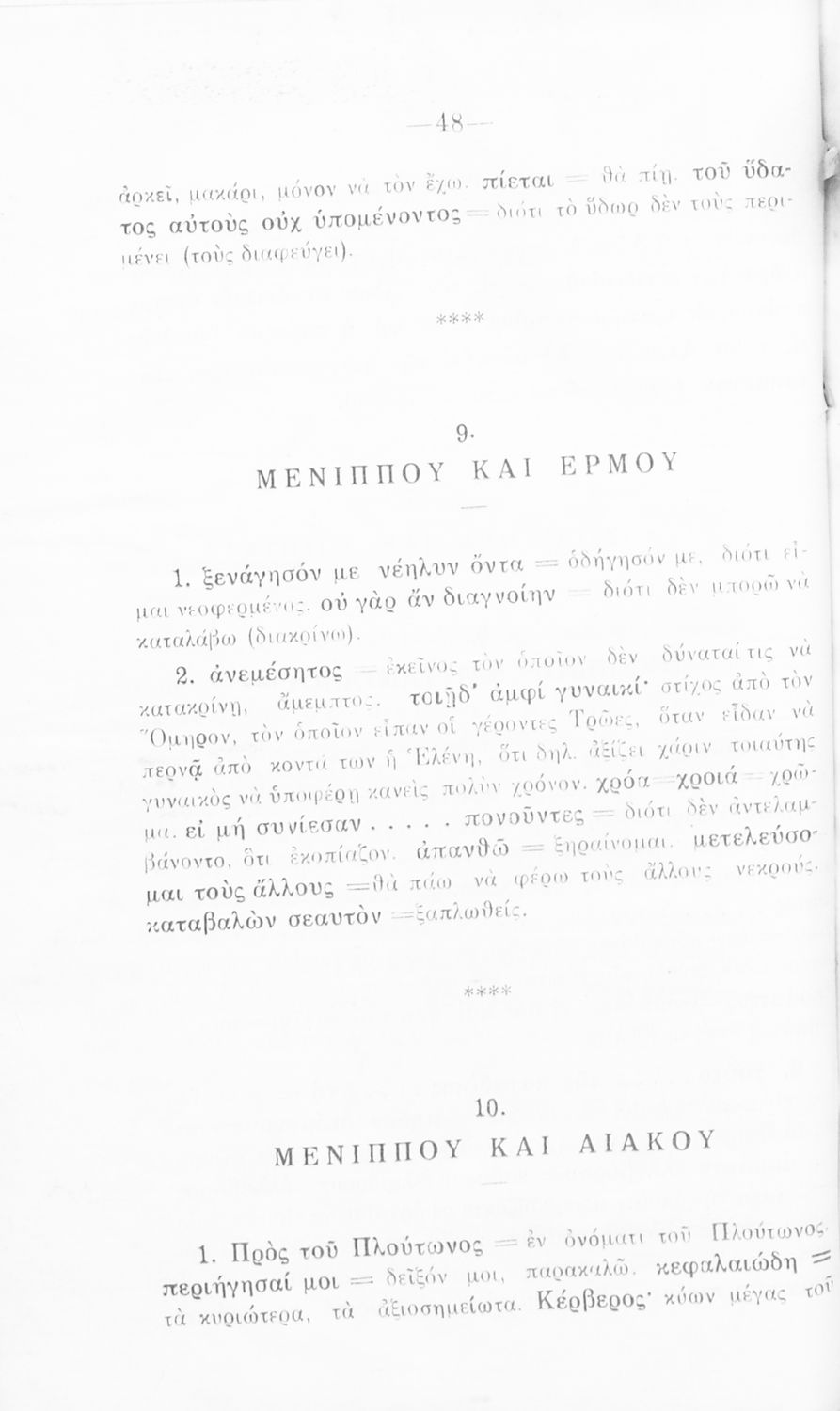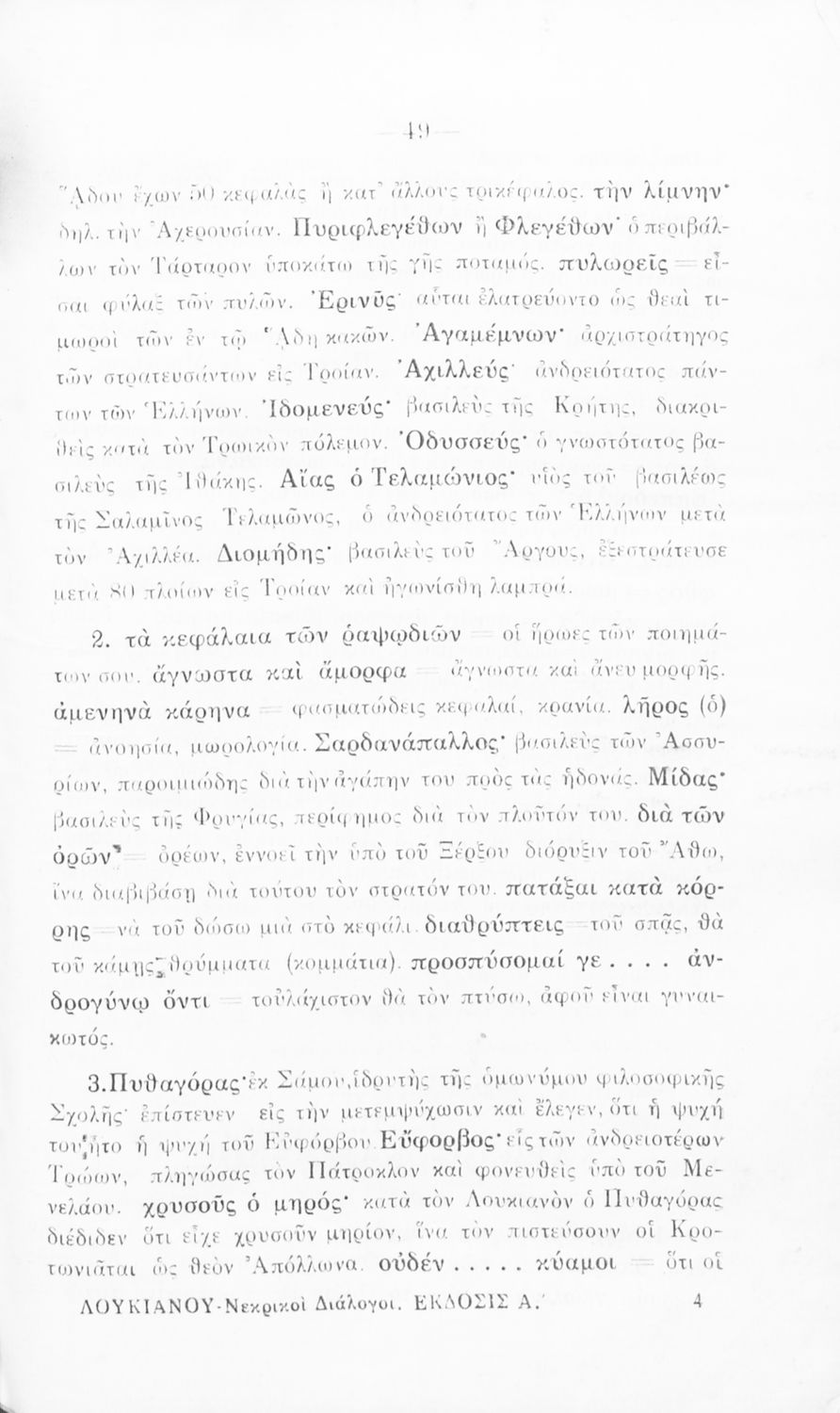 Σχολικό εγχειρίδιο Αρχαίων Ελληνικών για την Α΄ τάξη των Ημιγυμνασίων και Εξαταξίων Γυμνασίων που περιέχει αποσπάσματα από τους Νεκρικούς Διαλόγους του Λουκιανού και ετυμολογικές και πραγματολογικές σημειώσεις.