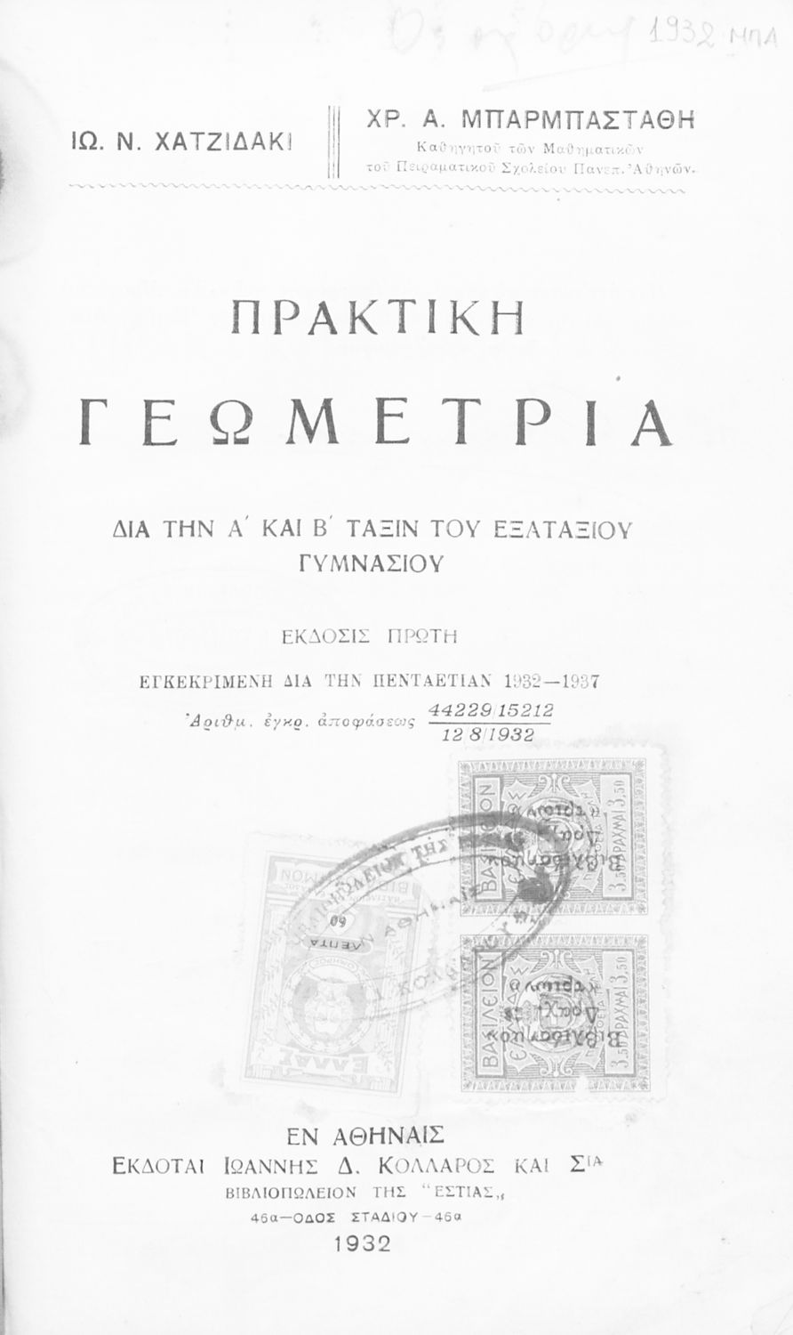 Εκδότης: Ιωάννης Ν. Σιδέρης Έτος έκδοσης: 1932 Τόπος έκδοσης: Αθήνα Έκδοση: 1η Υπουργική απόφαση / Σύμβαση: 44429/9-9-1932 |