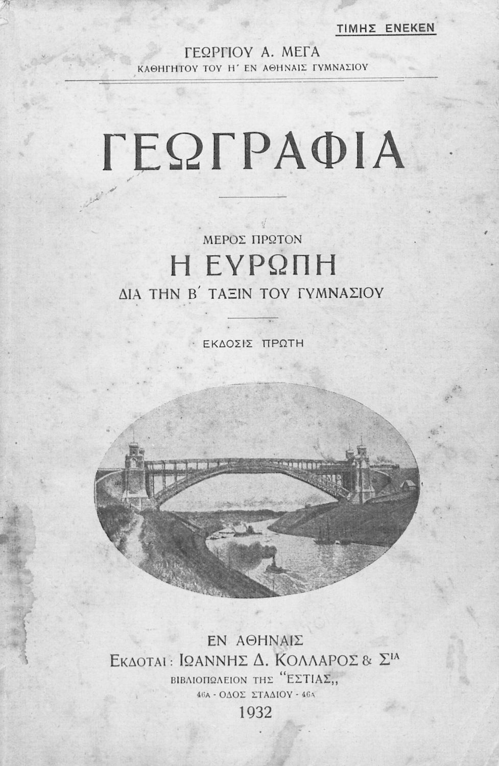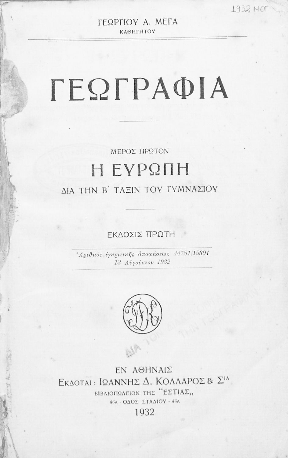 Κωδικός αναγνώρισης: 02-01490 Τίτλος: Γεωγραφία μέρος πρώτον η Ευρώπη διά την Β΄ τάξιν του Γυμνασίου Συγγραφέας: Γεώργιος Α. Μέγας Μέγεθος και υπόστρωμα: Σχολικό εγχειρίδιο, μαλακό εξώφυλλο, 172 σελίδες. Εικόνες (ασπρόμαυρες), σκίτσα (ασπρόμαυρα), χάρτες (ασπρόμαυροι). |