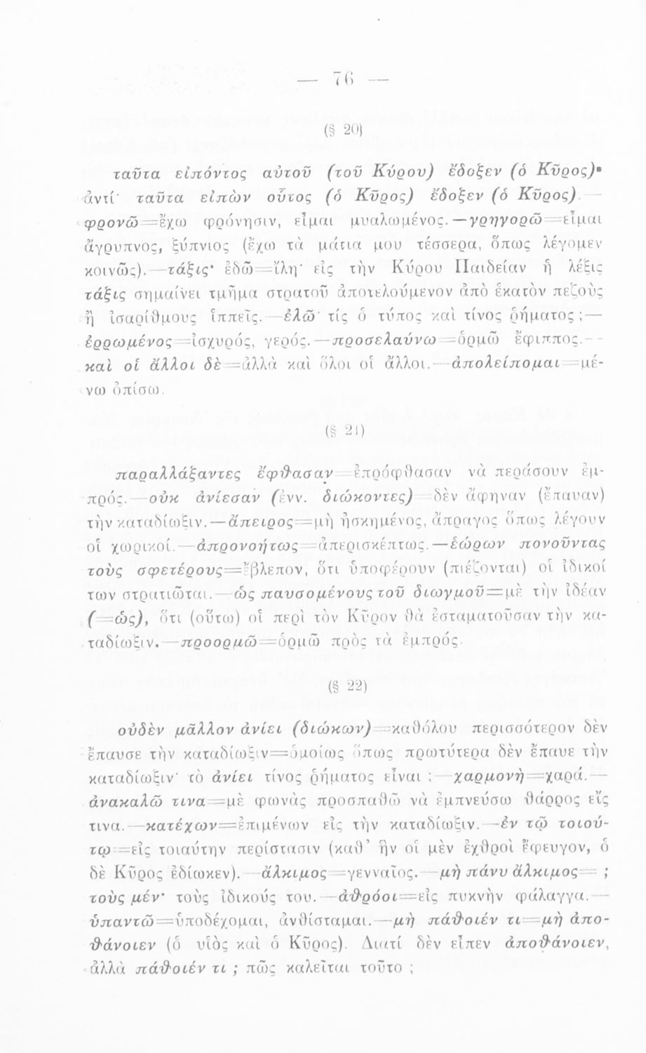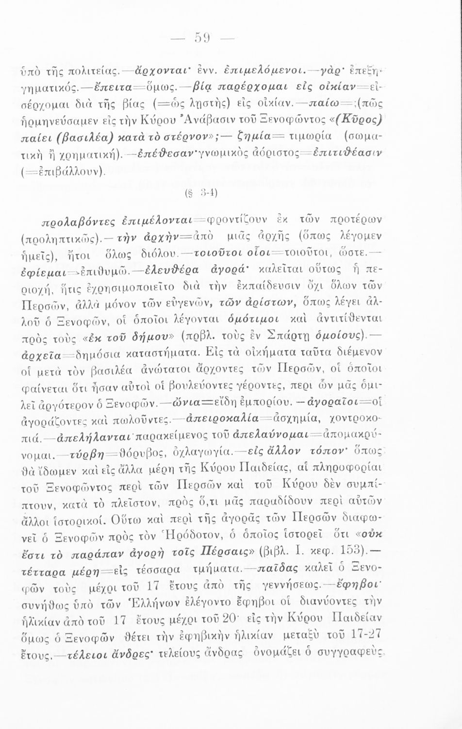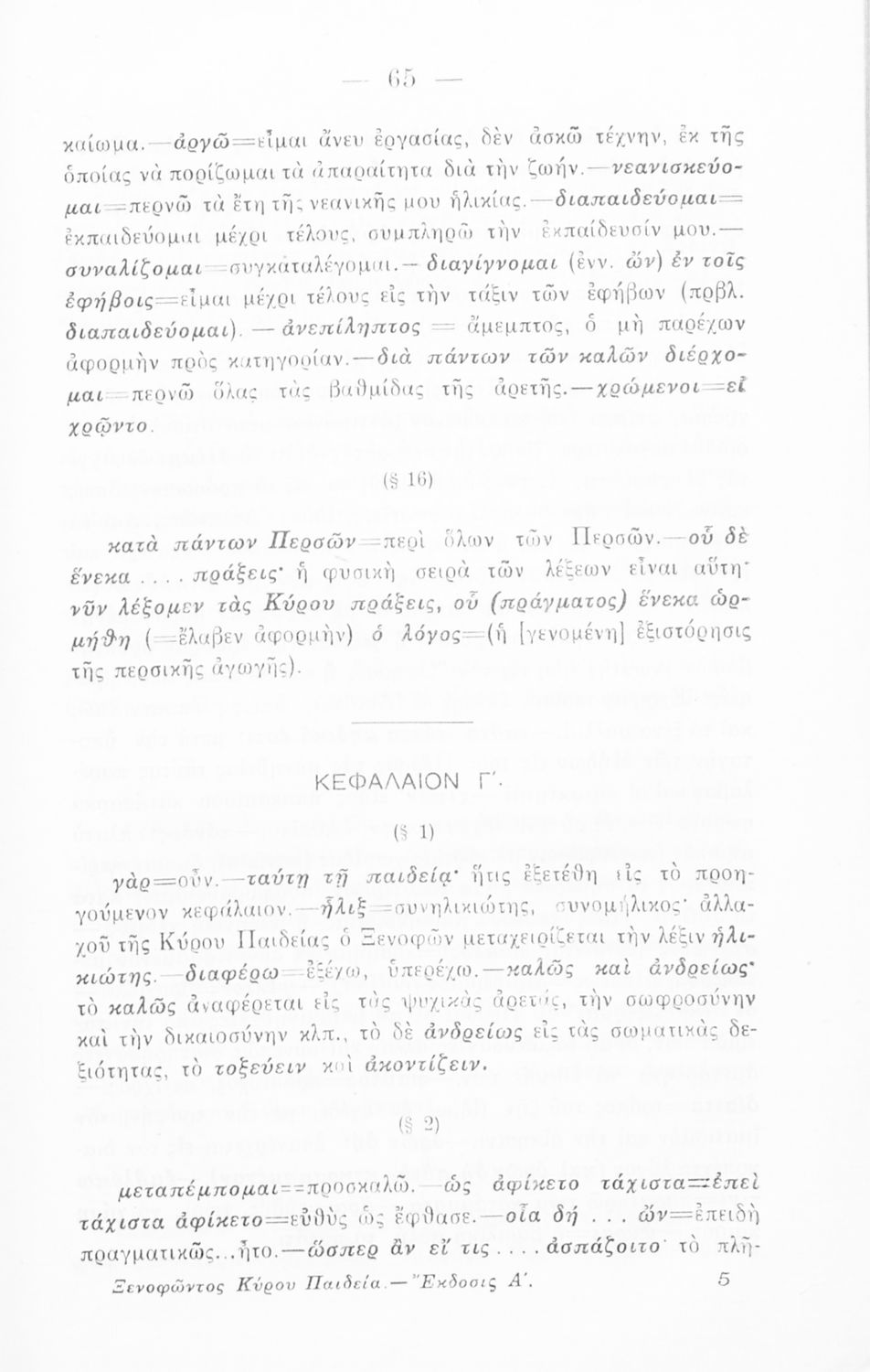 Σχολικό εγχειρίδιο Αρχαίων Ελληνικών για την Γ΄ Εξαταξίου Γυμνασίου που περιλαμβάνει εισαγωγή στη ζωή και το έργο του Ξενοφώντα, αποσπάσματα από το Κύρου Παιδεία, ερμηνευτικές σημειώσεις, σκίτσα που απεικονίζουν πολεμικά όπλα της εποχής και χωρογραφικό πίνακα της περιοχής.
