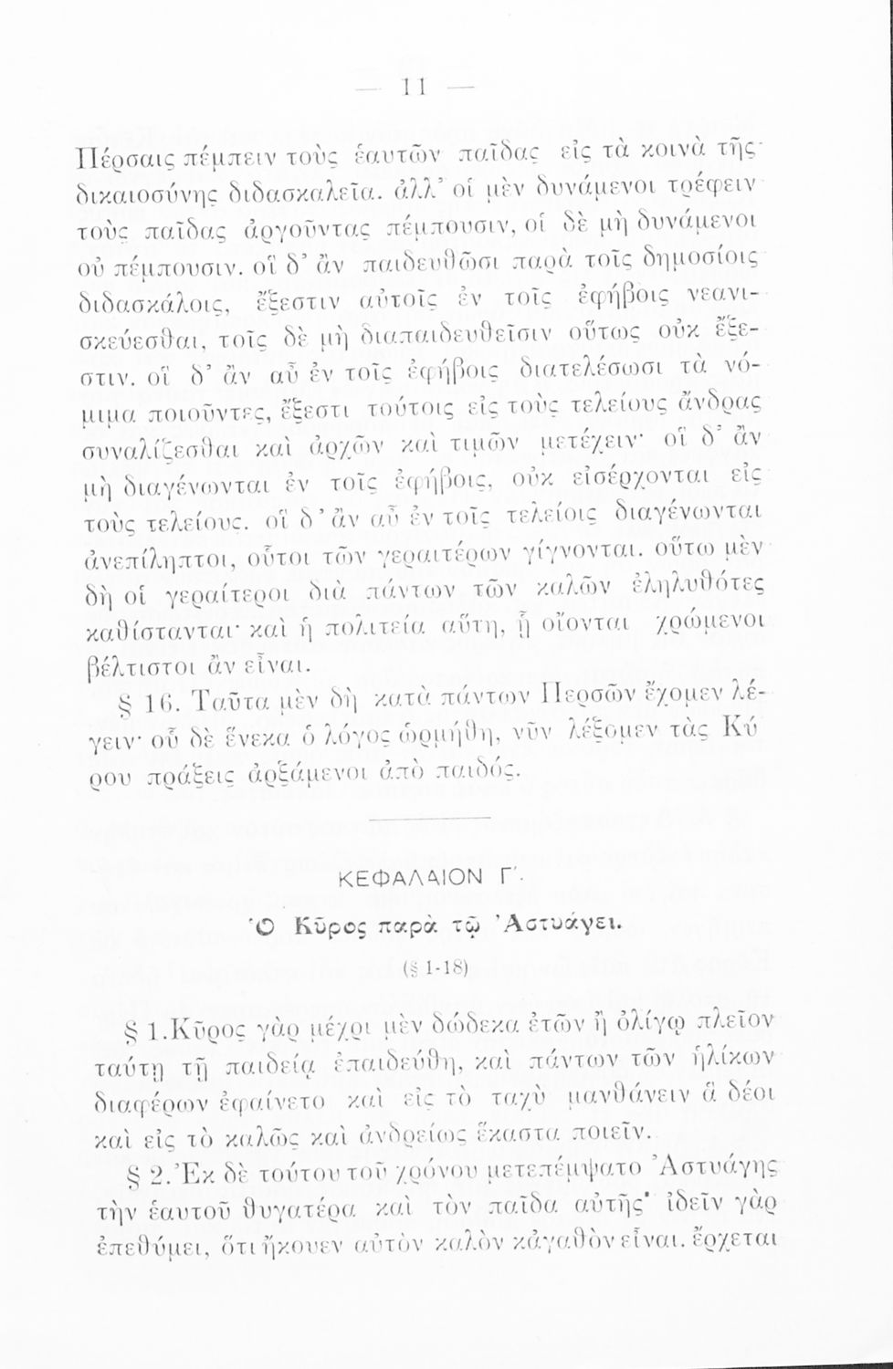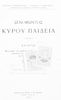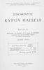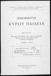 Σχολικό εγχειρίδιο Αρχαίων Ελληνικών για την Γ΄ Εξαταξίου Γυμνασίου που περιλαμβάνει εισαγωγή στη ζωή και το έργο του Ξενοφώντα, αποσπάσματα από το Κύρου Παιδεία, ερμηνευτικές σημειώσεις, σκίτσα που απεικονίζουν πολεμικά όπλα της εποχής και χωρογραφικό πίνακα της περιοχής.