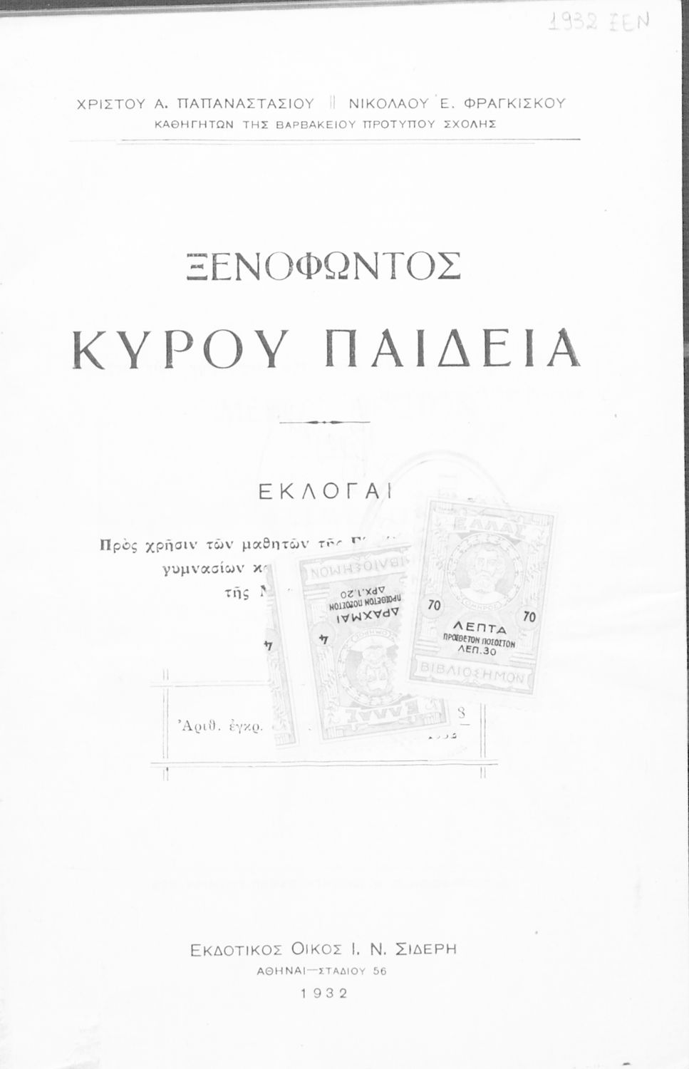 Εκδότης: Ιωάννης Ν. Σιδέρης Έτος έκδοσης: 1932 Τόπος έκδοσης: Αθήνα Έκδοση: 1η Υπουργική απόφαση / Σύμβαση: 44429/9-9-1932 |
