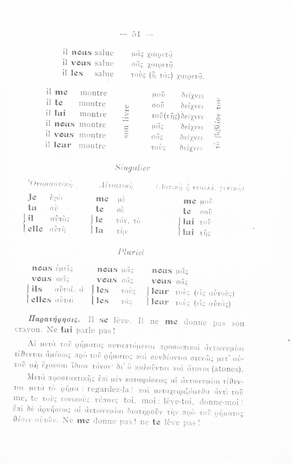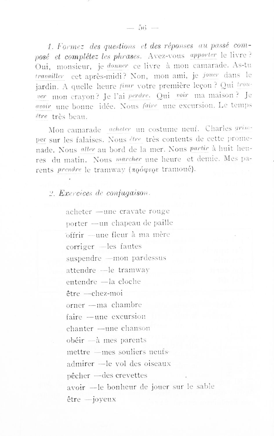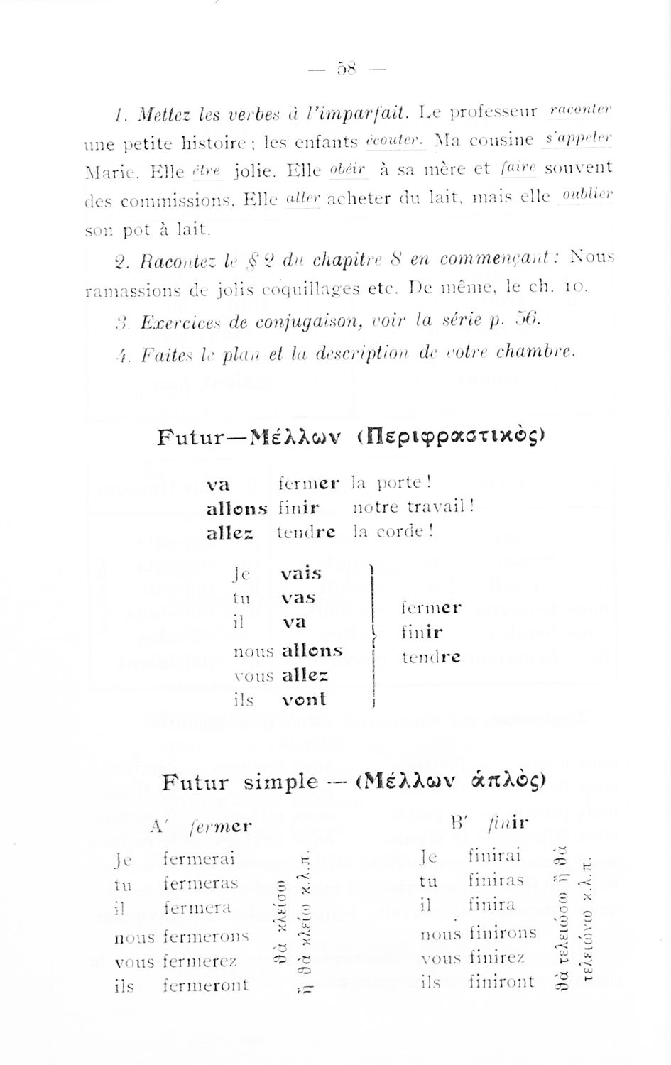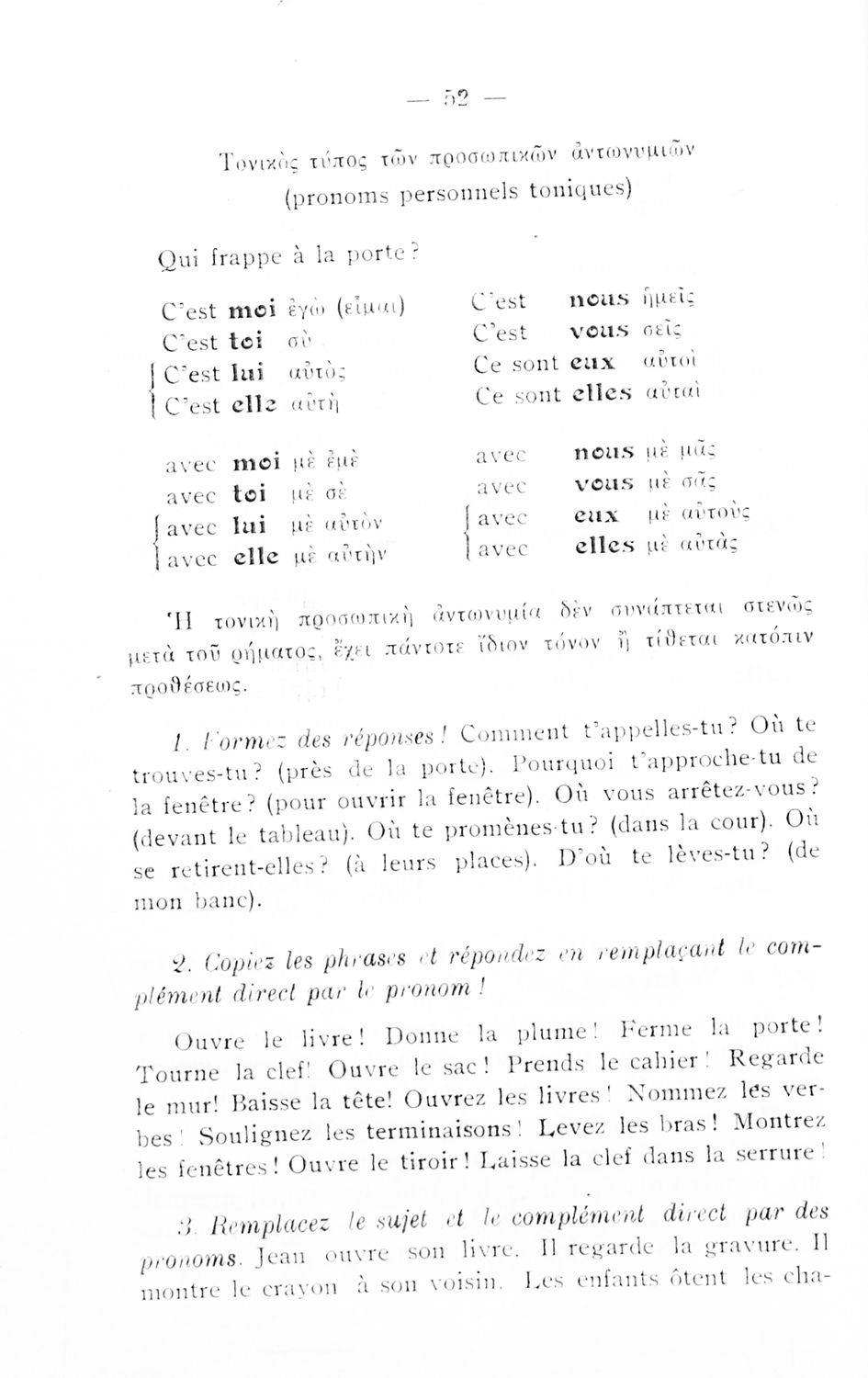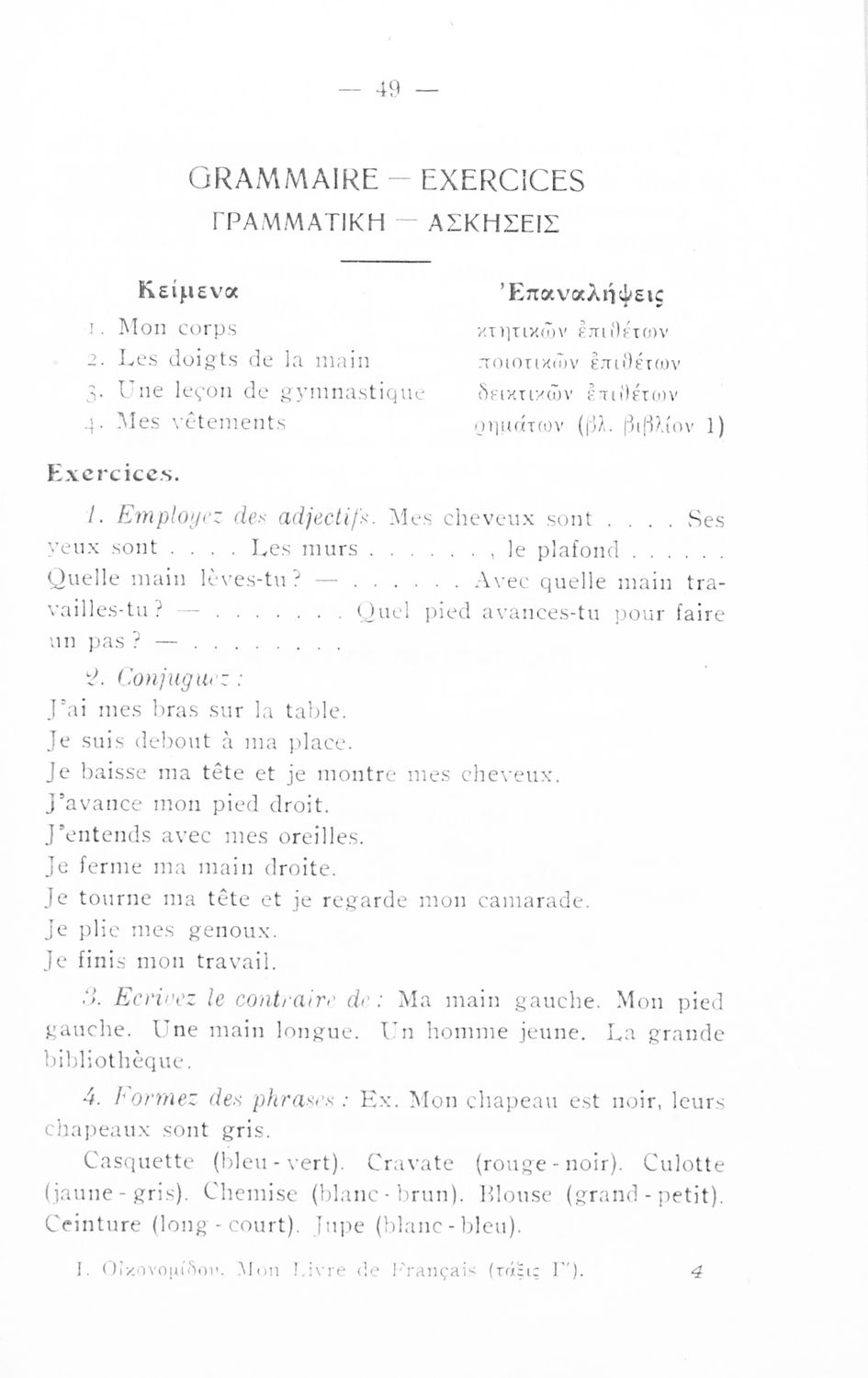 Κωδικός αναγνώρισης: 02-01498 Τίτλος: Mon livre de francais, Βιβλίον 2ον διά την Γ΄ τάξιν του Γυμνασίου (Δεύτερον έτος της Διδασκαλίας των Γαλλικών) Συγγραφέας: Ι. Οικονομίδης Εικονογράφος: Σπ. Βυτωρόπουλος Μέγεθος και υπόστρωμα: Σχολικό εγχειρίδιο, σκληρό εξώφυλλο, 114 σελίδες. Σκίτσα (ασπρόμαυρα). |