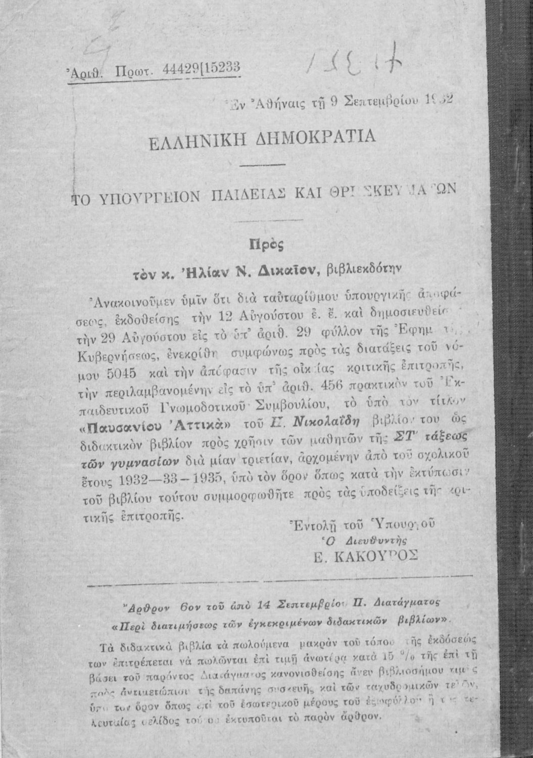 Εκδότης: Ηλίας Ν. Δικαίος Έτος έκδοσης: 1932 Τόπος έκδοσης: Αθήνα Υπουργική απόφαση / Σύμβαση: 44429/9-9-1932 |