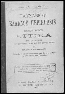 Βαθμίδα εκπαίδευσης: Δευτεροβάθμια Τάξη: ΣΤ' Γυμνασίου Μάθημα: Αρχαία Ελληνικά Γλώσσα: Καθαρεύουσα Παρουσίαση περιεχομένου: Σχολικό εγχειρίδιο Αρχαίων Ελληνικών της ΣΤ΄ Γυμνασίου το οποίο περιλαμβάνει αποσπάσματα από το έργο του Παυσανία. Το βιβλίο ξεκινάει με μια εισαγωγή για το έργο και τη ζωή του Παυσανία και συνεχίζει παραθέτοντας το ίδιο το έργο του συγγραφέα. |