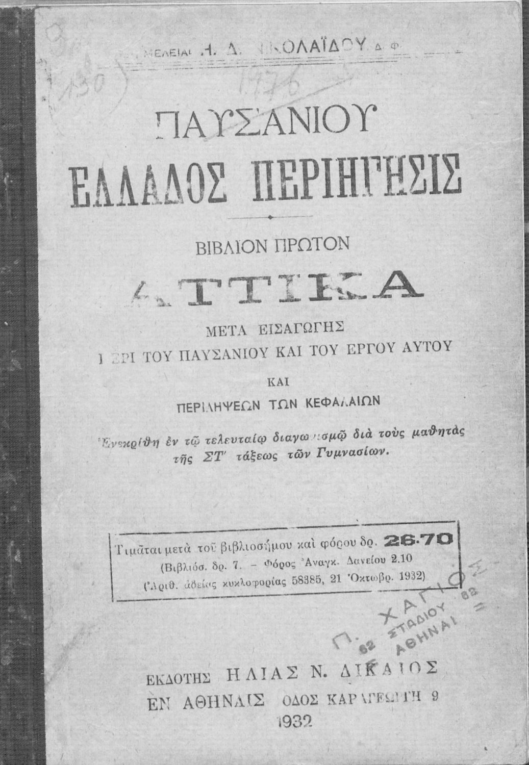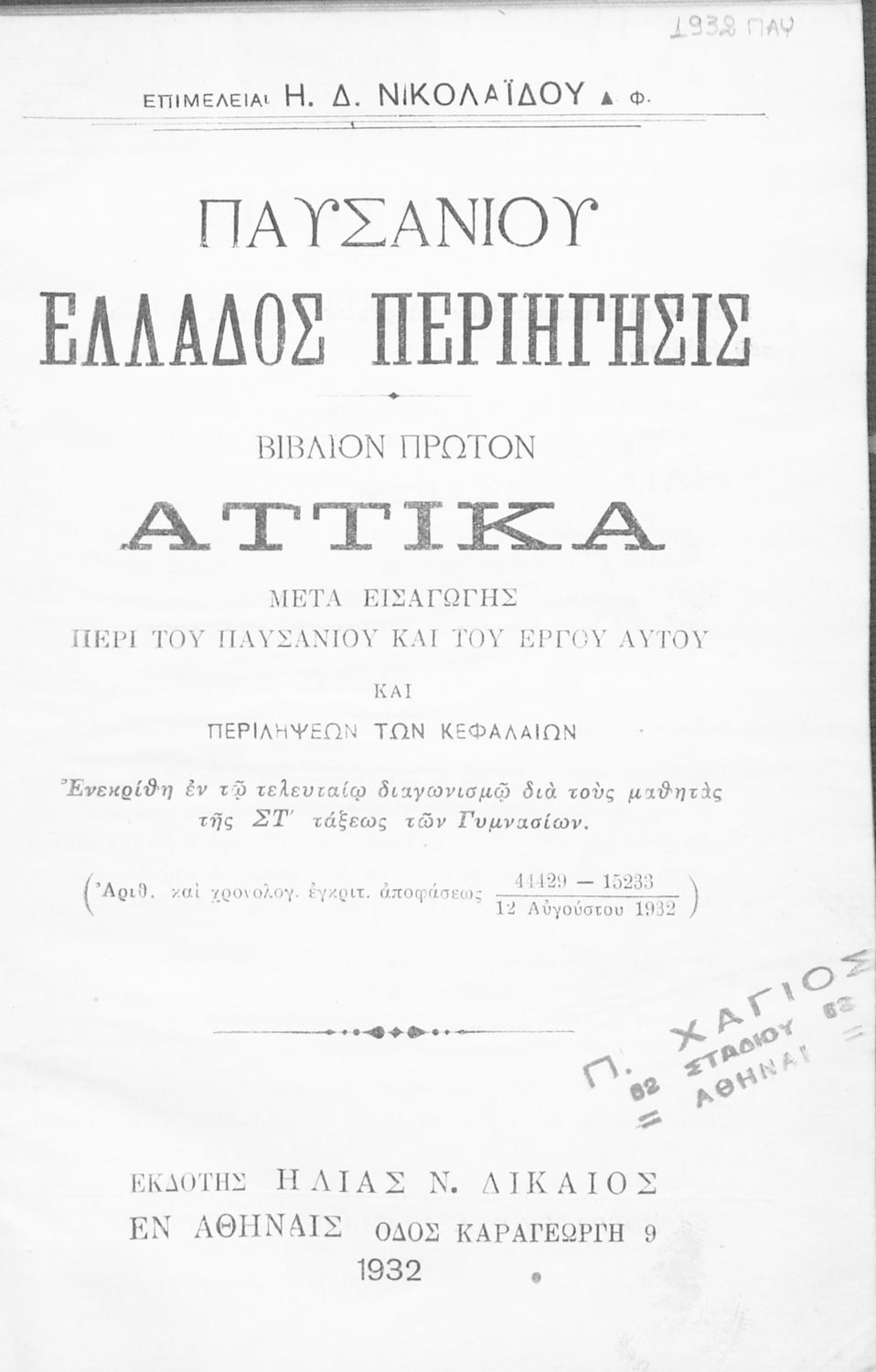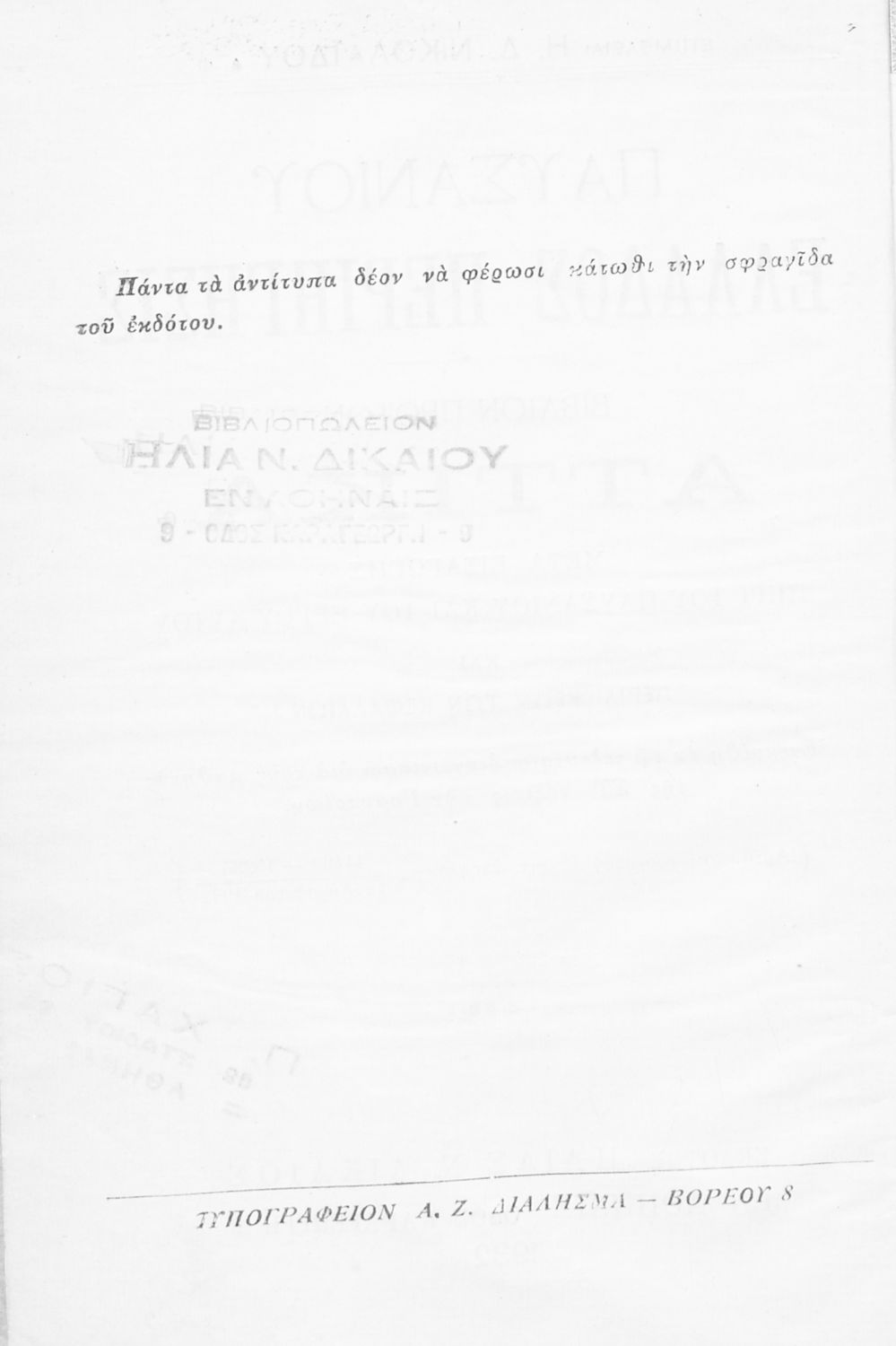 Εκδότης: Ηλίας Ν. Δικαίος Έτος έκδοσης: 1932 Τόπος έκδοσης: Αθήνα Υπουργική απόφαση / Σύμβαση: 44429/9-9-1932 |