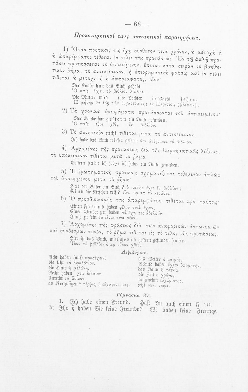 Μάθημα: Γερμανικά Γλώσσα: Γερμανικά / Καθαρεύουσα Παρουσίαση περιεχομένου: Πρόκειται για εγχειρίδιο που στόχο έχει την εκμάθηση της γερμανικής γλώσσας άνευ διδασκάλου. Το βιβλίο χωρίζεται σε δύο μέρη. Στο πρώτο μέρος, περιλαμβάνει και παρουσιάζει τα διάφορα μέρη του λόγου, τη σωστή χρήση και προφορά τους. Στο δεύτερο μέρος περιέχει κανόνες και ασκήσεις συντακτικού απλών, σύνθετων και παρενθετικών προτάσεων. |