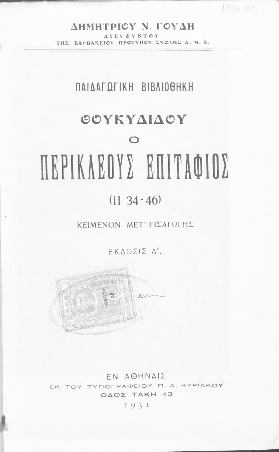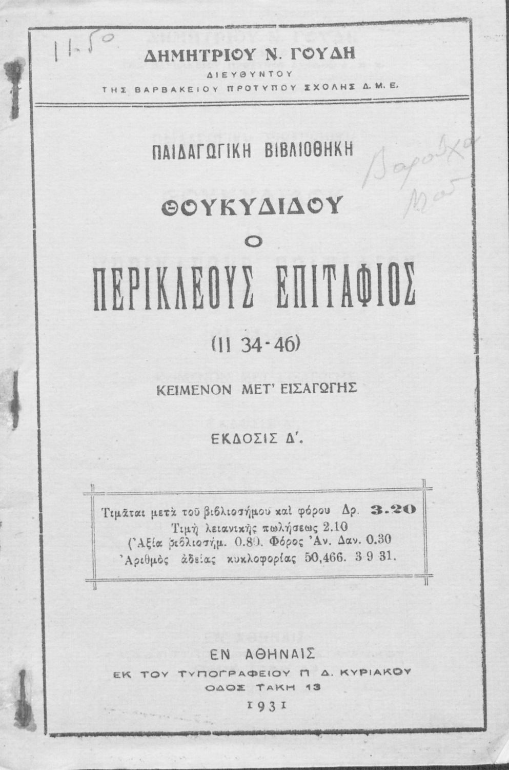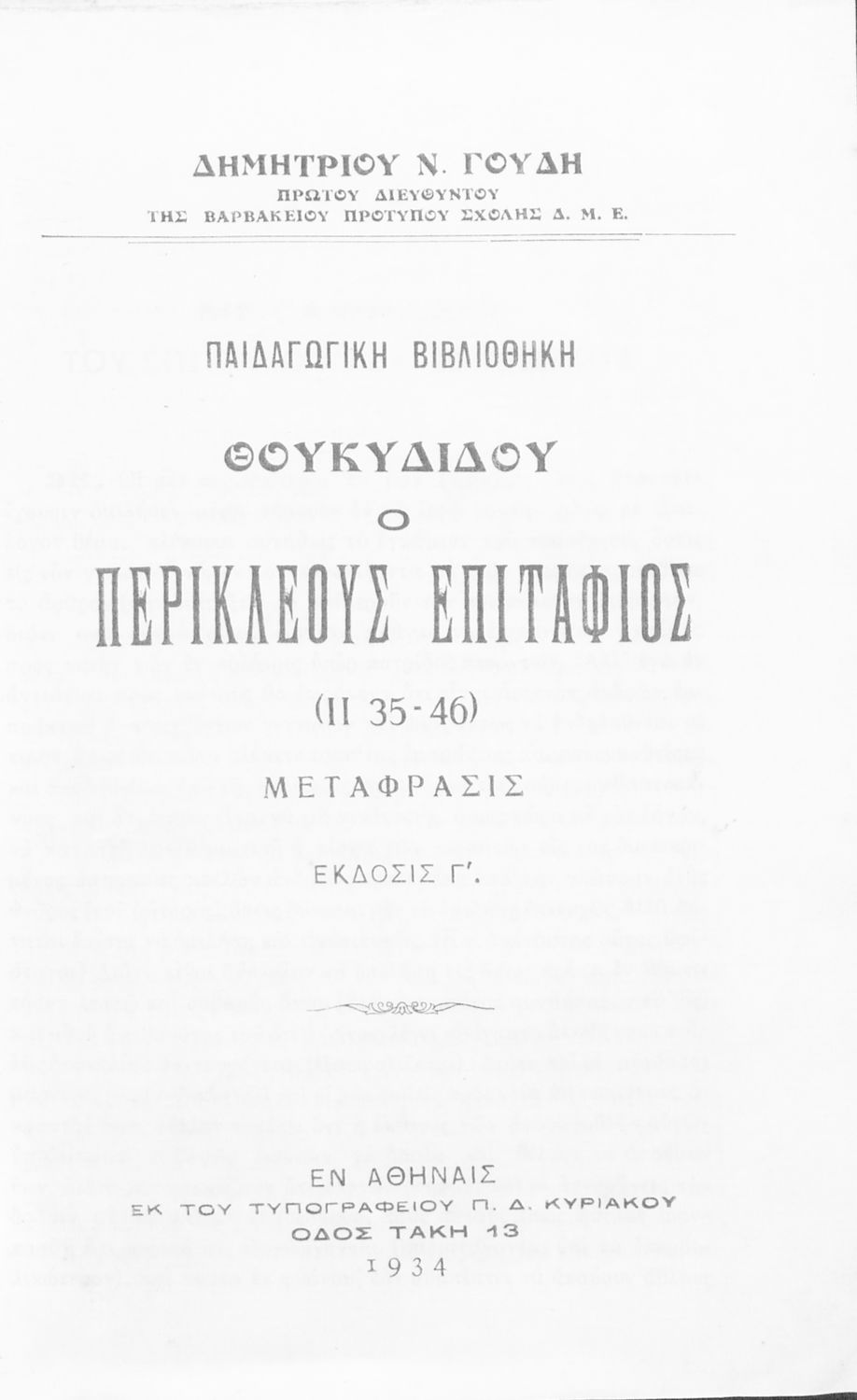 Εκδότης: Π. Δ. Κυριακού Έτος έκδοσης: 1934 Τόπος έκδοσης: Αθήνα Έκδοση: 3η |