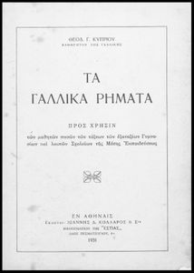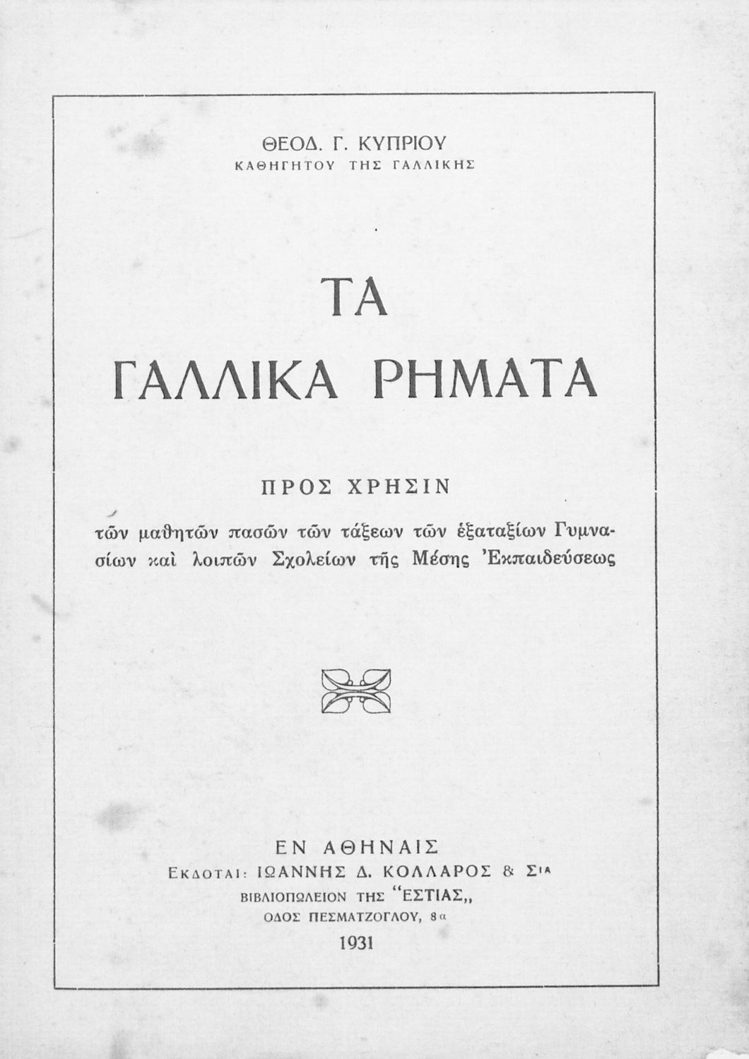 Κωδικός αναγνώρισης: 02-01533 Τίτλος: Τα γαλλικά ρήματα προς χρήσιν των μαθητών πασών των τάξεων των Εξαταξίων Γυμνασίων και λοιπών Σχολείων της Μέσης Εκπαιδεύσεως Συγγραφέας: Θεόδωρος Γ. Κύπριος Μέγεθος και υπόστρωμα: Μαθητικό βοήθημα, μαλακό εξώφυλλο, 84 σελίδες. |