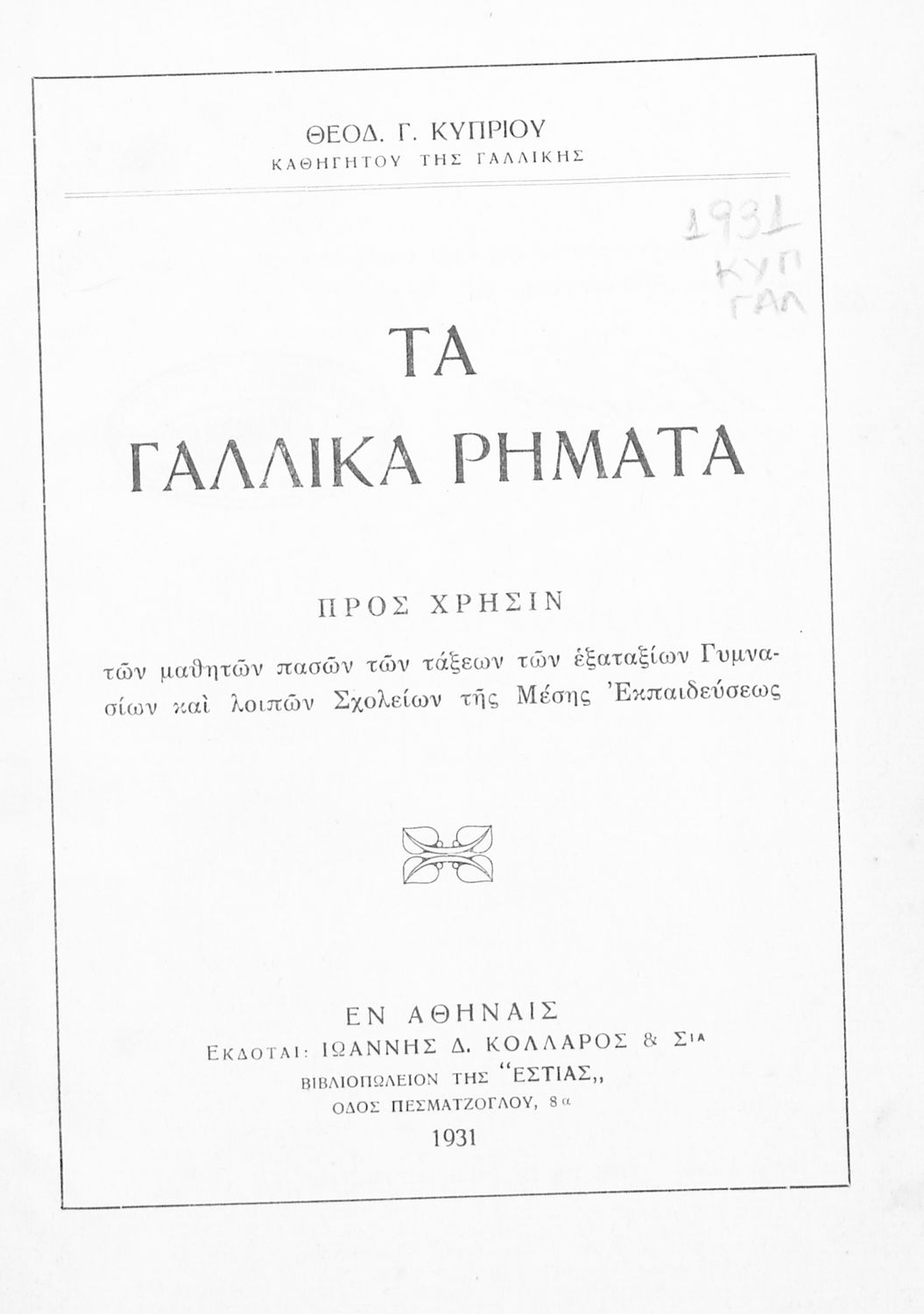 Εκδότης: Ιωάννης Δ. Κολλάρος και ΣΙΑ Έτος έκδοσης: 1931 Τόπος έκδοσης: Αθήνα |