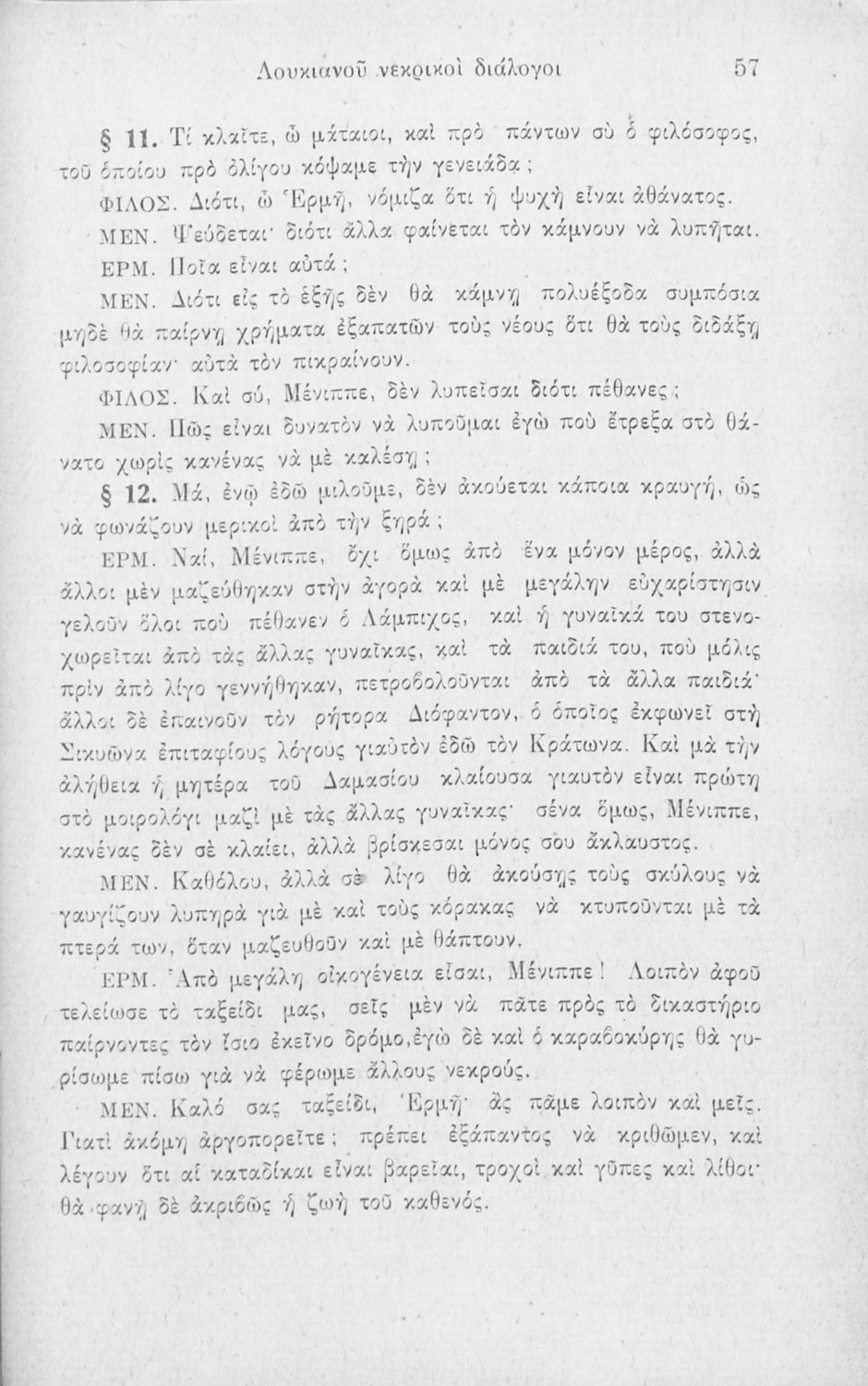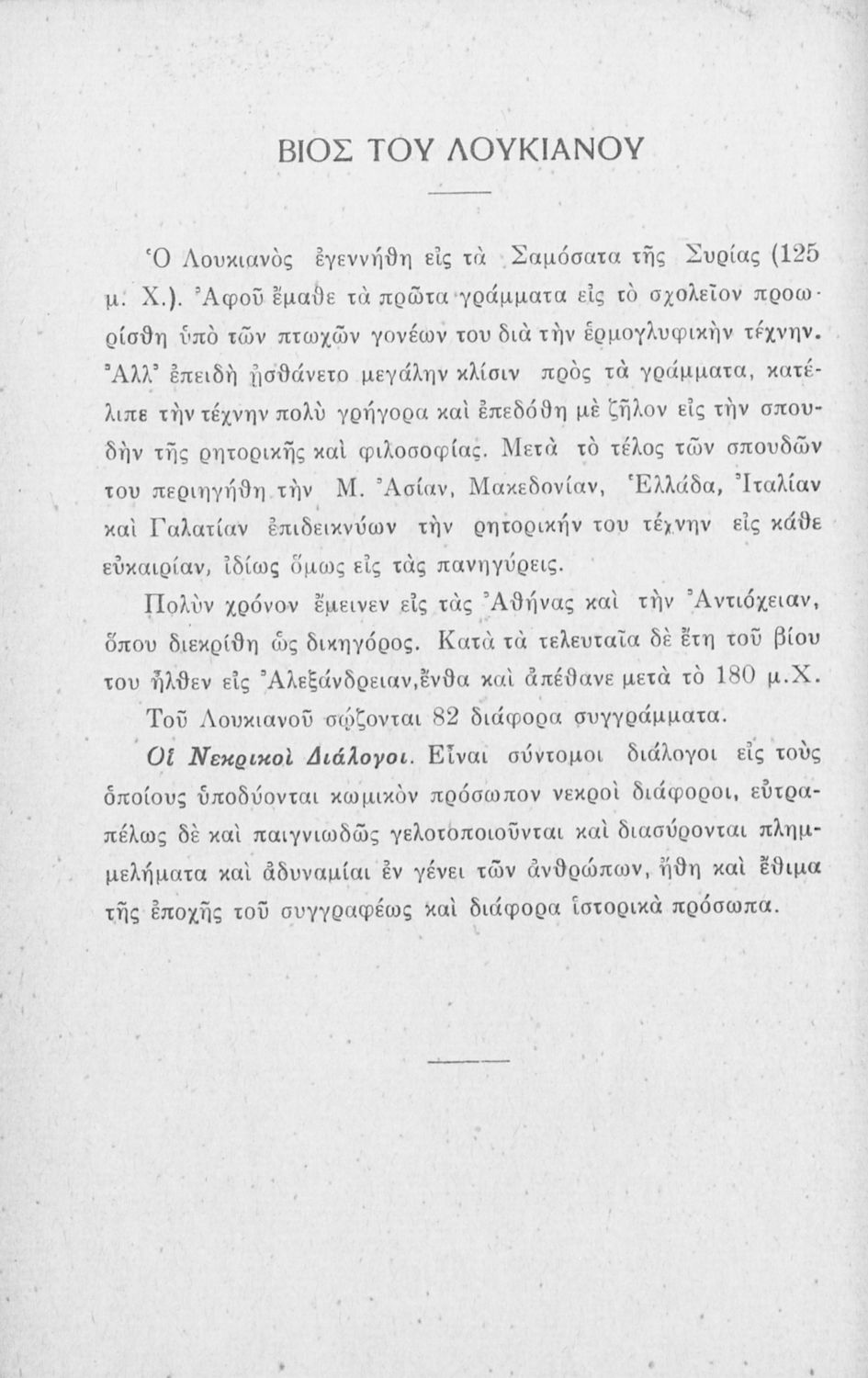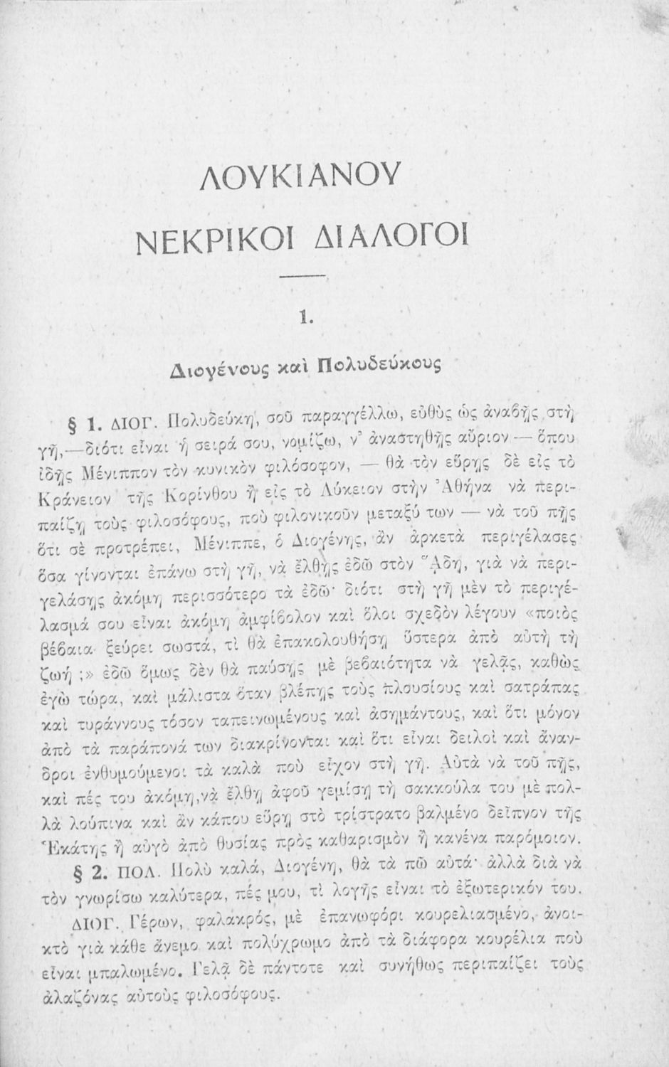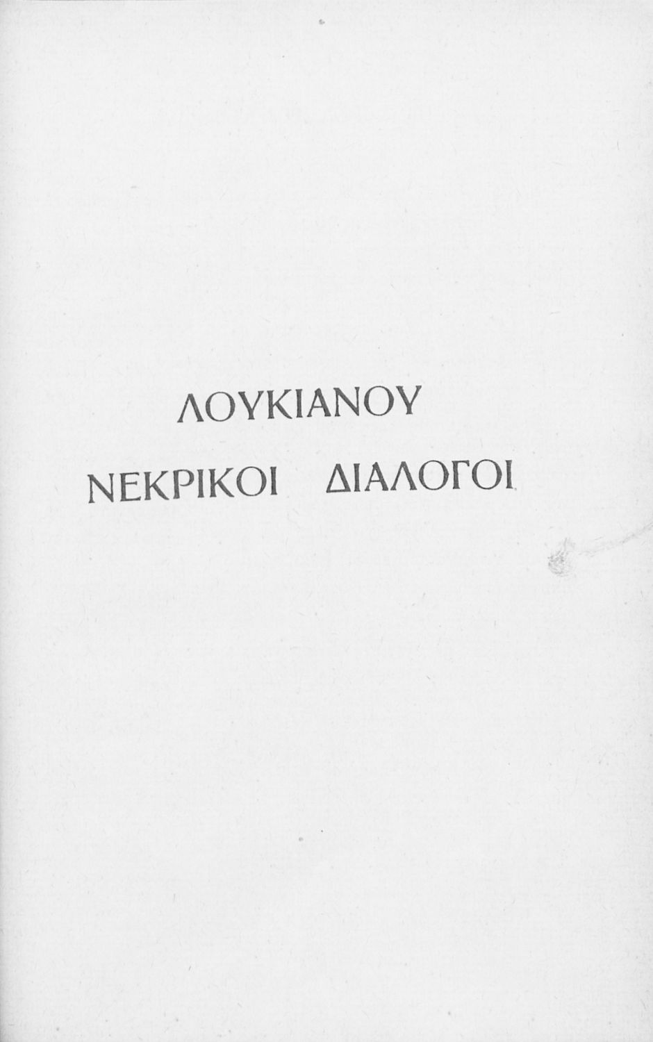 Σχολικό εγχειρίδιο Αρχαίων Ελληνικών για την Α΄ τάξη των Ημιγυμνασίων και Εξαταξίων Γυμνασίων που περιέχει αποσπάσματα από τους Νεκρικούς Διαλόγους του Λουκιανού και ετυμολογικές και πραγματολογικές σημειώσεις.