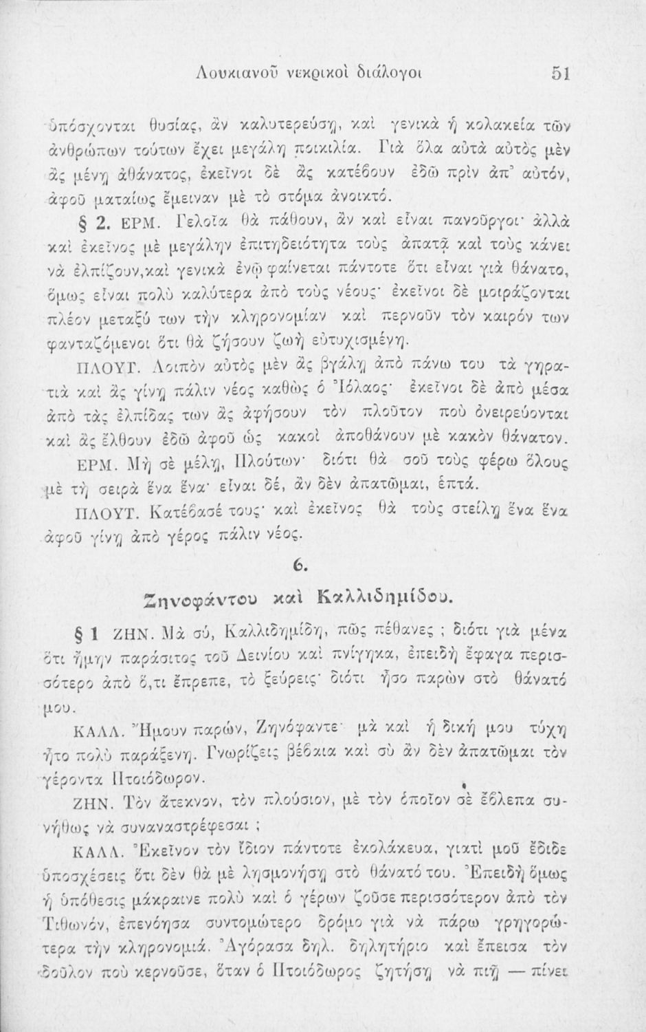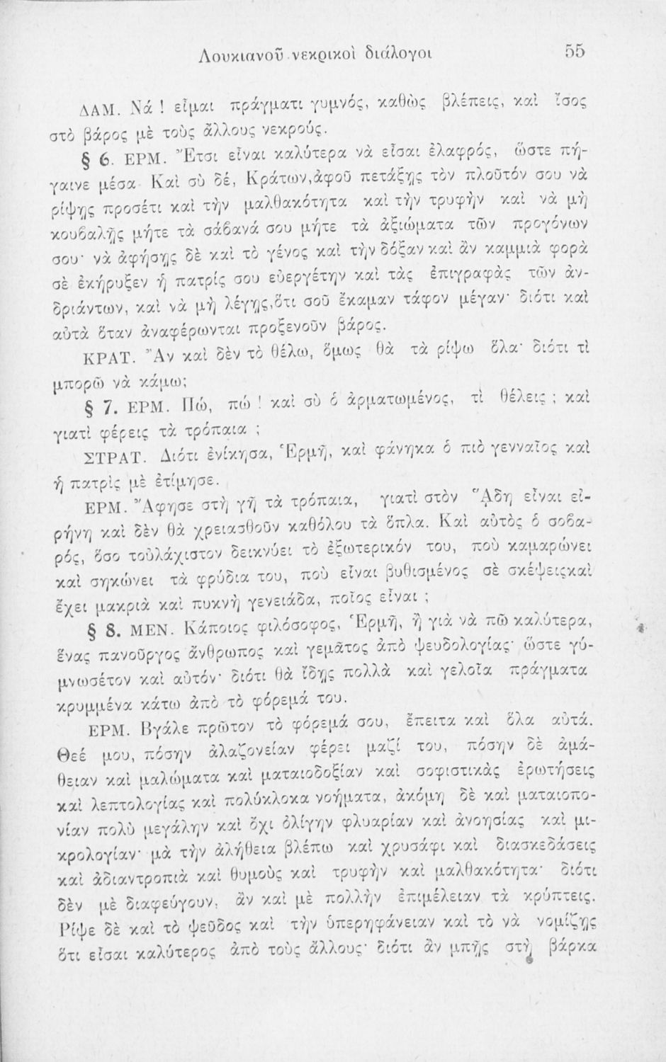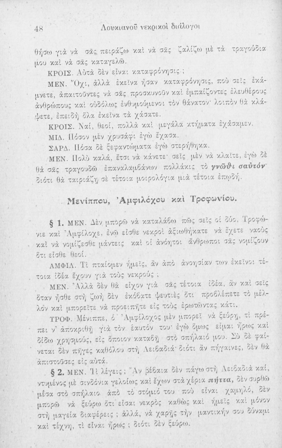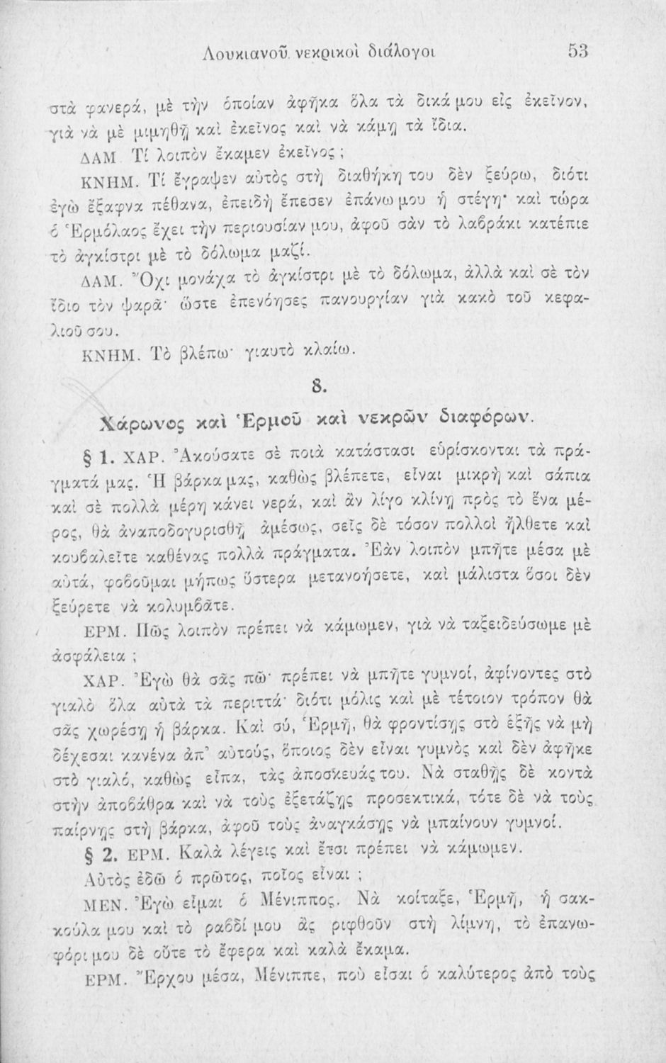 Σχολικό εγχειρίδιο Αρχαίων Ελληνικών για την Α΄ τάξη των Ημιγυμνασίων και Εξαταξίων Γυμνασίων που περιέχει αποσπάσματα από τους Νεκρικούς Διαλόγους του Λουκιανού και ετυμολογικές και πραγματολογικές σημειώσεις.