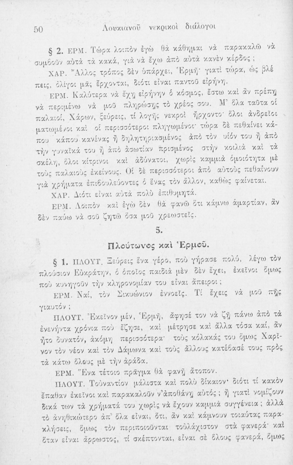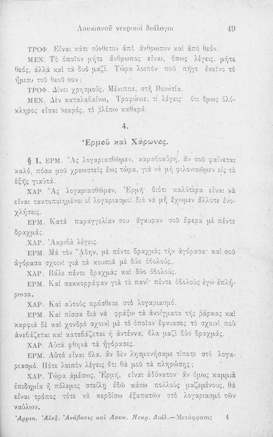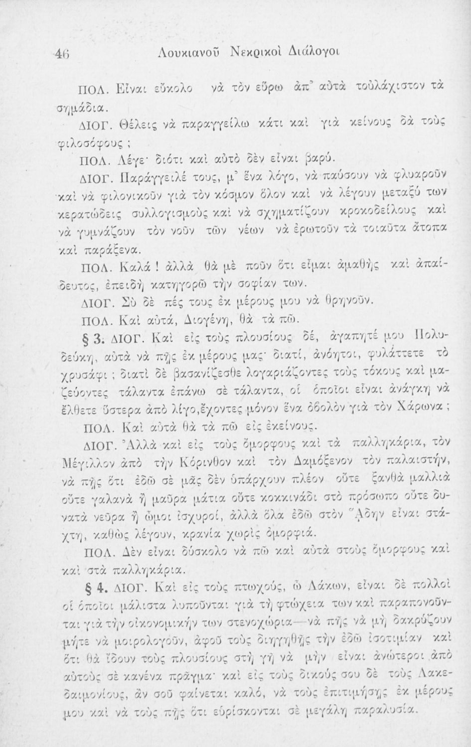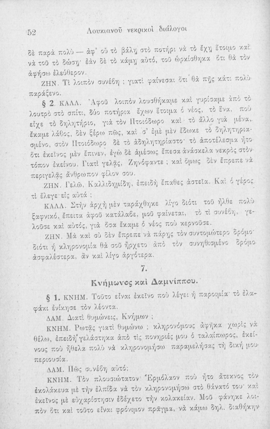 Σχολικό εγχειρίδιο Αρχαίων Ελληνικών για την Α΄ τάξη των Ημιγυμνασίων και Εξαταξίων Γυμνασίων που περιέχει αποσπάσματα από τους Νεκρικούς Διαλόγους του Λουκιανού και ετυμολογικές και πραγματολογικές σημειώσεις.