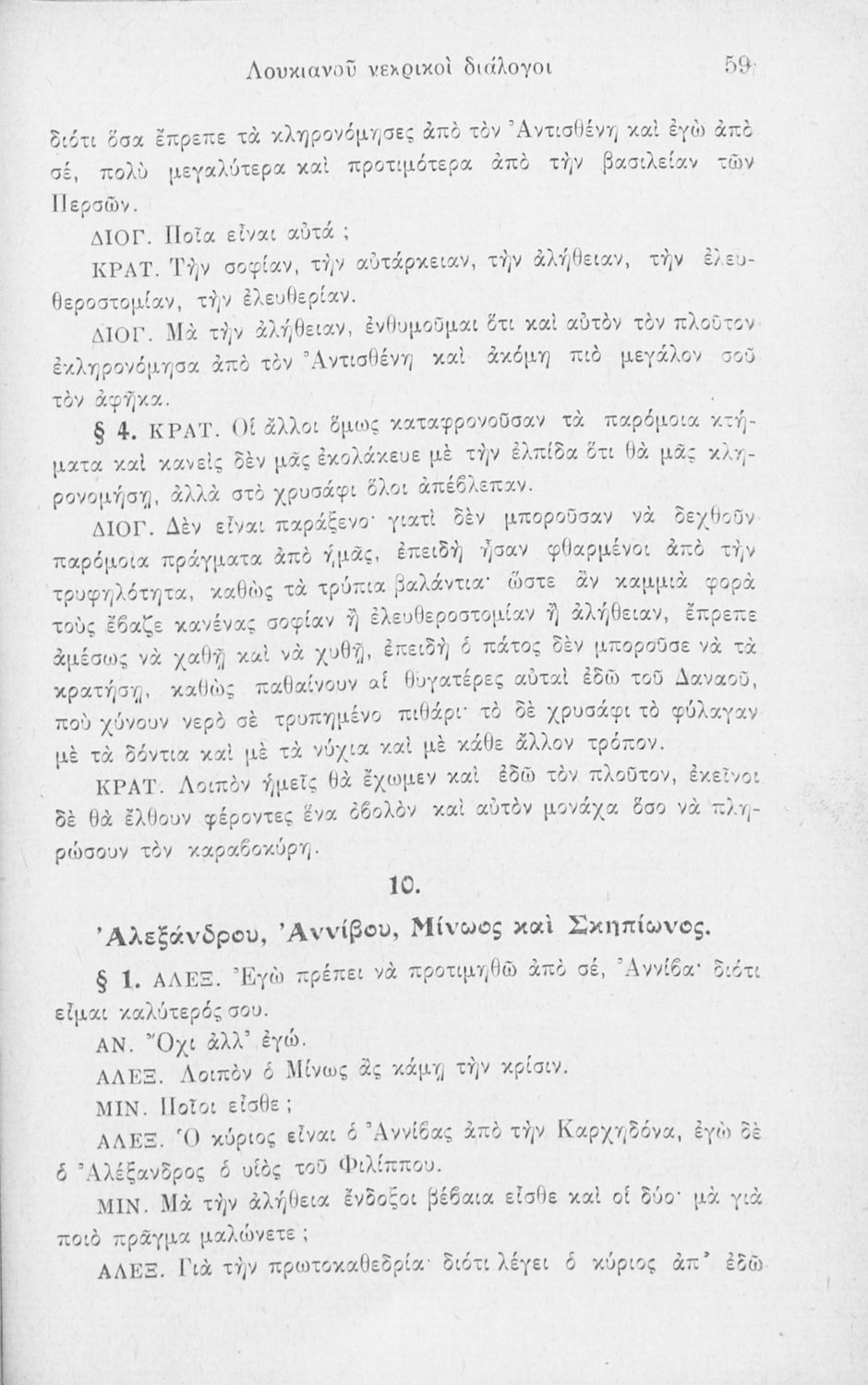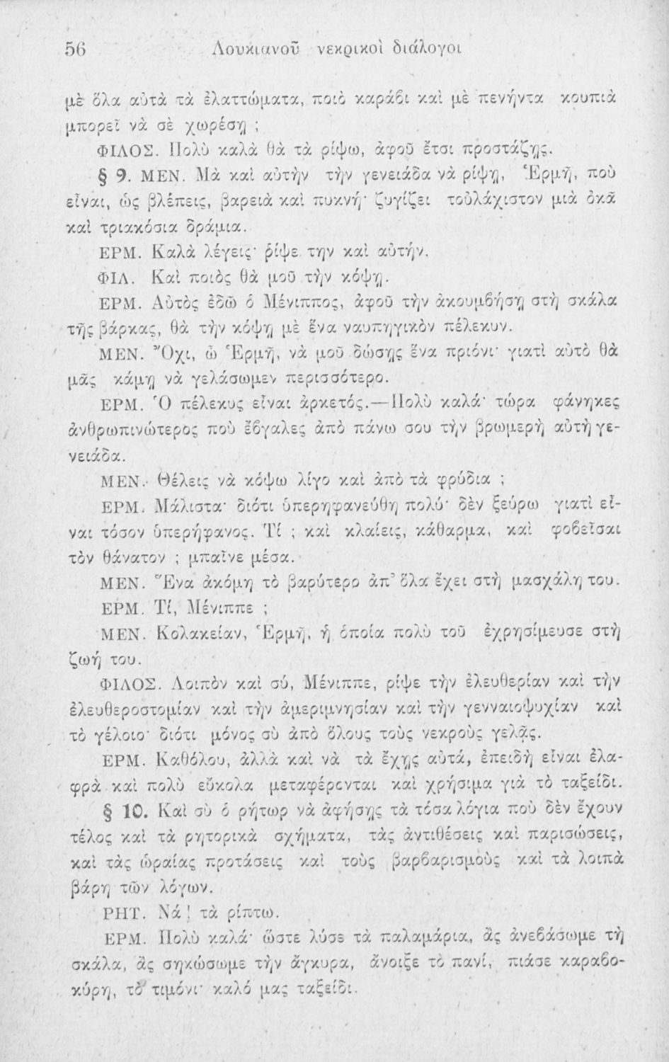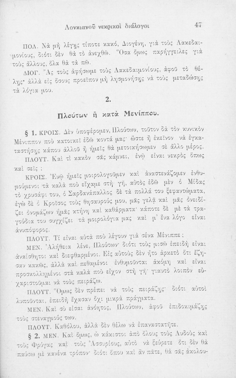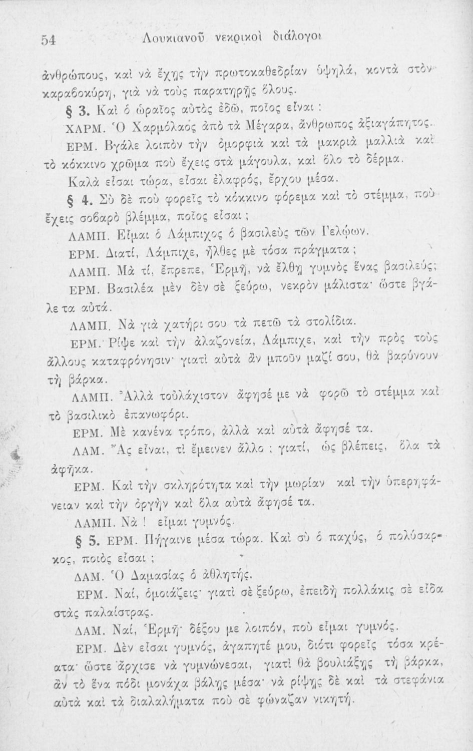 Σχολικό εγχειρίδιο Αρχαίων Ελληνικών για την Α΄ τάξη των Ημιγυμνασίων και Εξαταξίων Γυμνασίων που περιέχει αποσπάσματα από τους Νεκρικούς Διαλόγους του Λουκιανού και ετυμολογικές και πραγματολογικές σημειώσεις.
