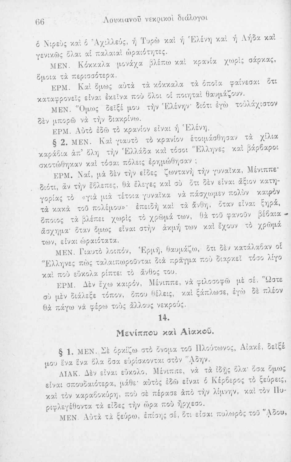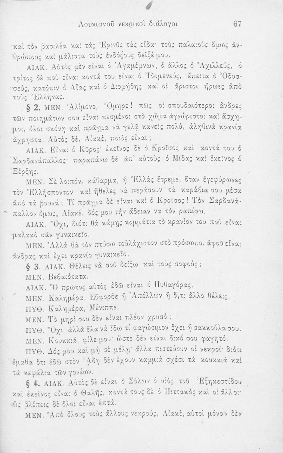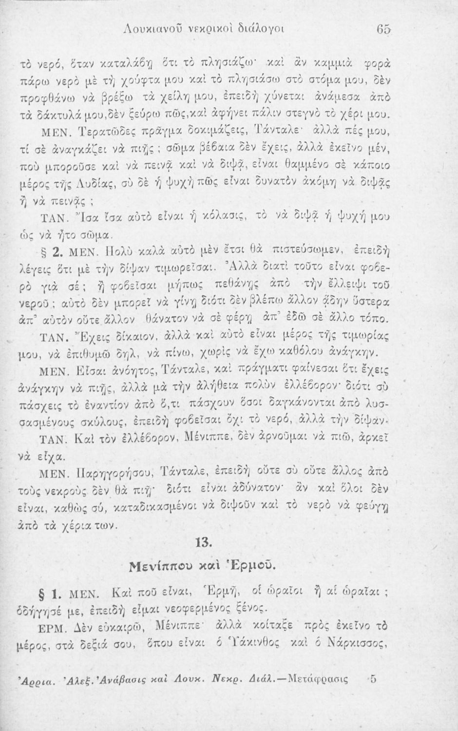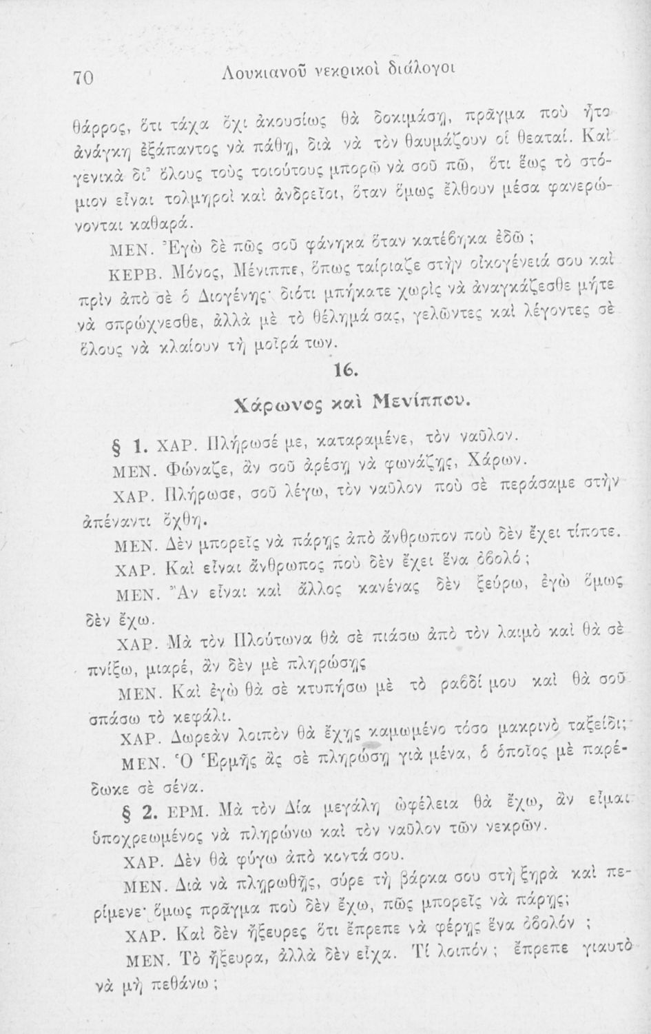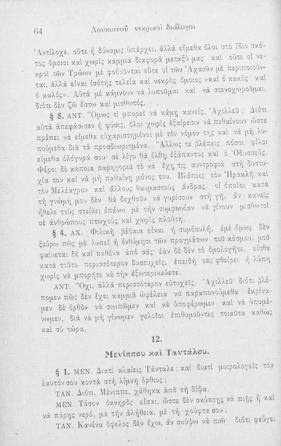 Σχολικό εγχειρίδιο Αρχαίων Ελληνικών για την Α΄ τάξη των Ημιγυμνασίων και Εξαταξίων Γυμνασίων που περιέχει αποσπάσματα από τους Νεκρικούς Διαλόγους του Λουκιανού και ετυμολογικές και πραγματολογικές σημειώσεις.