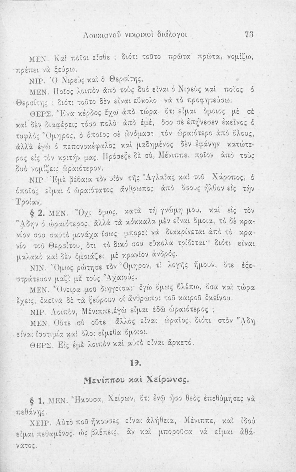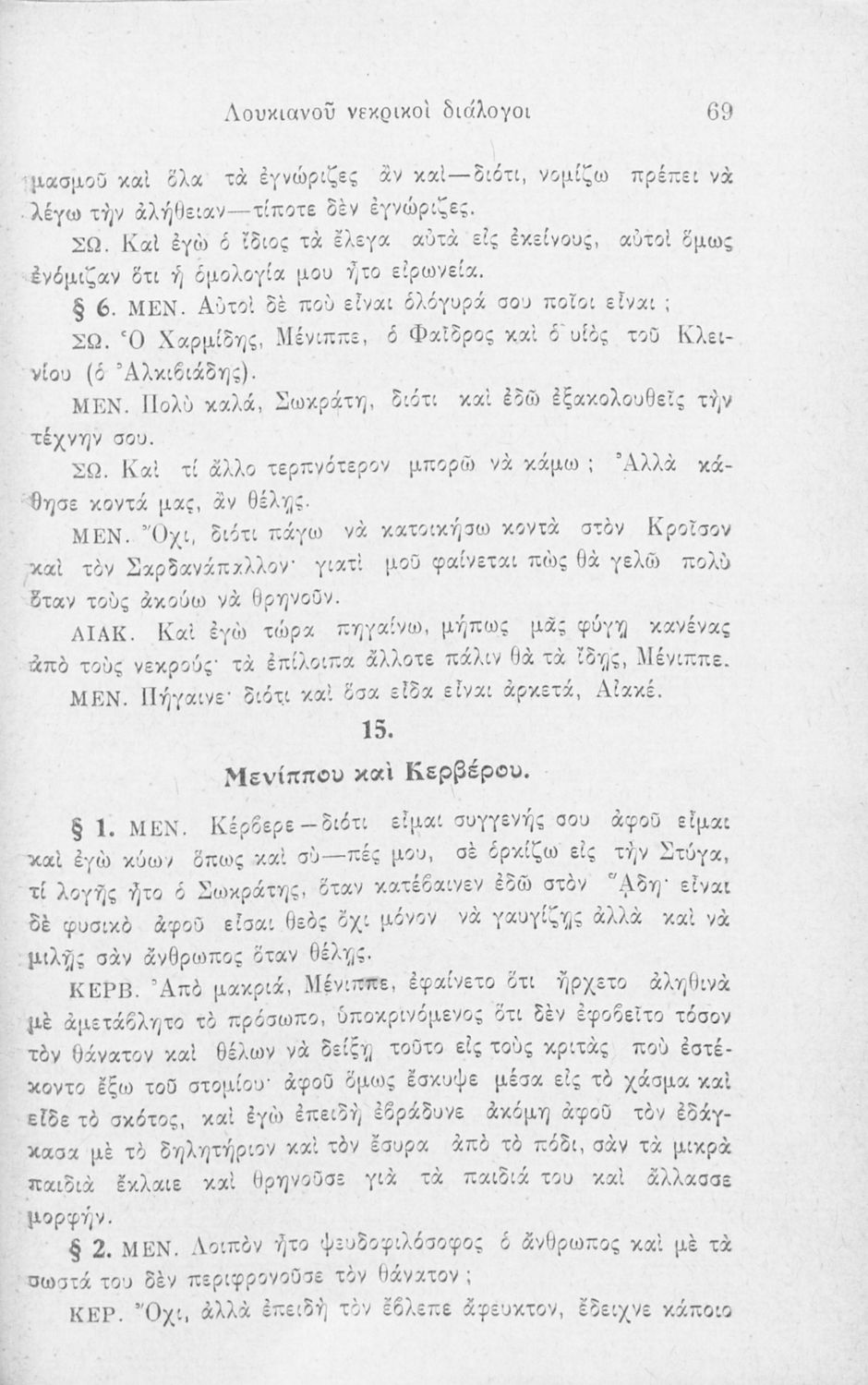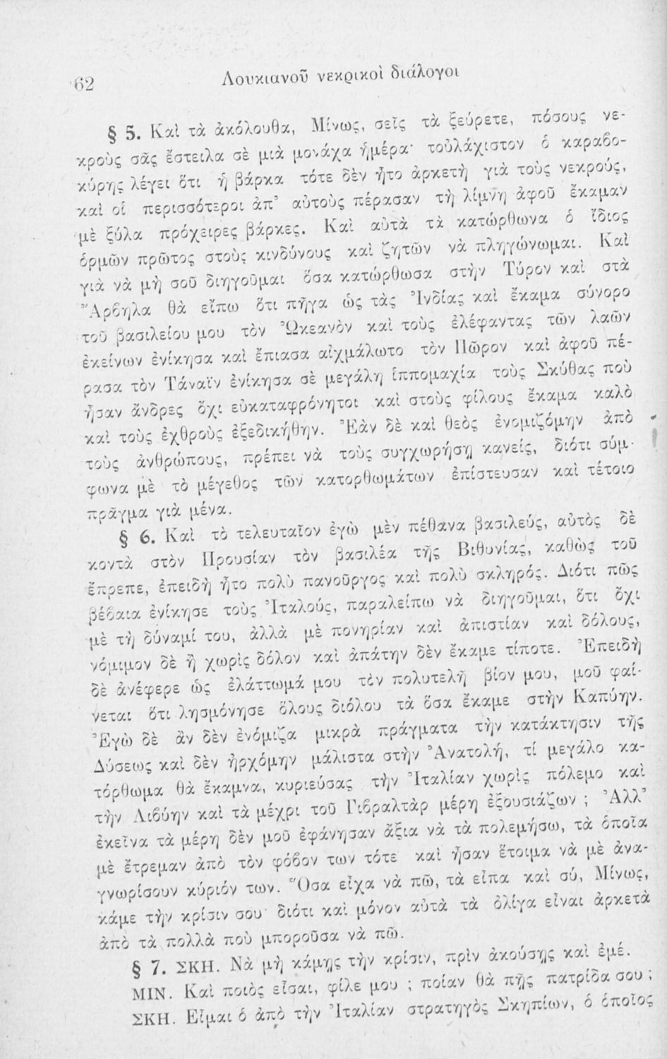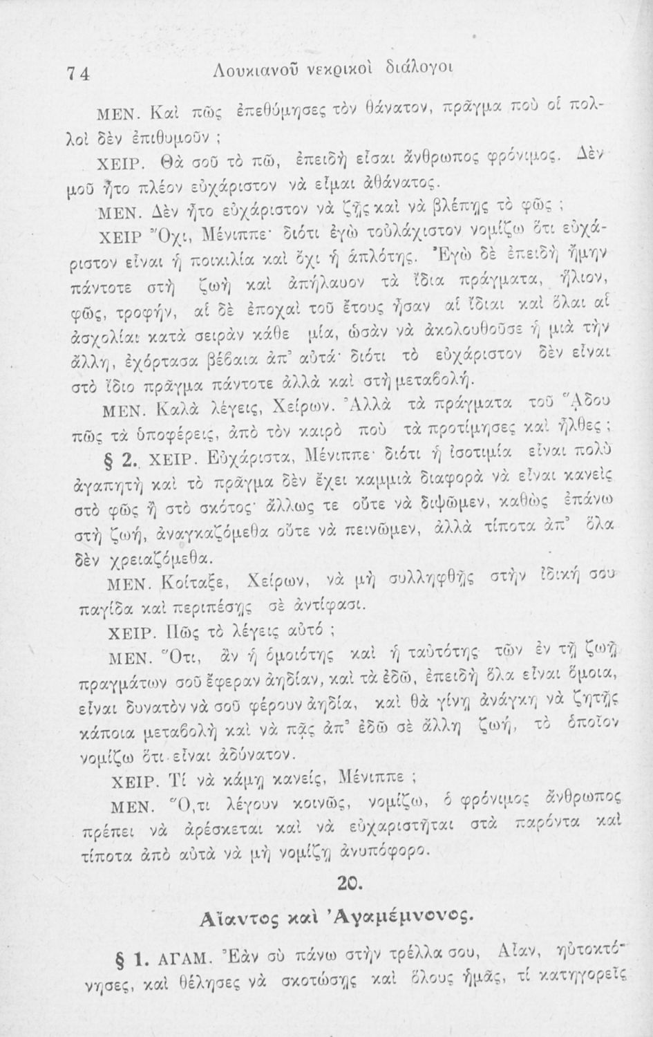 Σχολικό εγχειρίδιο Αρχαίων Ελληνικών για την Α΄ τάξη των Ημιγυμνασίων και Εξαταξίων Γυμνασίων που περιέχει αποσπάσματα από τους Νεκρικούς Διαλόγους του Λουκιανού και ετυμολογικές και πραγματολογικές σημειώσεις.