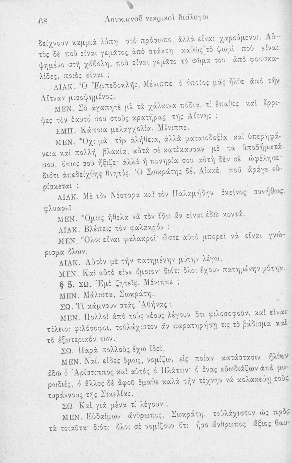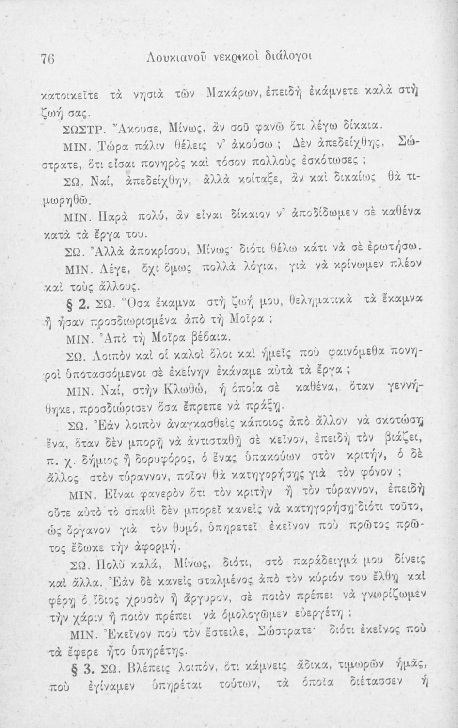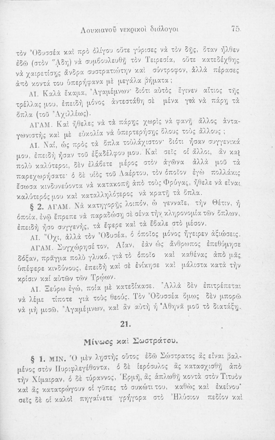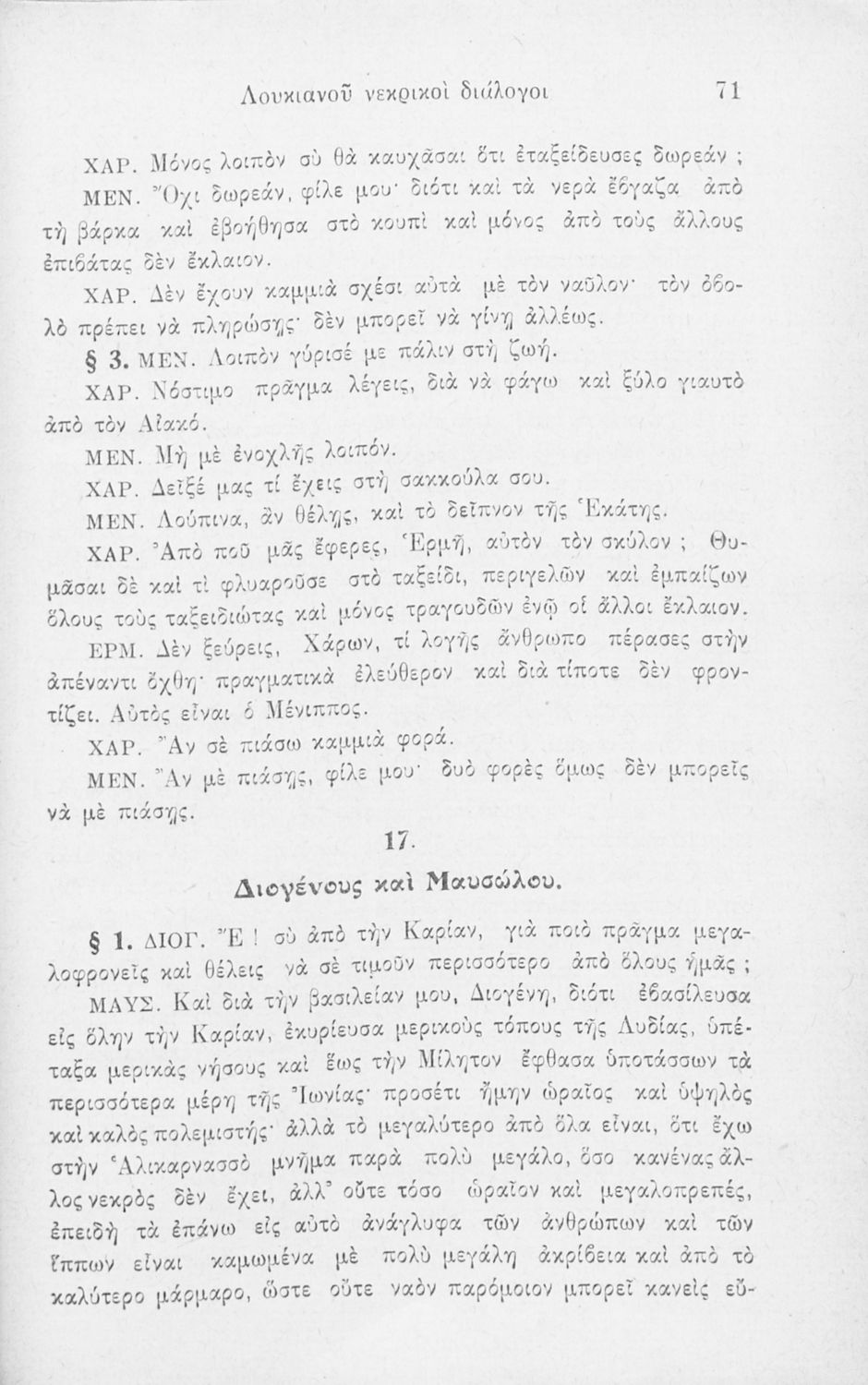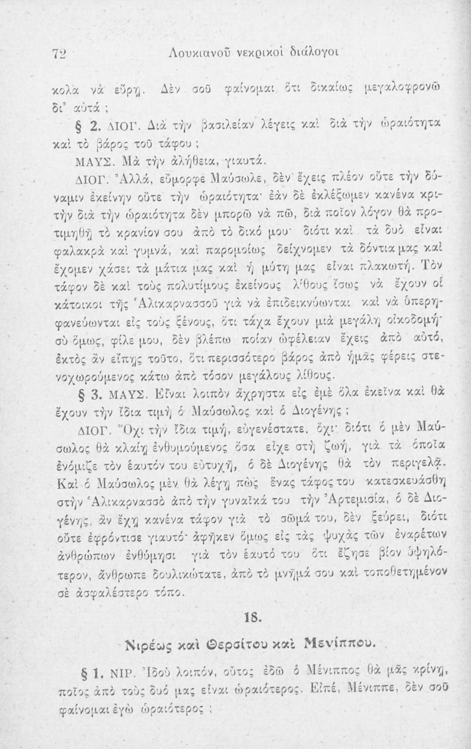 Σχολικό εγχειρίδιο Αρχαίων Ελληνικών για την Α΄ τάξη των Ημιγυμνασίων και Εξαταξίων Γυμνασίων που περιέχει αποσπάσματα από τους Νεκρικούς Διαλόγους του Λουκιανού και ετυμολογικές και πραγματολογικές σημειώσεις.