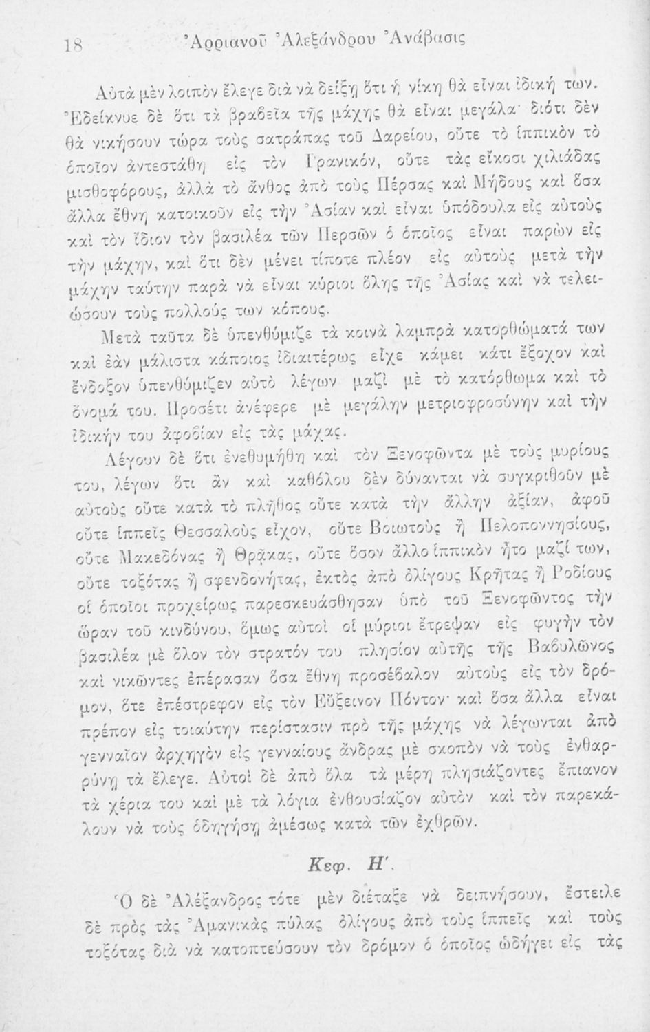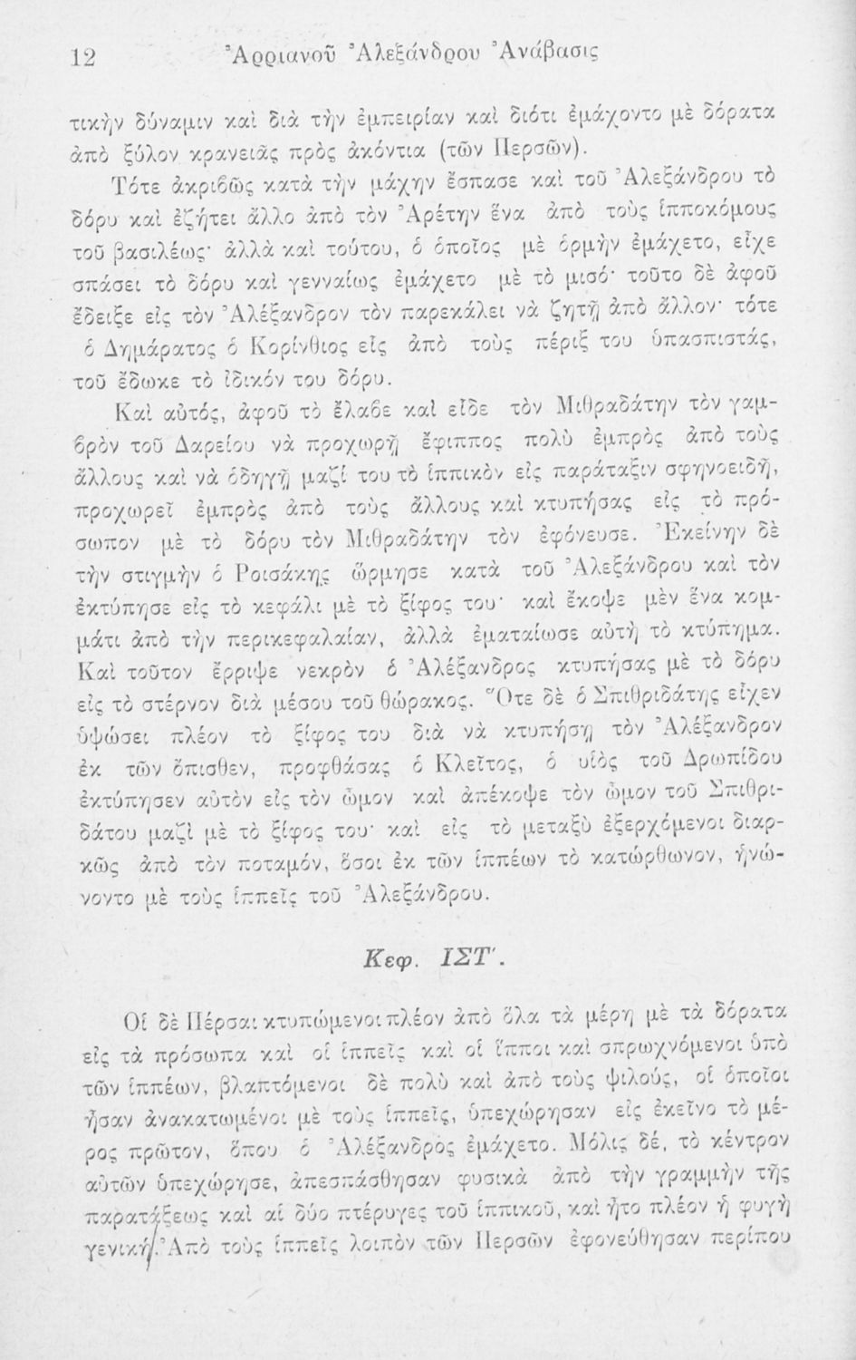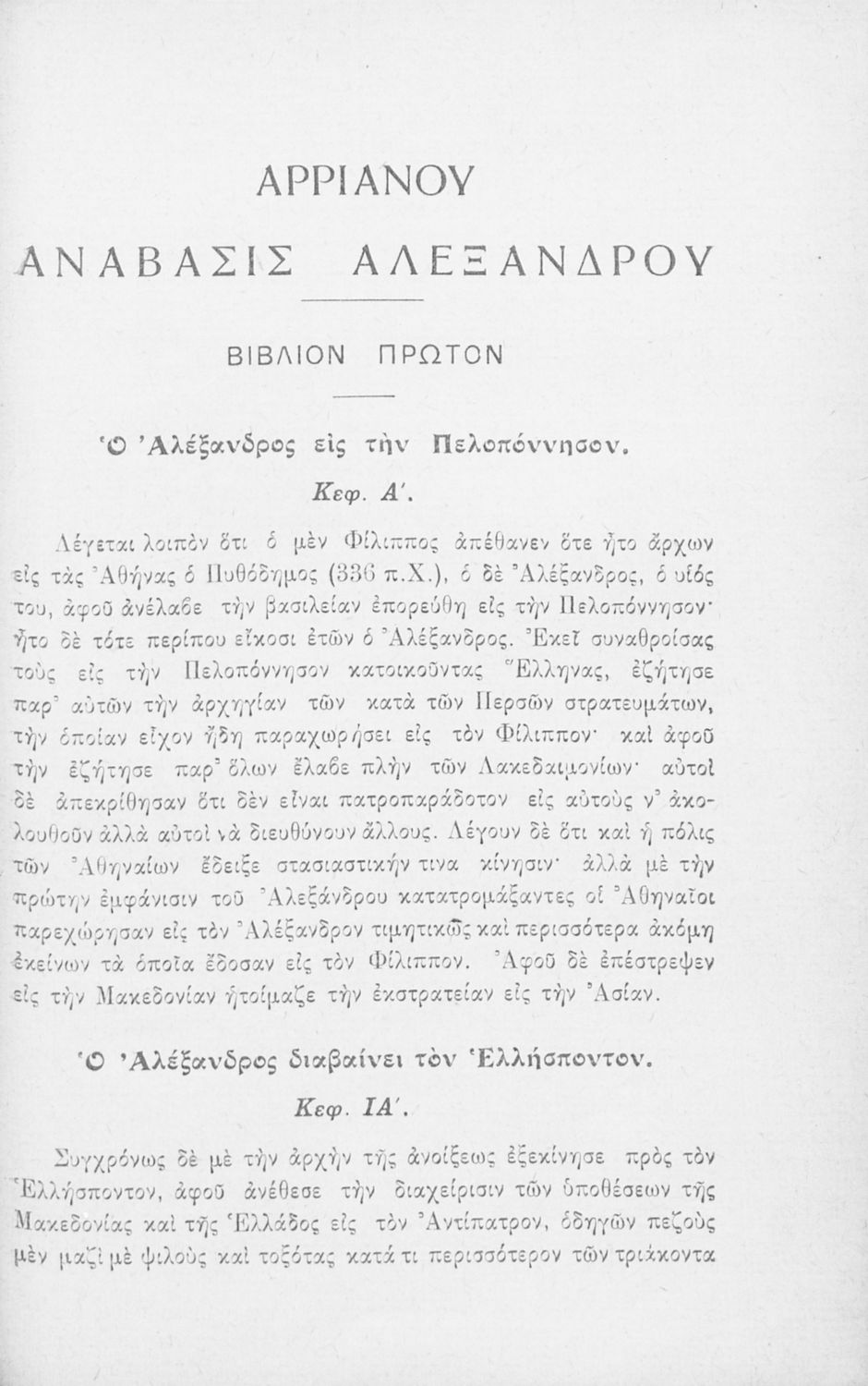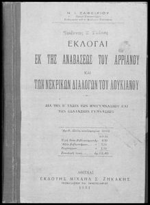 Σχολικό εγχειρίδιο Αρχαίων Ελληνικών Β΄ Γυμνασίου που περιλαμβάνει σύντομο βιογραφικό σημείωμα των Αρριανού και Λουκιανού, εισαγωγή στα έργα, αποσπάσματα από το πρώτο και δεύτερο βιβλίο της Ανάβασης του Αλέξανδρου και του Νεκρικούς Διαλόγους και ετυμολογικές σημειώσεις.