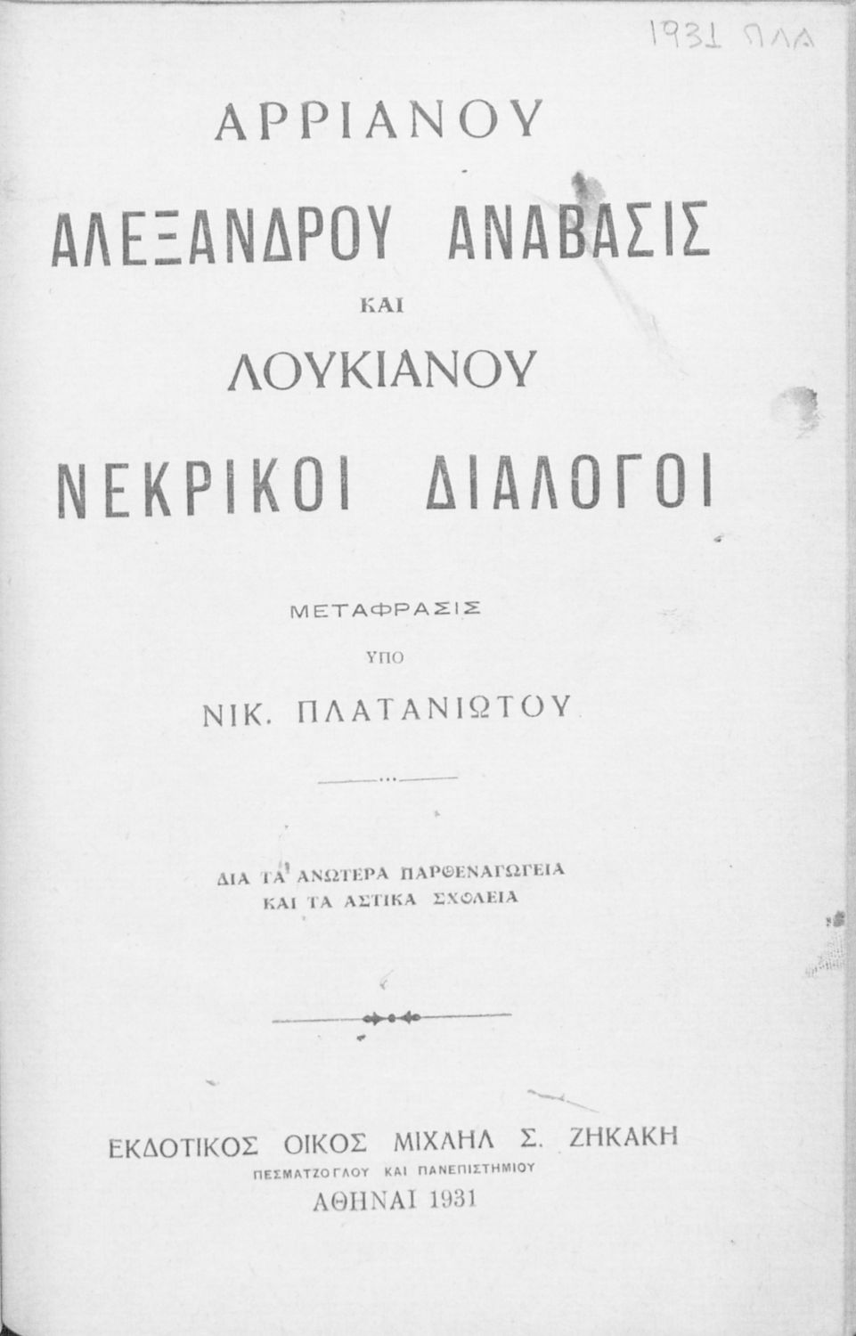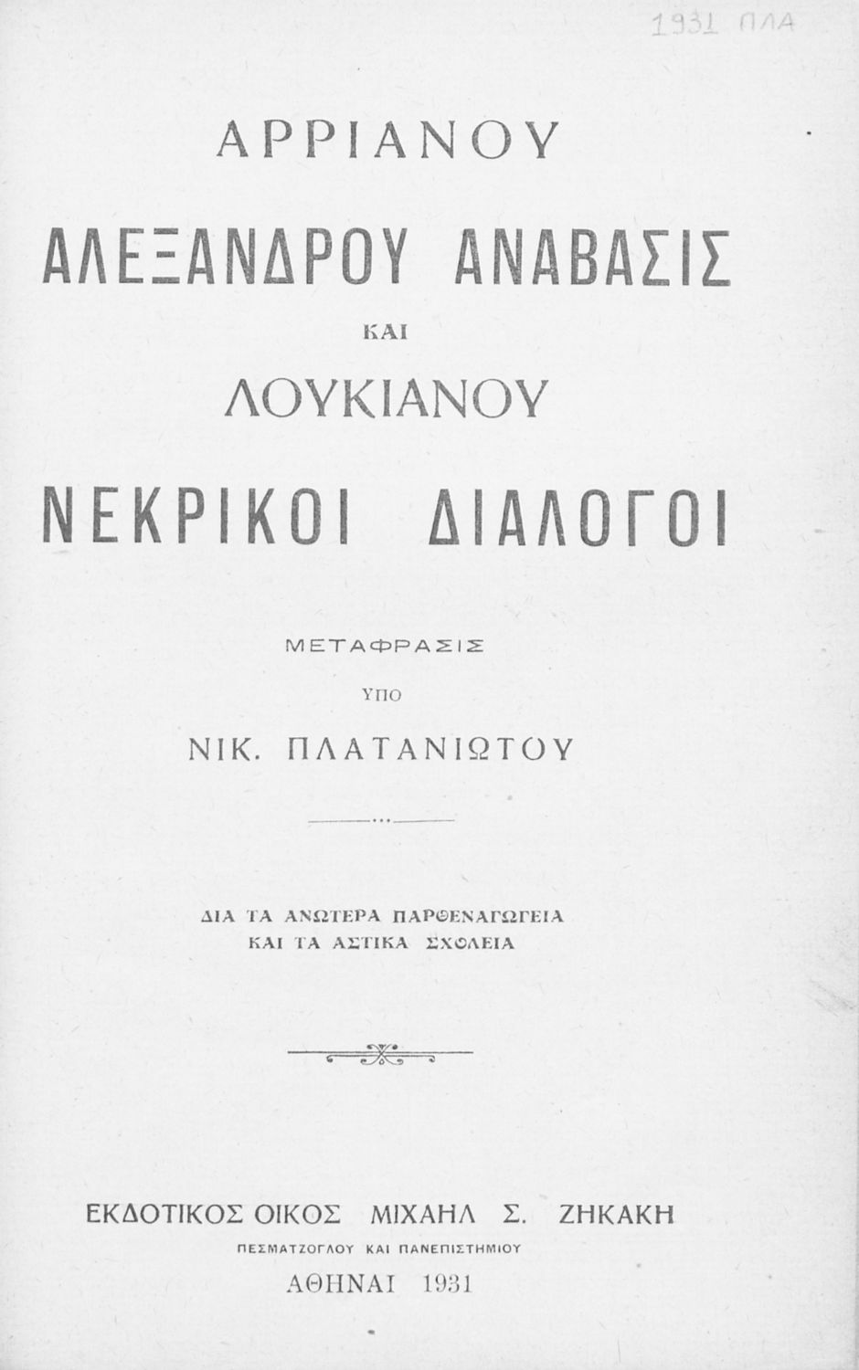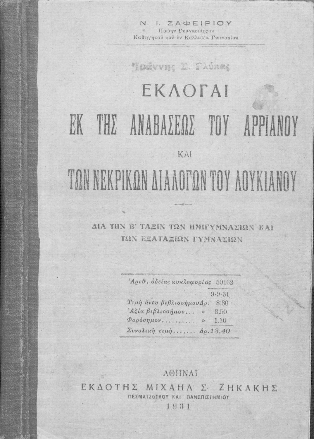 Εκδότης: Μιχαήλ Σ. Ζηκάκης Έτος έκδοσης: 1931 Τόπος έκδοσης: Αθήνα Υπουργική απόφαση / Σύμβαση: 34942/7-8-1931 |