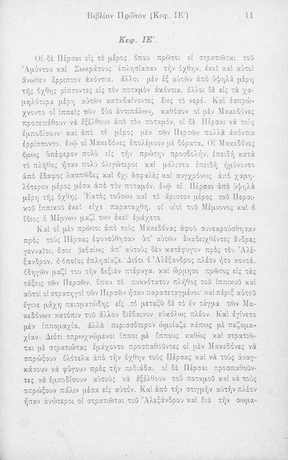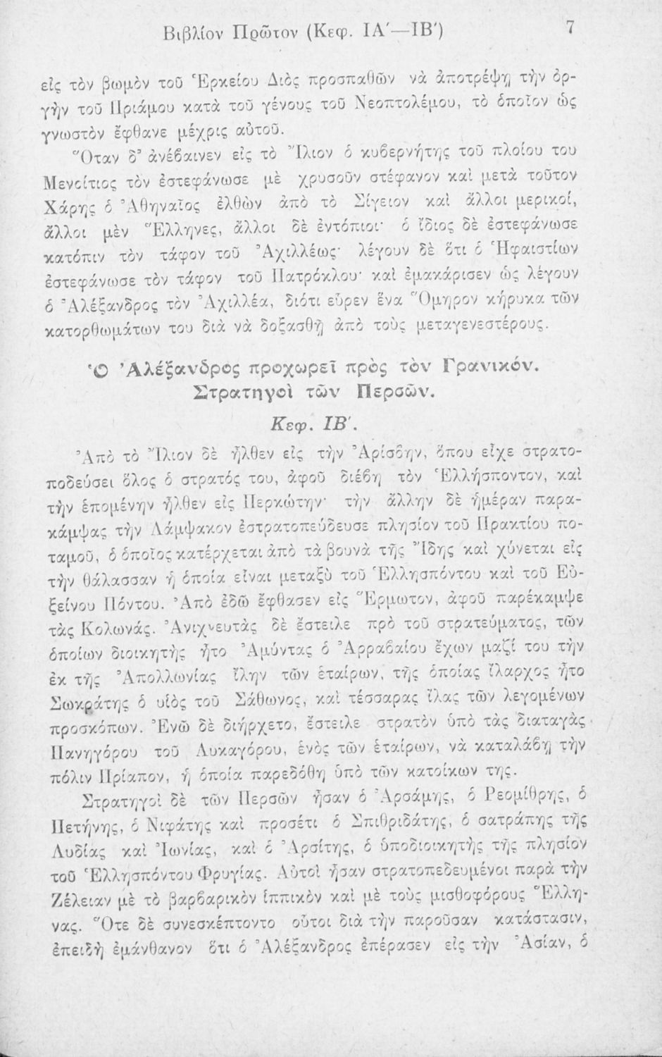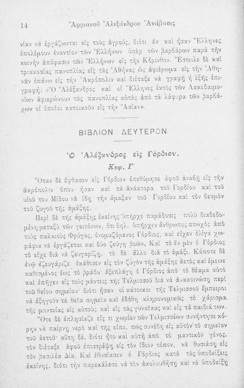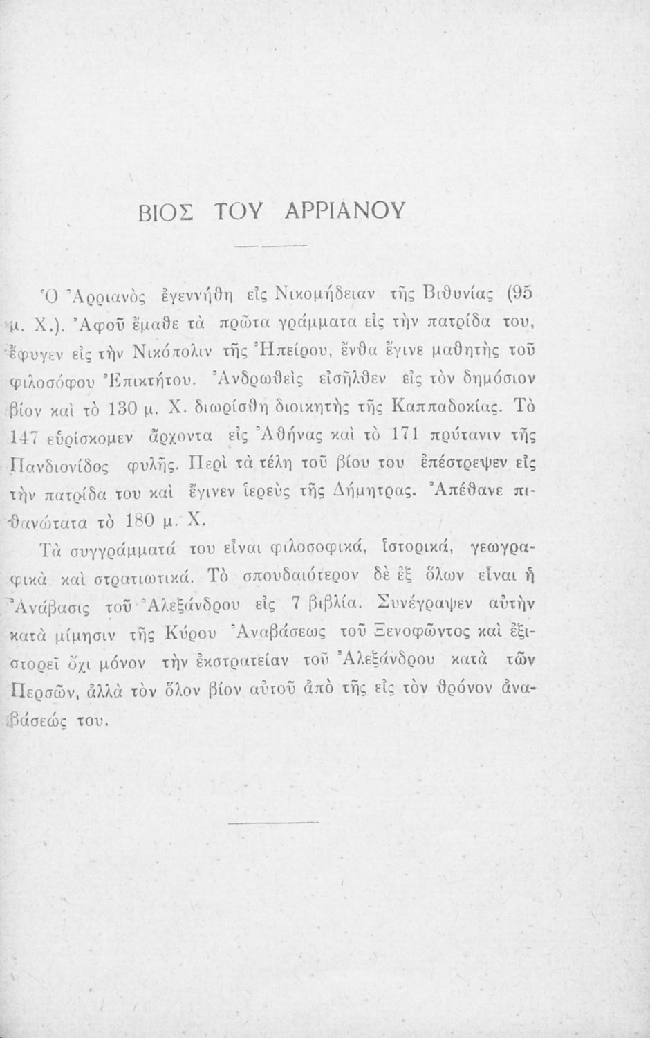 Βαθμίδα εκπαίδευσης: Δευτεροβάθμια Τάξη: Β' Γυμνασίου Μάθημα: Αρχαία Ελληνικά Γλώσσα: Καθαρεύουσα Παρουσίαση περιεχομένου: Σχολικό εγχειρίδιο Αρχαίων Ελληνικών Β΄ Γυμνασίου που περιλαμβάνει σύντομο βιογραφικό σημείωμα των Αρριανού και Λουκιανού, εισαγωγή στα έργα, αποσπάσματα από το πρώτο και δεύτερο βιβλίο της Ανάβασης του Αλέξανδρου και του Νεκρικούς Διαλόγους και ετυμολογικές σημειώσεις. |