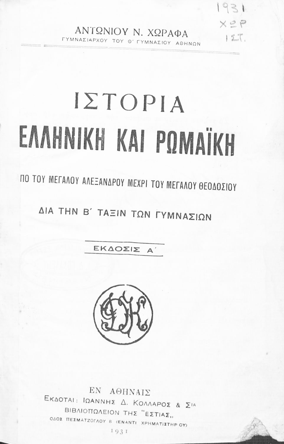 Εκδότης: Ιωάννης Δ. Κολλάρος και ΣΙΑ Έτος έκδοσης: 1931 Τόπος έκδοσης: Αθήνα Έκδοση: 1η |
