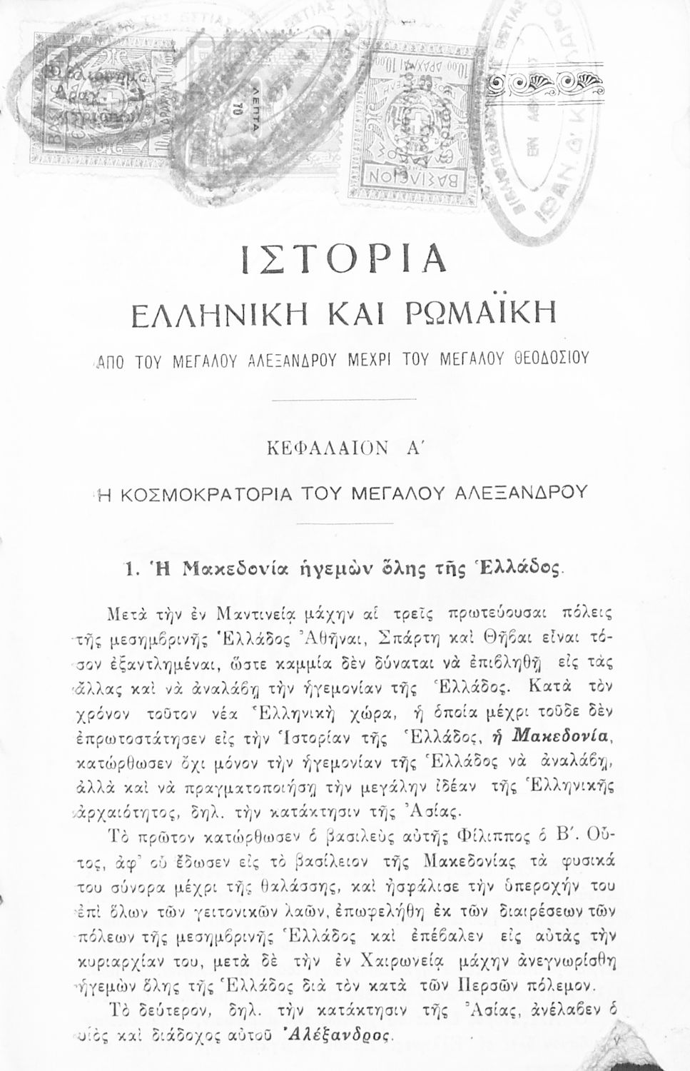 Κωδικός αναγνώρισης: 02-01550 Τίτλος: Ιστορία Ελληνική και Ρωμαϊκή από του Μεγάλου Αλεξάνδρου μέχρι του Μεγάλου Θεοδοσίου δια την Β΄ τάξιν των Γυμνασίων Συγγραφέας: Αντώνιος Χωραφάς Μέγεθος και υπόστρωμα: Σχολικό εγχειρίδιο, σκληρό εξώφυλλο, 188 σελίδες. Εικόνες (ασπρόμαυρες), σκίτσα (ασπρόμαυρα), χάρτες (ασπρόμαυροι). |