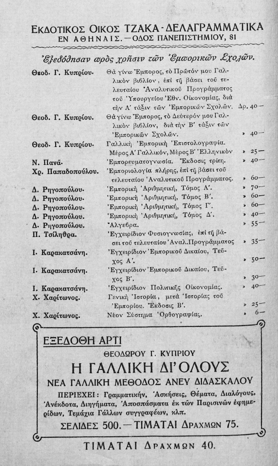 Εκδότης: Δημ. Ν. Τζάκας, Στεφ. Δελαγραμμάτικας και ΣΙΑ Έτος έκδοσης: 1930 Τόπος έκδοσης: Αθήνα Έτος έγκρισης: 1929 |