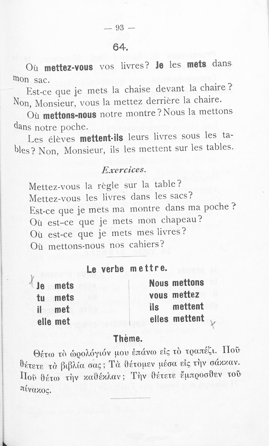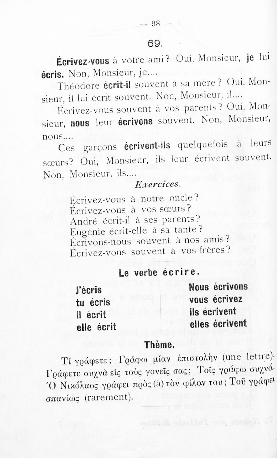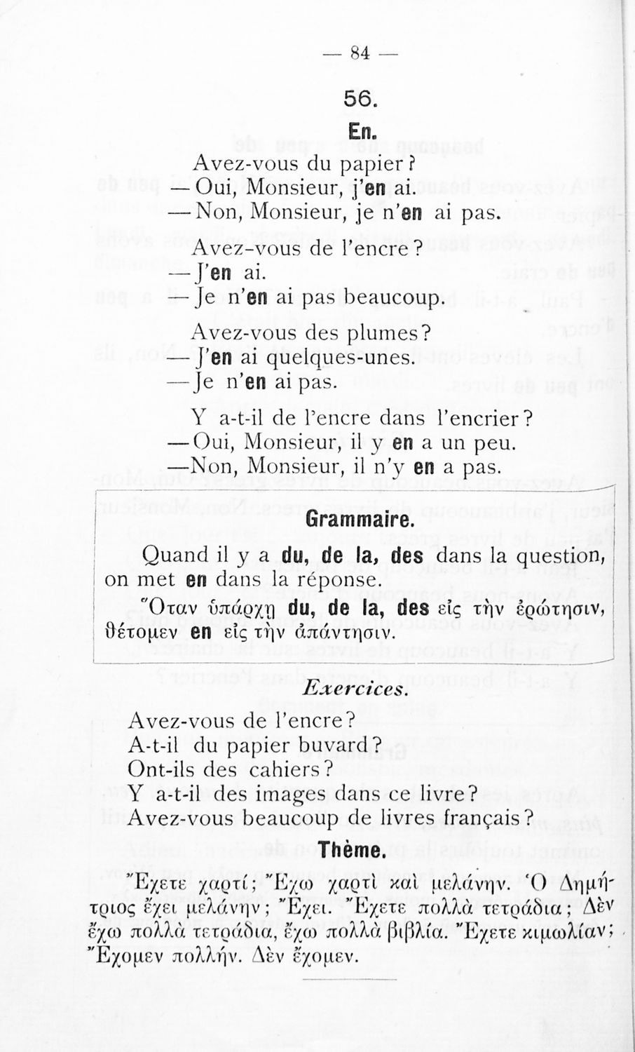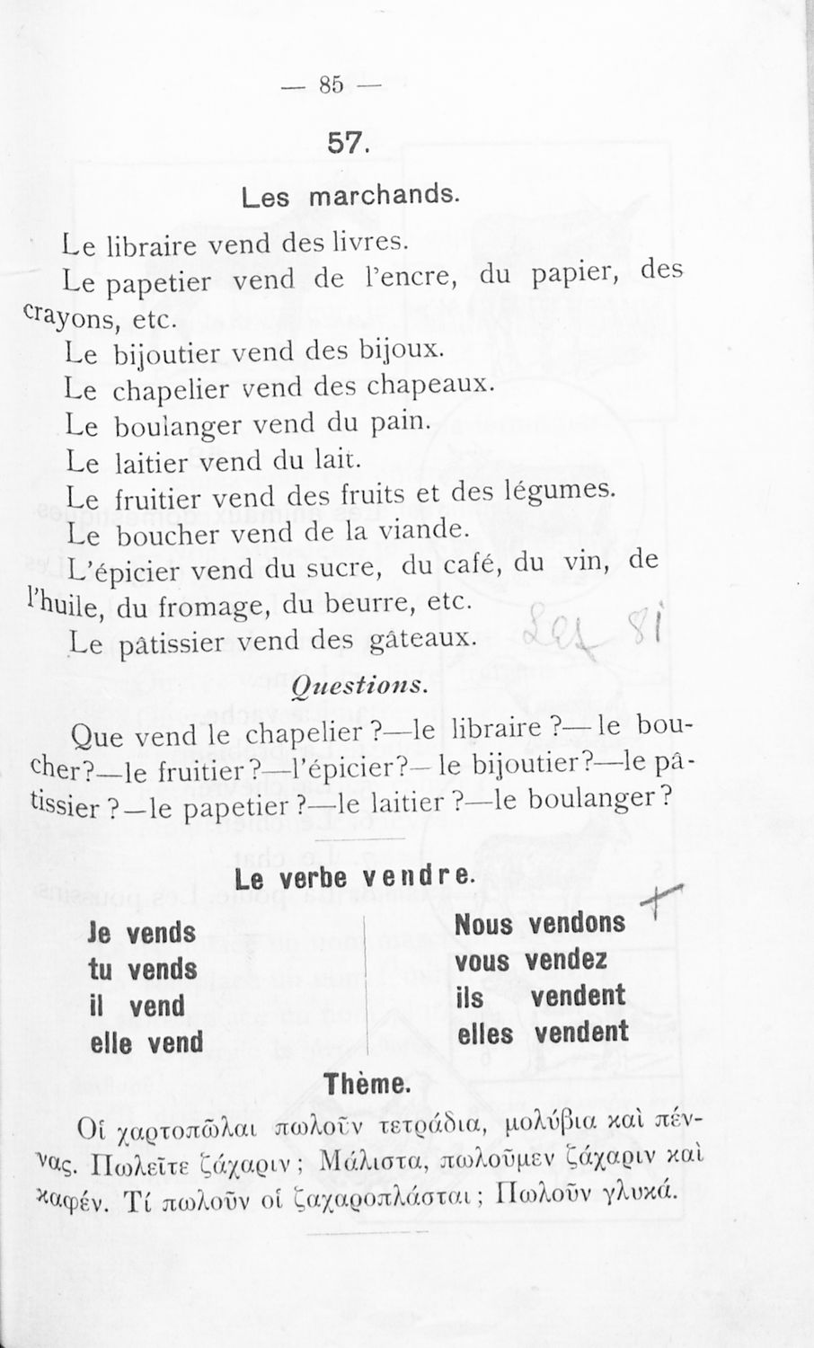 Σχολικό εγχειρίδιο Γαλλικών για τις Εμπορικές Σχολές που περιέχει τους βασικούς κανόνες γραμματικής, συντακτικού και λεξιλογίου, κείμενα που αντλούν τα θέματά τους από την ύπαιθρο και την οικογενειακή και κοινωνική ζωή και κατάλογο λεξιλογίου.