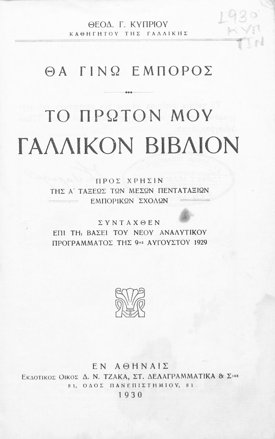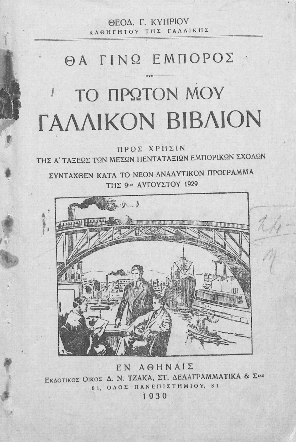 Τίτλος: Θα γίνω έμπορος, Το πρώτον μου γαλλικόν βιβλίον προς χρήσιν της Α΄ τάξεως των Μέσων Πενταταξίων Εμπορικών Σχολών