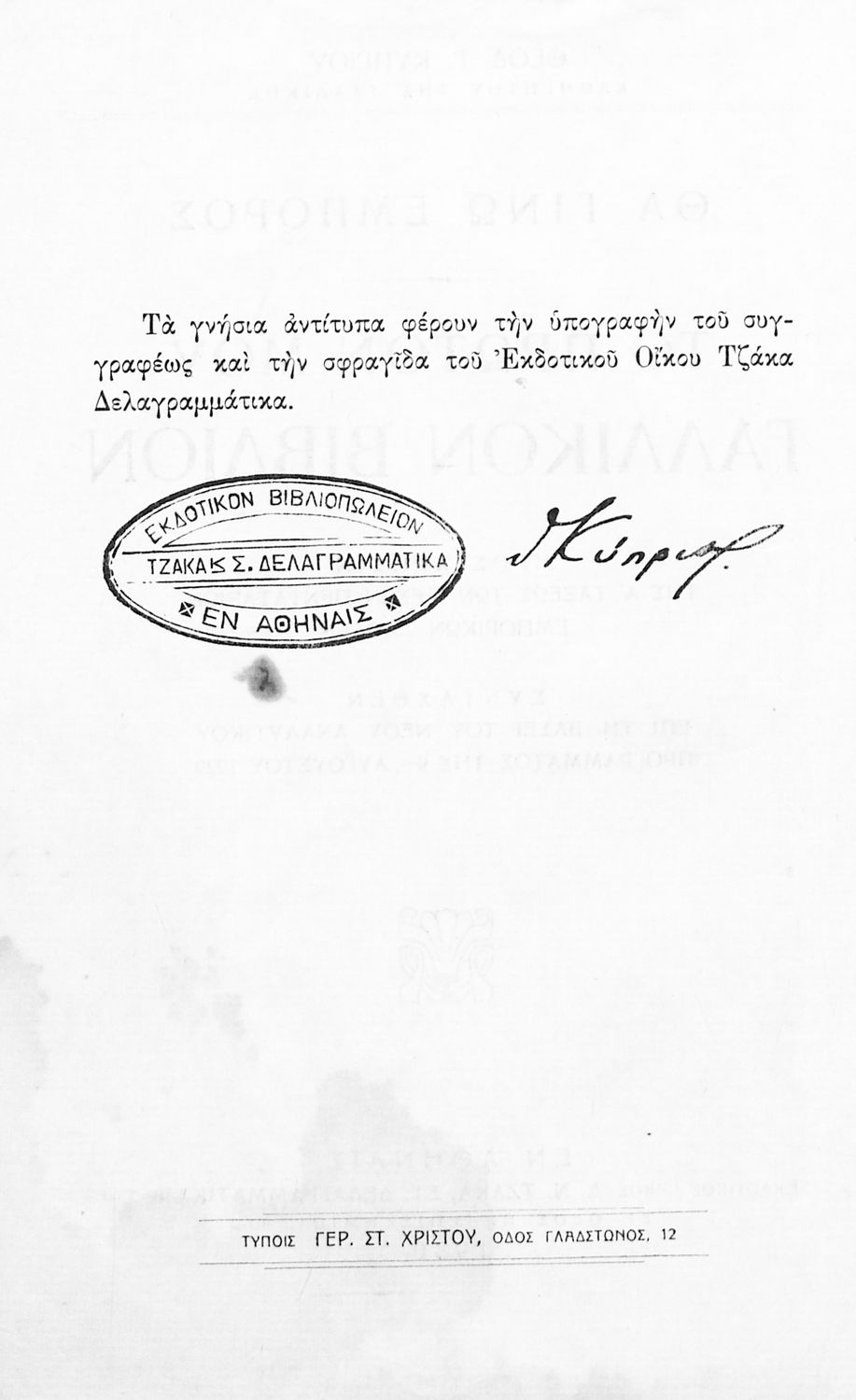 Εκδότης: Δημ. Ν. Τζάκας, Στεφ. Δελαγραμμάτικας και ΣΙΑ