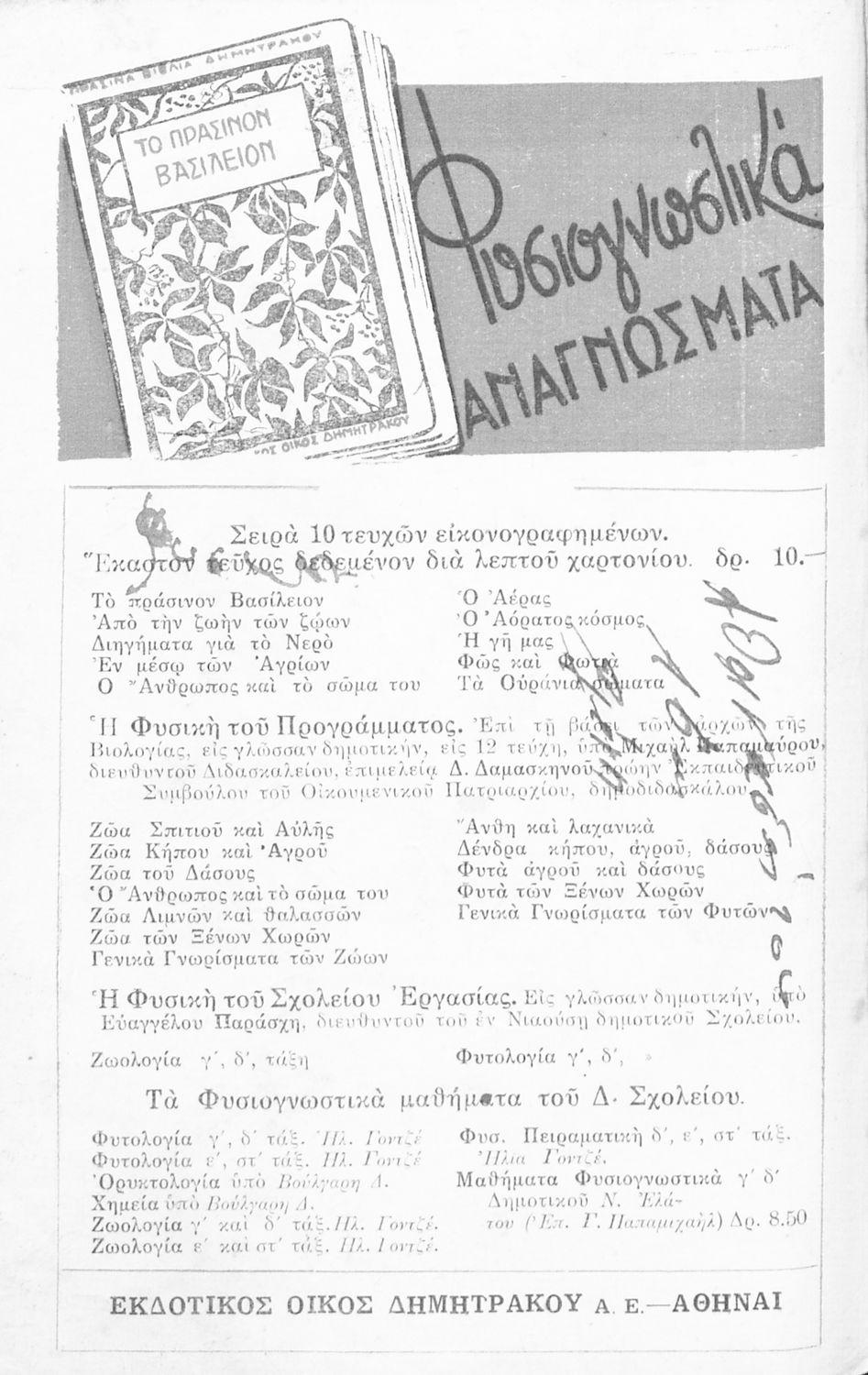 Μαθητικό βοήθημα της Α΄ Τάξης των Εξαταξίων Εμπορικών Σχολών. Περιέχει πληροφορίες για το μάθημα της φυσικής, ζωολογίας και ορυκτολογίας. Έχει ασκήσεις εμπέδωσης.