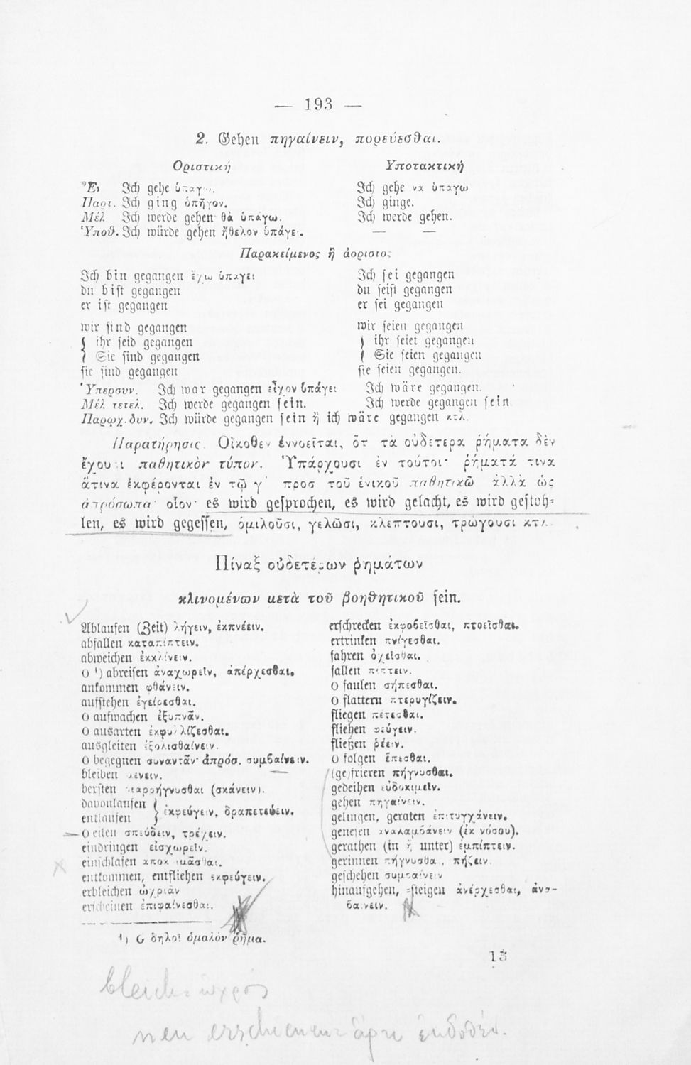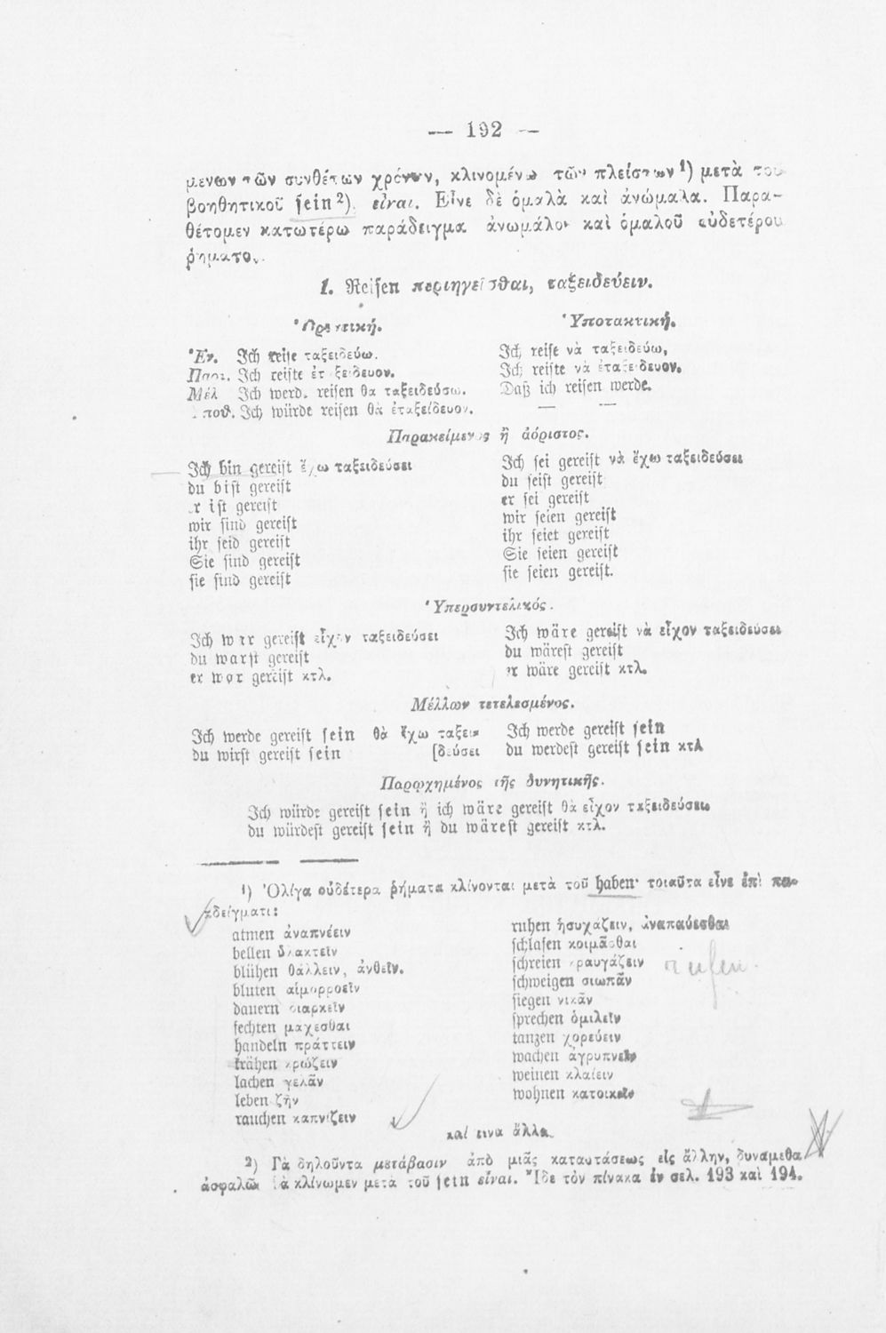 Πρόκειται για εγχειρίδιο που στόχο είχε την εκμάθηση των γραμματικών και συντακτικών φαινομένων της Γερμανικής γλώσσας με στόχο την ταχεία εκμάθησή της από Ελληνικό πληθυσμό. Φέρει λίγες προσωπικές σημειώσεις ...