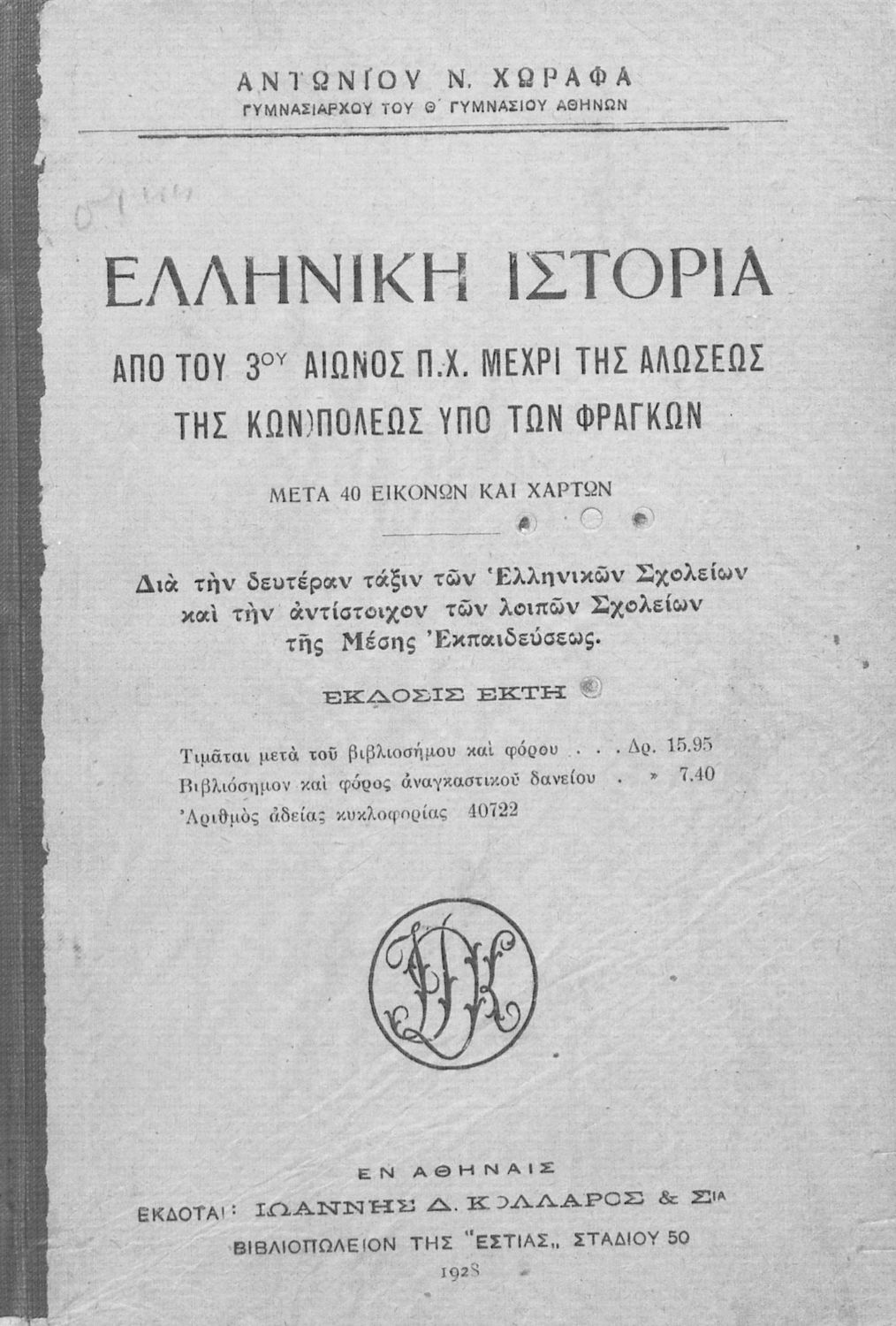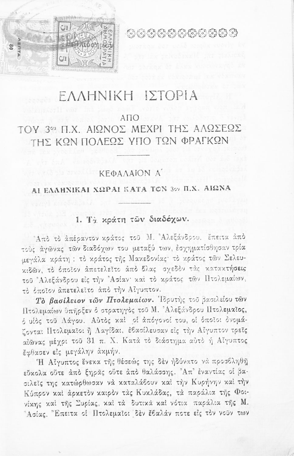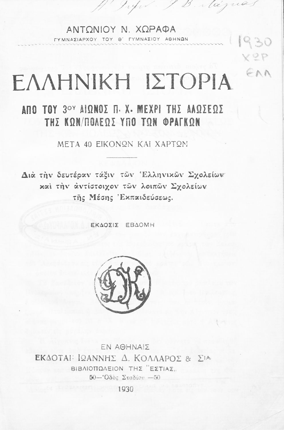 245 0# _aΕλληνική ιστορία από του 3ου αιώνος π. Χ. μέχρι της Αλώσεως της Κωνσταντινουπόλεως υπό των Φράγκων δια την δευτέραν τάξιν των Ελληνικών Σχολείων και την αντίστοιχον των λοιπών σχολείων της Μέσης Εκπαιδεύσεως
