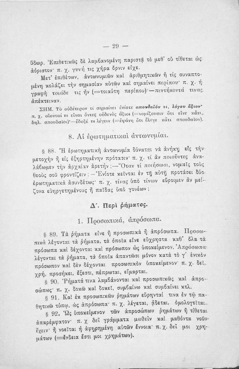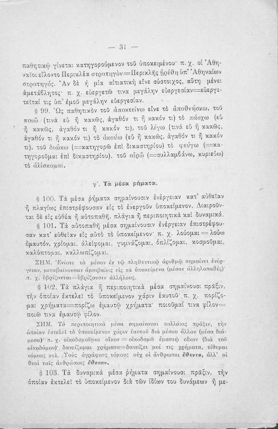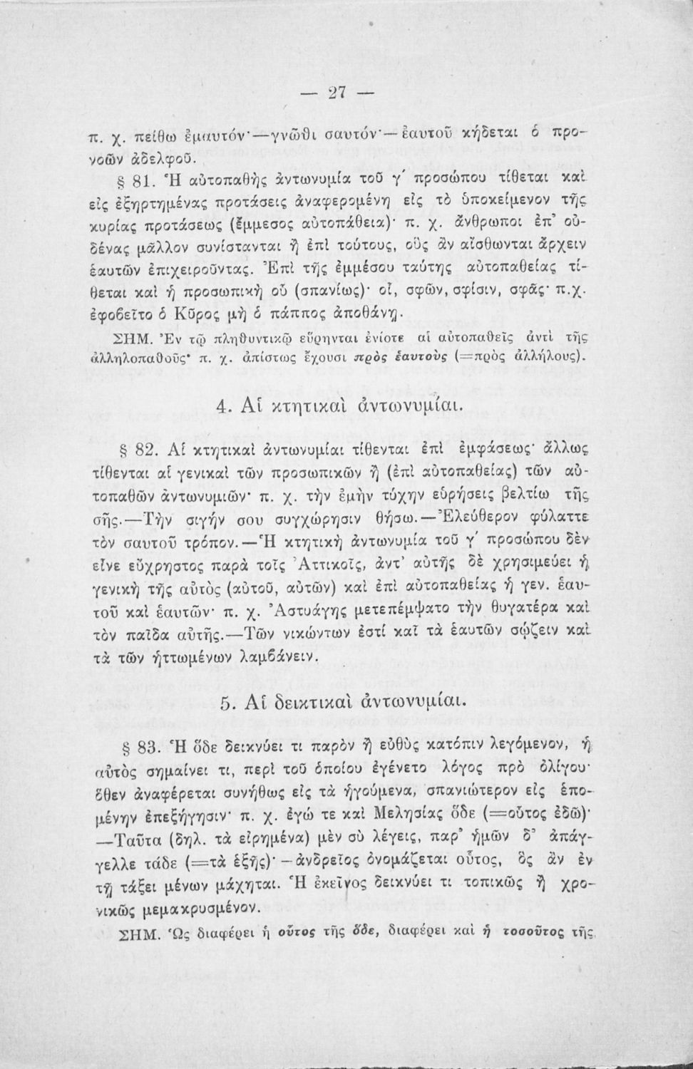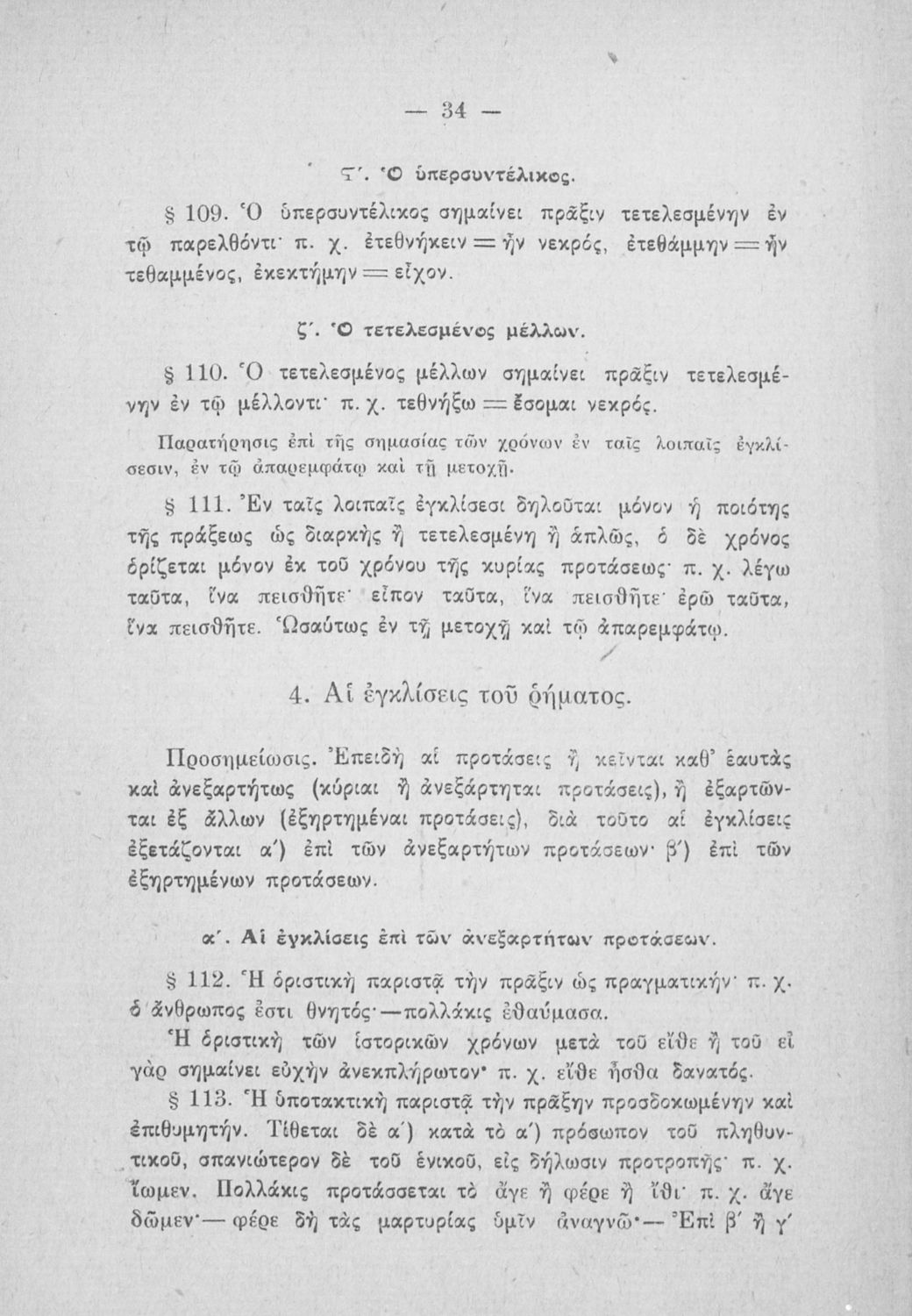Σχολικό εγχειρίδιο Αρχαίων Ελληνικών για τα Ελληνικά Σχολεία και τα Ανώτερα Παρθεναγωγεία που εξετάζει τα μέρη του λόγου και την σύνταξή τους.