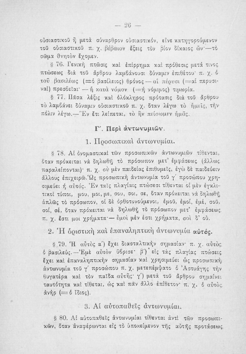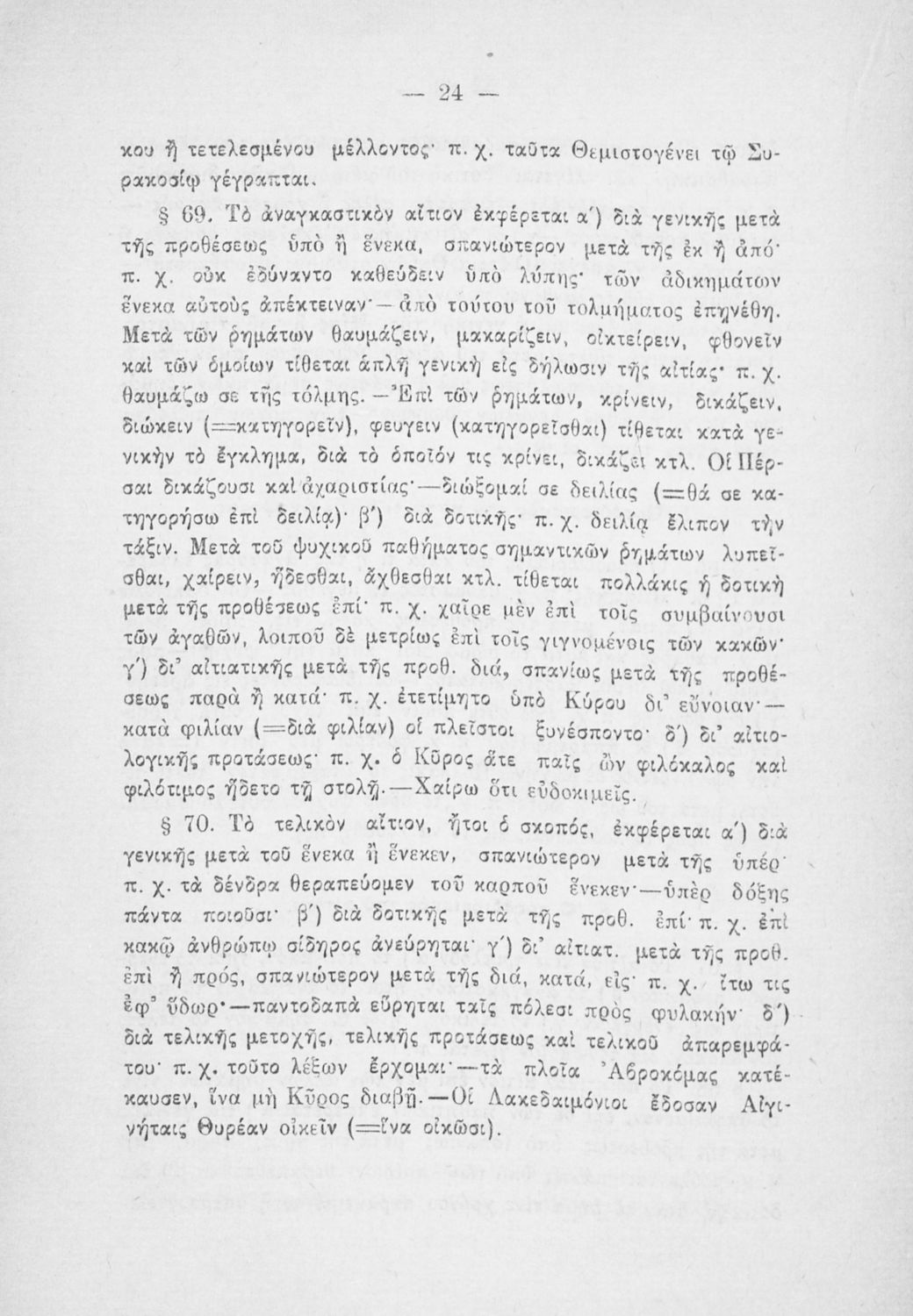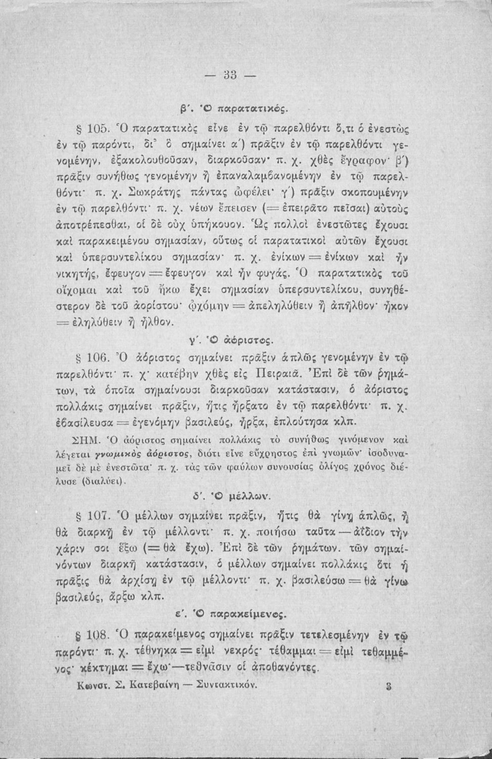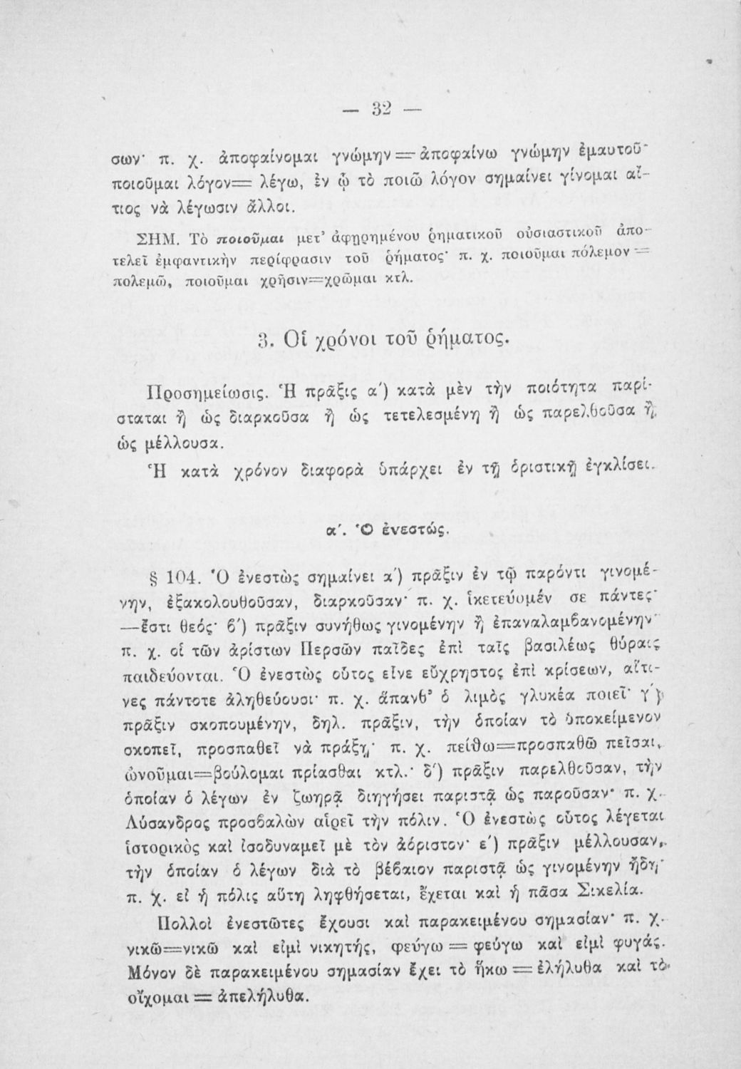 Σχολικό εγχειρίδιο Αρχαίων Ελληνικών για τα Ελληνικά Σχολεία και τα Ανώτερα Παρθεναγωγεία που εξετάζει τα μέρη του λόγου και την σύνταξή τους.