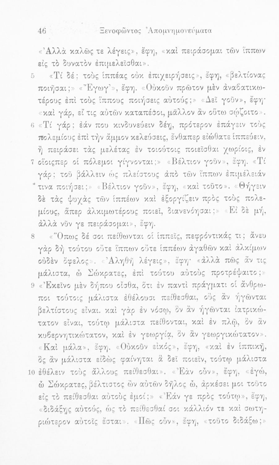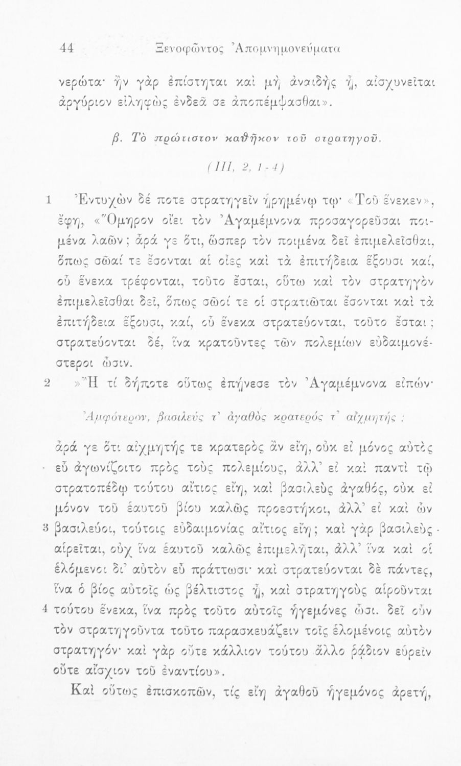 Σχολικό εγχειρίδιο Αρχαίων Ελληνικών Β΄ Γυμνασίου που περιλαμβάνει αποσπάσματα από τα Απομνημονεύματα του Ξενοφώντα, εισαγωγικά σχόλια για στη ζωή και το έργο του, ερμηνευτικές σημειώσεις και πραγματολογικά και γραμματικά σχόλια.
