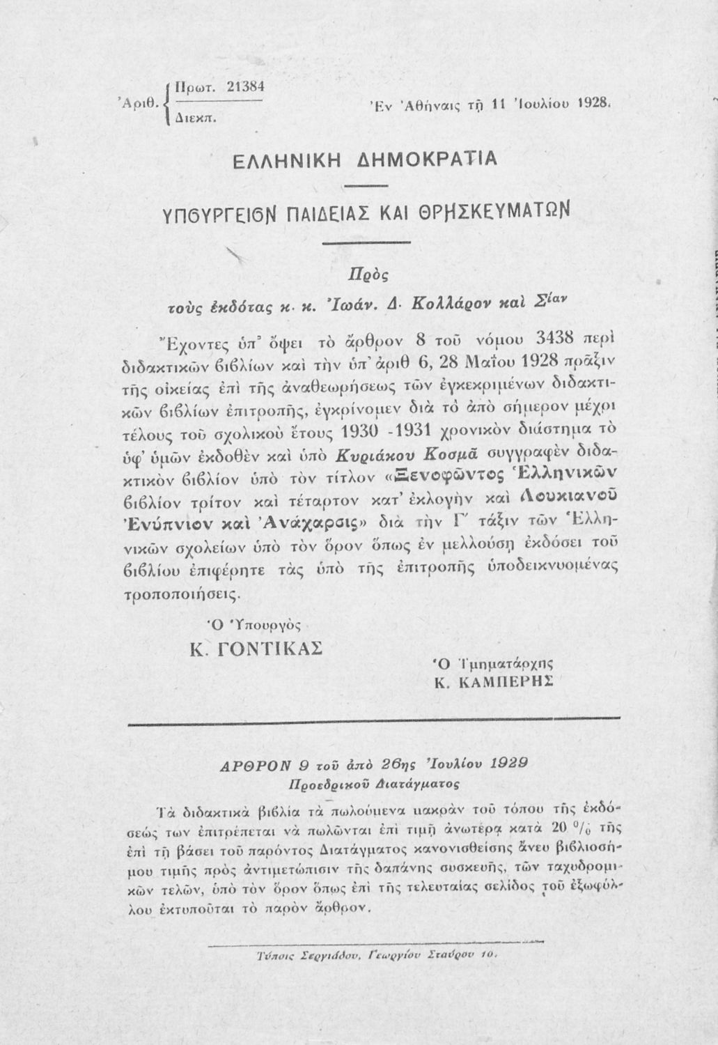 Υπουργική απόφαση / Σύμβαση: 21384/11-7-1928