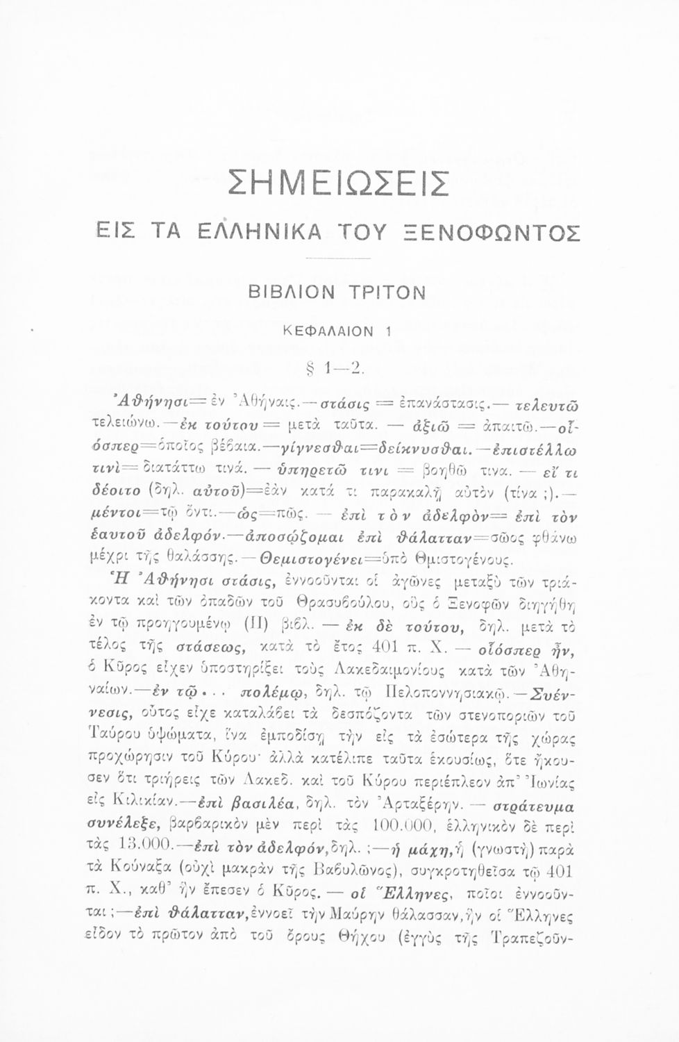 Σχολικό εγχειρίδιο Αρχαίων Ελληνικών για τις Γ΄ Ελληνικού Σχολείου και Α΄ Αστικού Σχολείου Θηλέων που περιλαμβάνει το έργο του Ξενοφώντα Κύρου Ανάβασις, ερμηνευτικά και πραγματολογικά σχόλια και λεξιλογικές ...