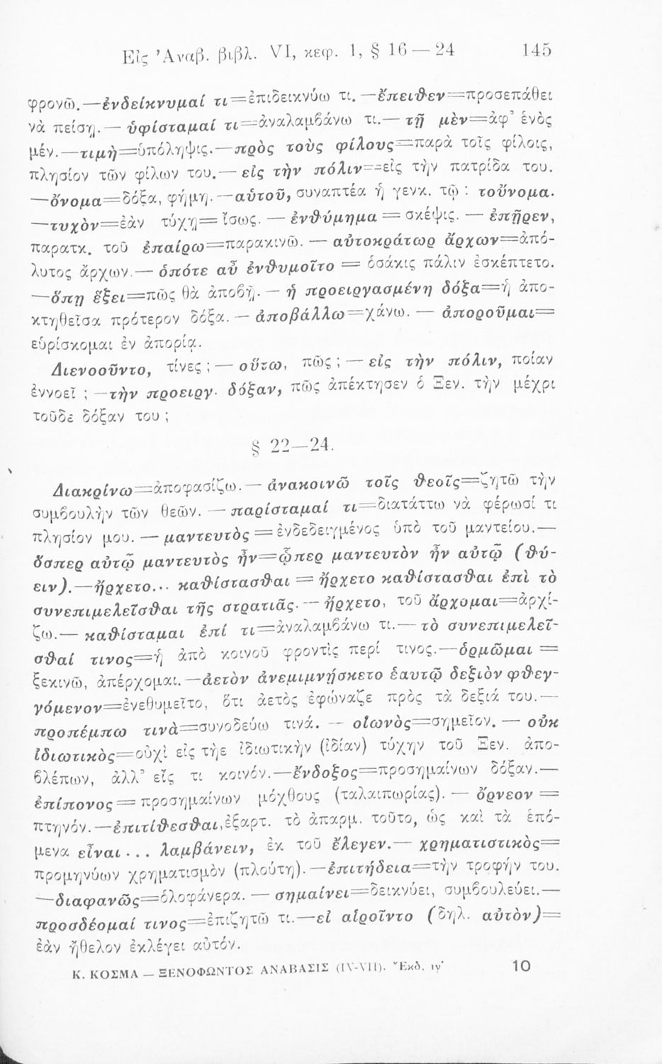 Σχολικό εγχειρίδιο Αρχαίων Ελληνικών για τις Γ΄ Ελληνικών Σχολείων και Α΄ Αστικών Σχολείων των Θηλέων που περιλαμβάνει το έργο του Ξενοφώντα Κύρου Ανάβασις, εισαγωγικά σχόλια για τη ζωή και το έργο του, ερμηνευτικές και γραμματικές παρατηρήσεις.
