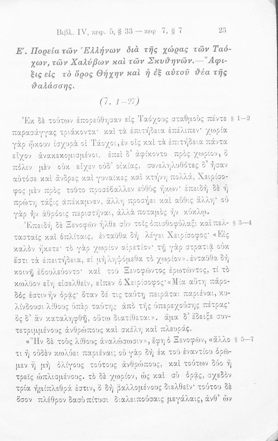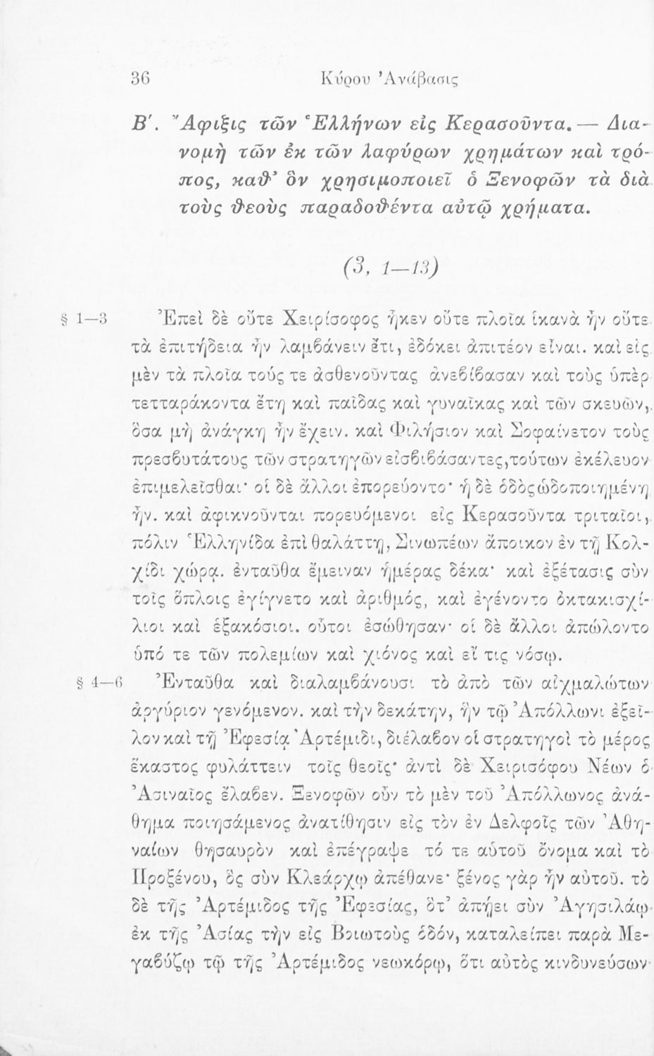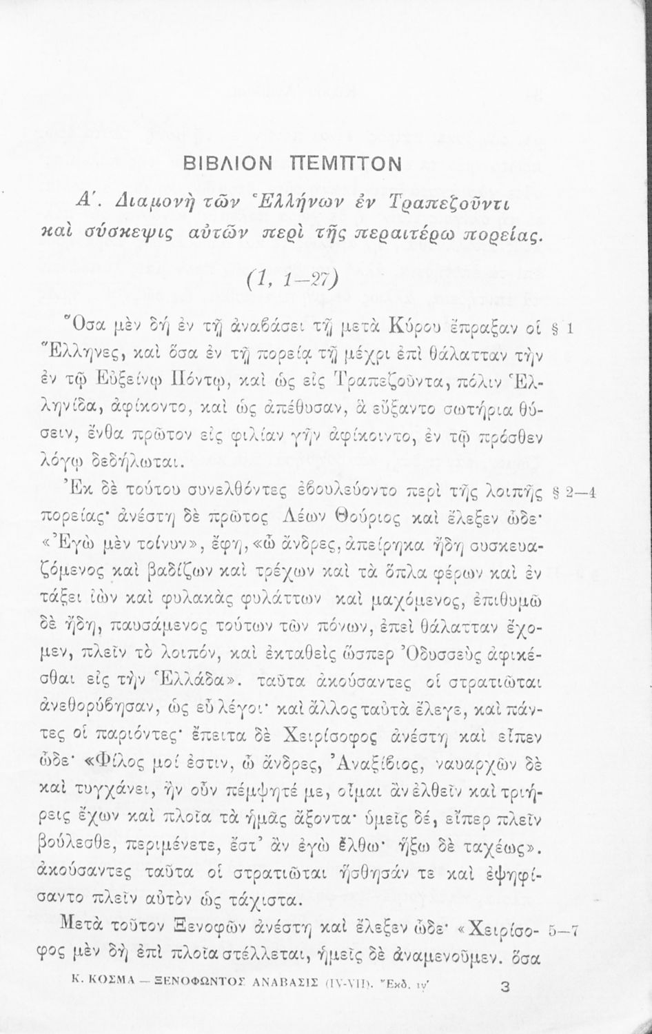 Σχολικό εγχειρίδιο Αρχαίων Ελληνικών για τις Γ΄ Ελληνικών Σχολείων και Α΄ Αστικών Σχολείων των Θηλέων που περιλαμβάνει το έργο του Ξενοφώντα Κύρου Ανάβασις, εισαγωγικά σχόλια για τη ζωή και το έργο του, ερμηνευτικές και γραμματικές παρατηρήσεις.