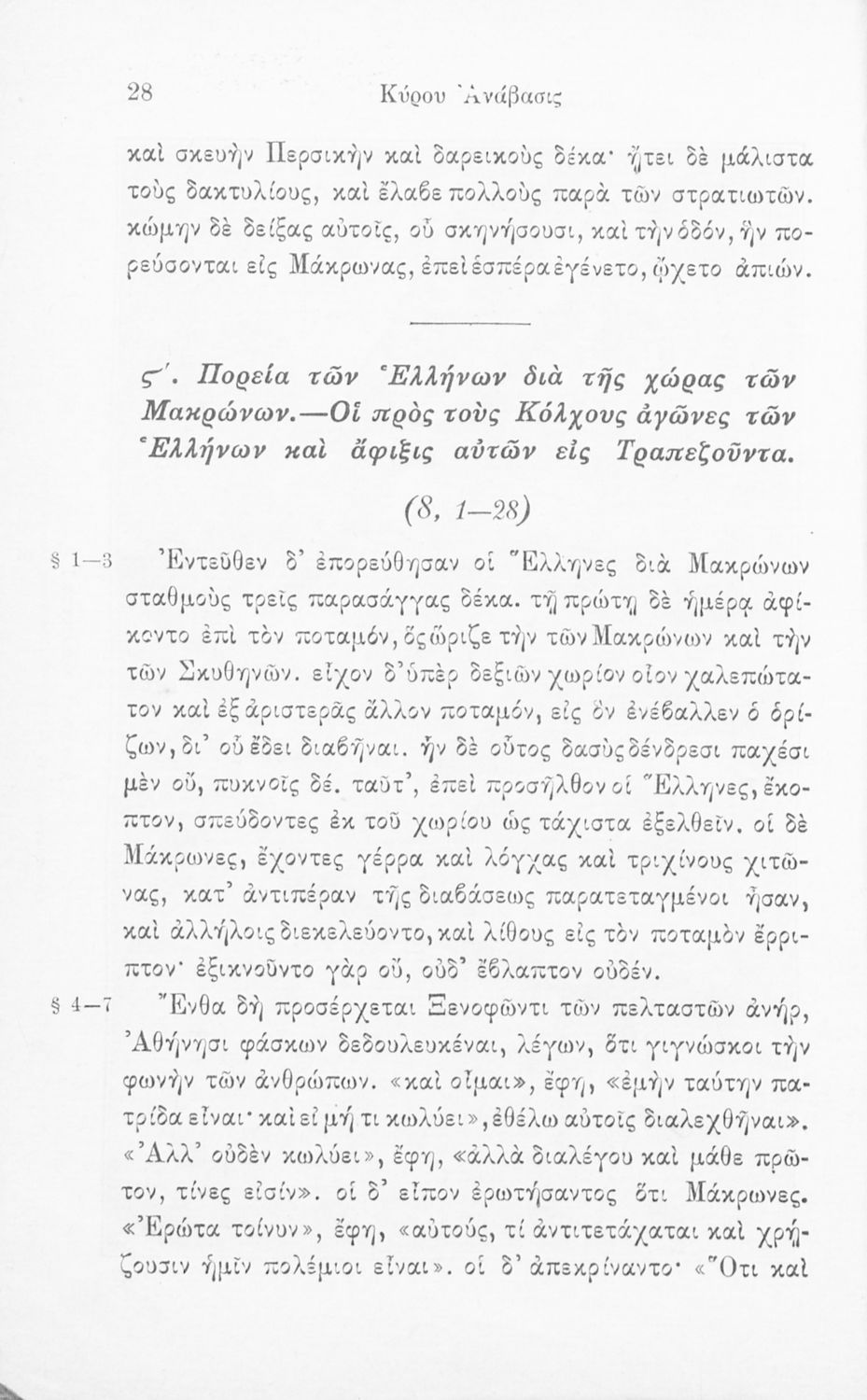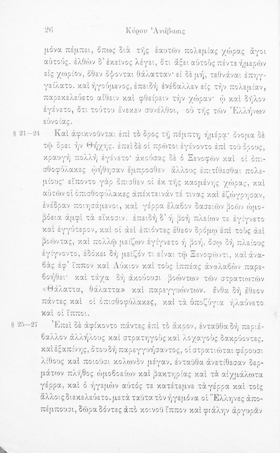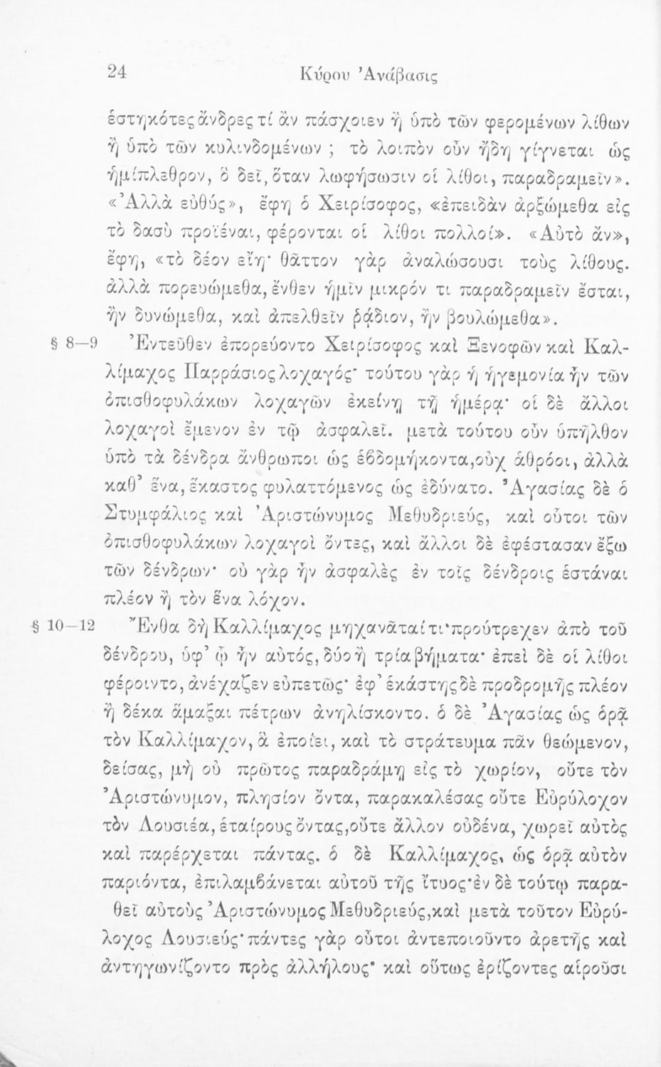 Σχολικό εγχειρίδιο της Γ' Ελληνικού Σχολείου και Αστικών Σχολείων για το μάθημα των Αρχαίων Ελληνικών. Το σύγγραμμα περιλαμβάνει κείμενα κατ΄ επιλογή από τα τέσσερα τελευταία βιβλία του έργου Κύρου Ανάβασις. ...